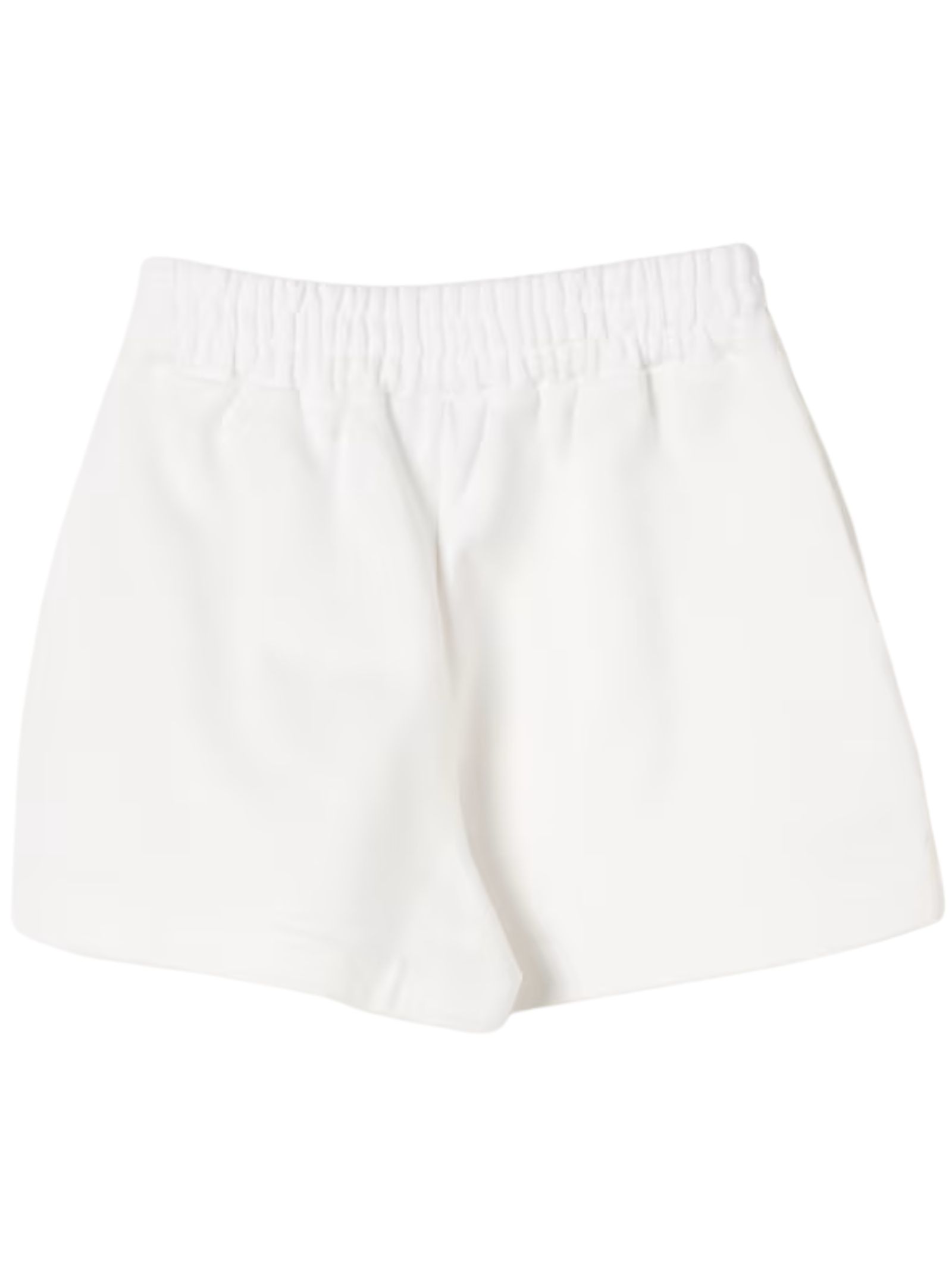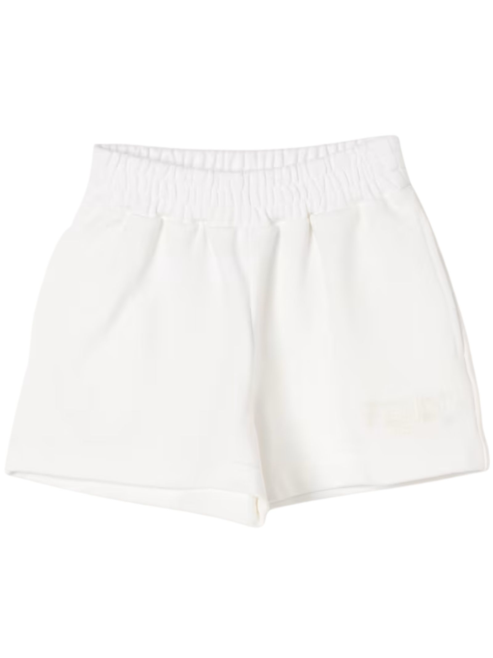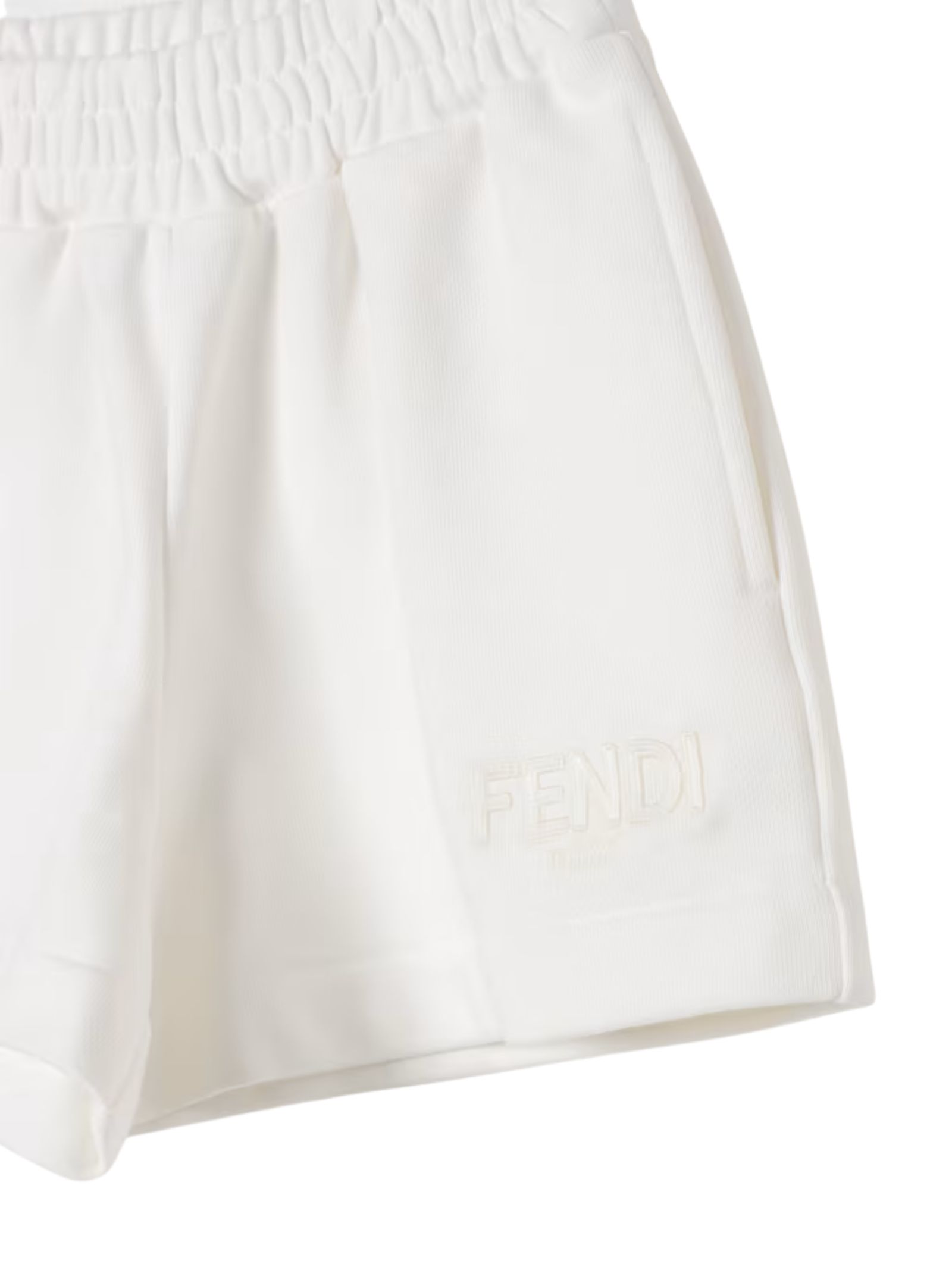 Fendi Kids shorts di colore bianco, modello con vita elasticizzata, due tasche laterali, ricamo logo su tinta, vestibilità regolare. Composizione: 100% cotone