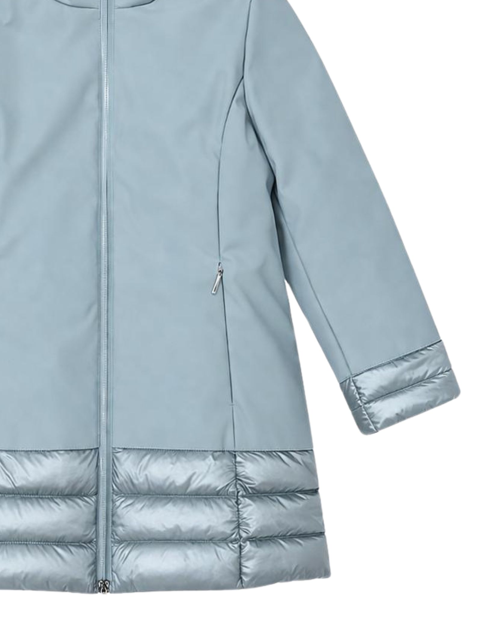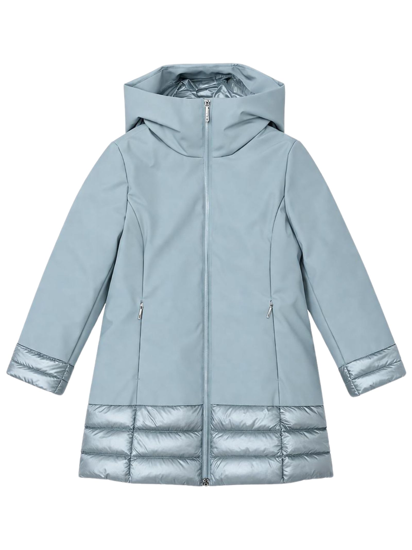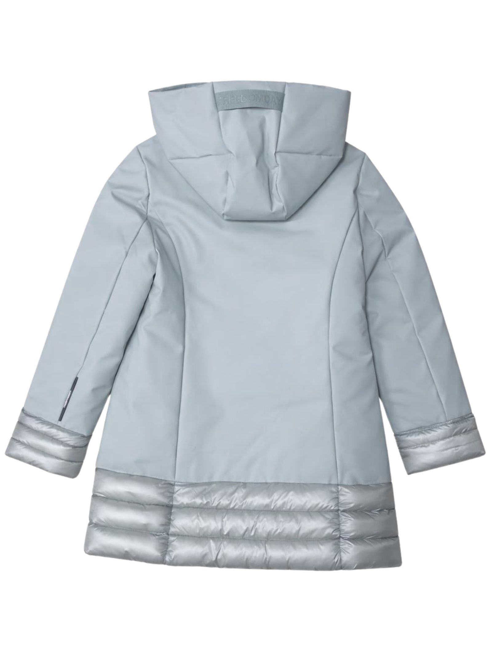 Freedomday Kids giubbino di colore verde pastello, modello con cappuccio e zip centrale, due tasche con zip, parti trapuntate e lucide realizzate in un pregiato nylon e brillante e parti lisce e opache realizzate in softshell, waterrepellent e windproof. Composizione: 100% Poliestere. Imbottitura: 100% Poliestere