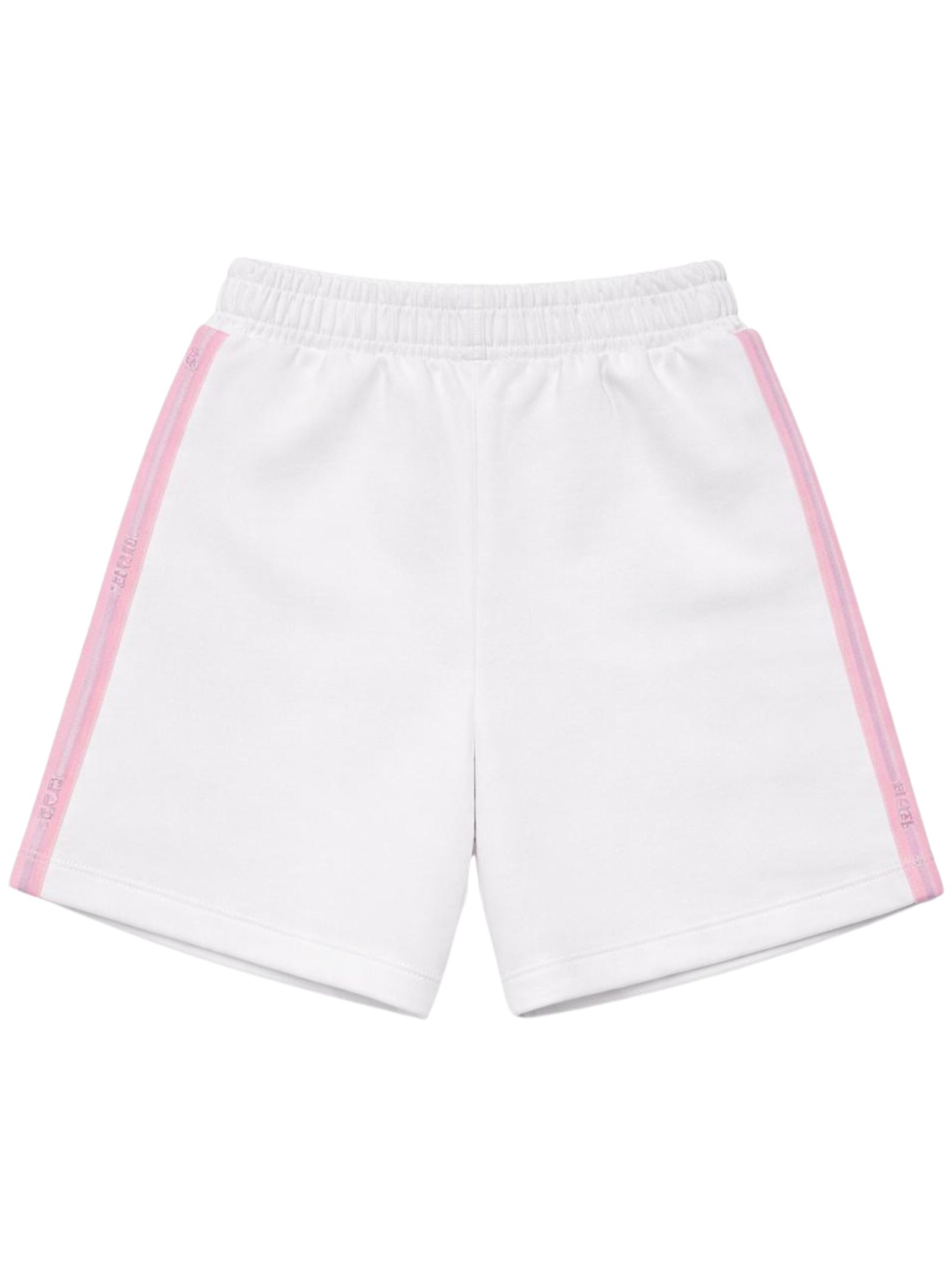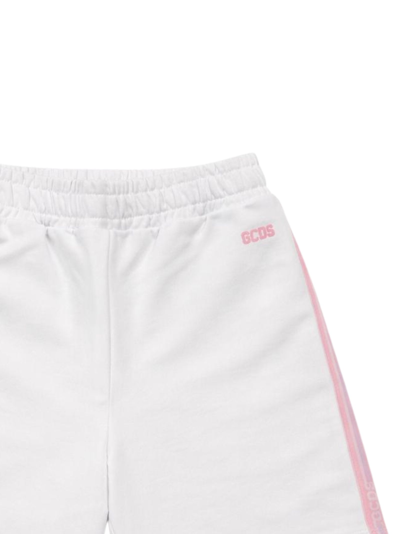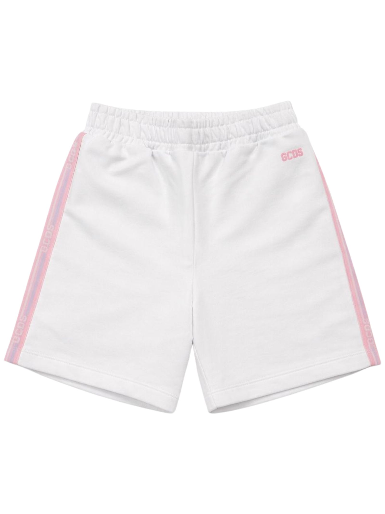 GCDS Kids shorts di colore bianco, modello con vita elasticizzata, caratterizzati da bande laterali con logo, stampa logo, vestibilità regolare. Composizione: 100% cotone. Made in Italy