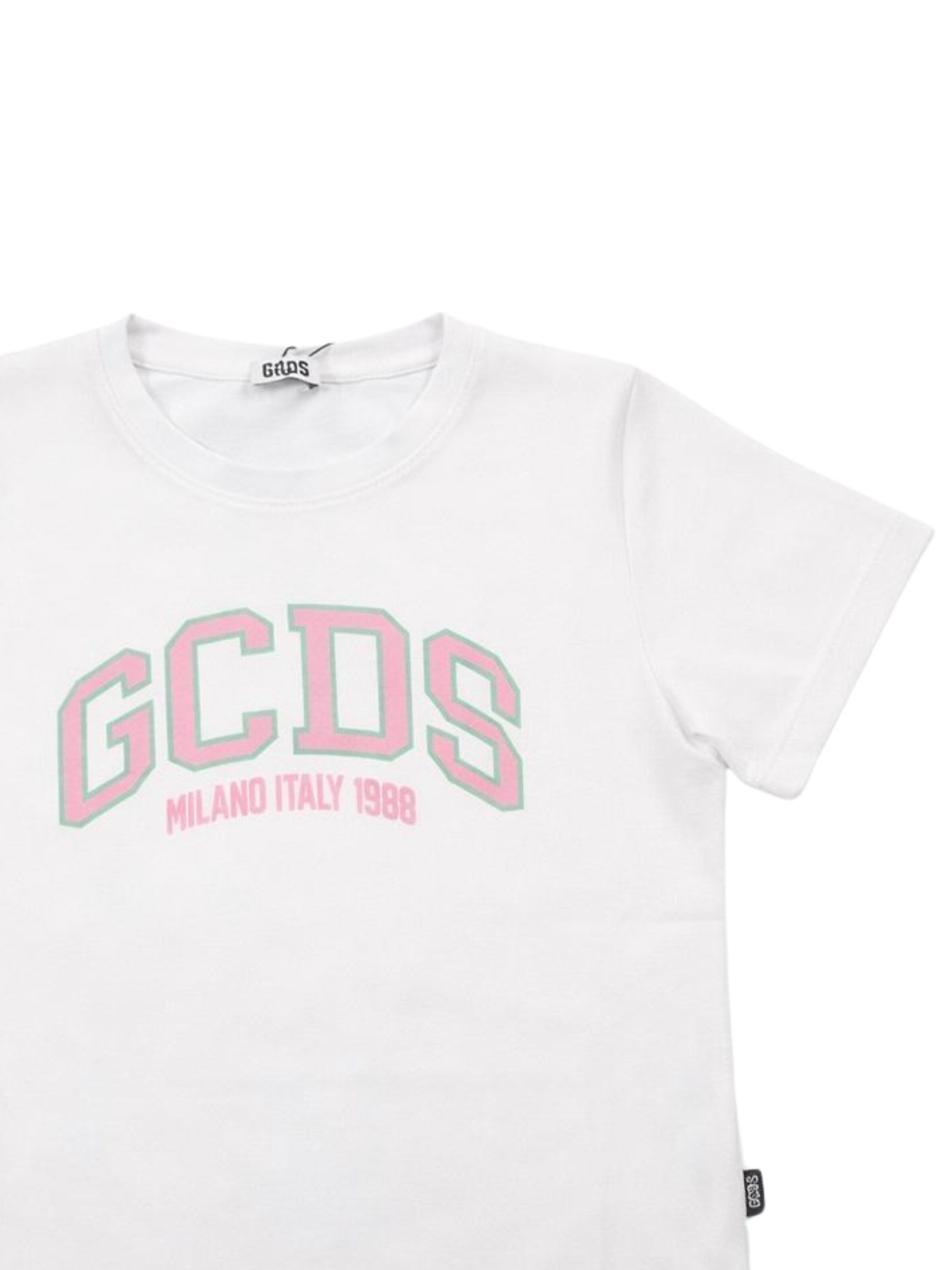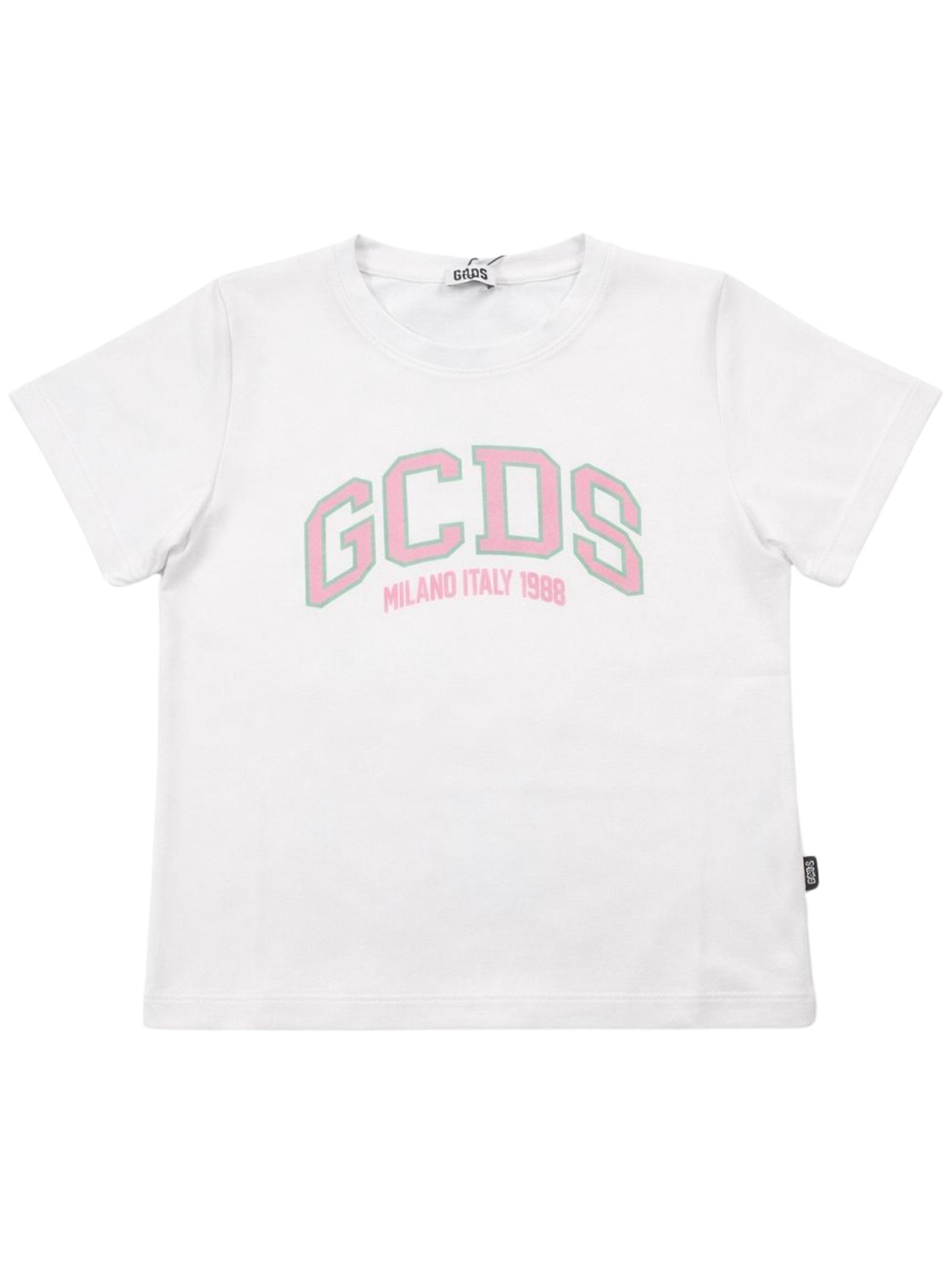GCDS Kids t-shirt di colore bianco, stampa logo a contrasto rosa, design girocollo, mezze maniche, vestibilità regolare. Composizione: 95% cotone 5% elastan. Made in Italy