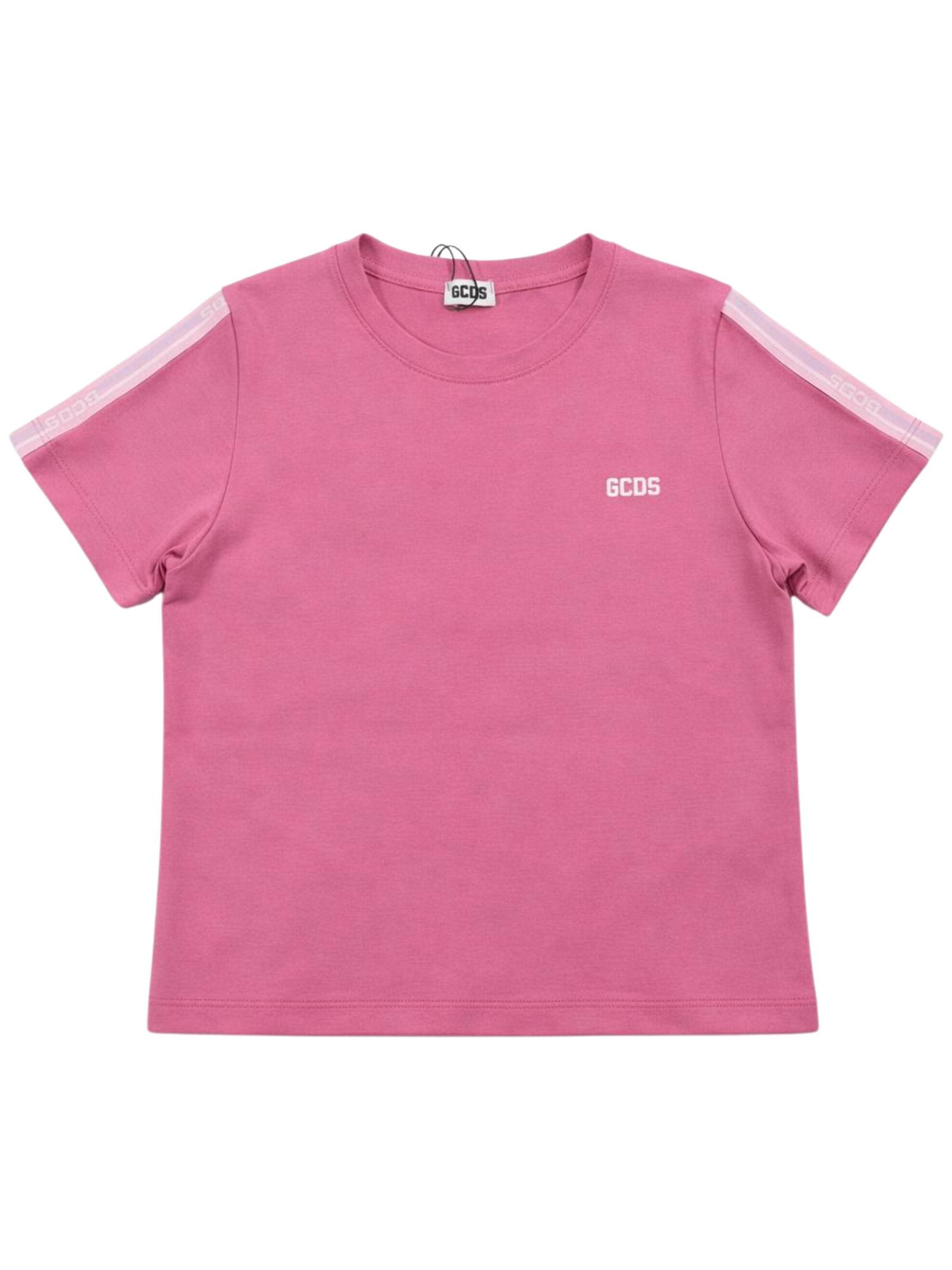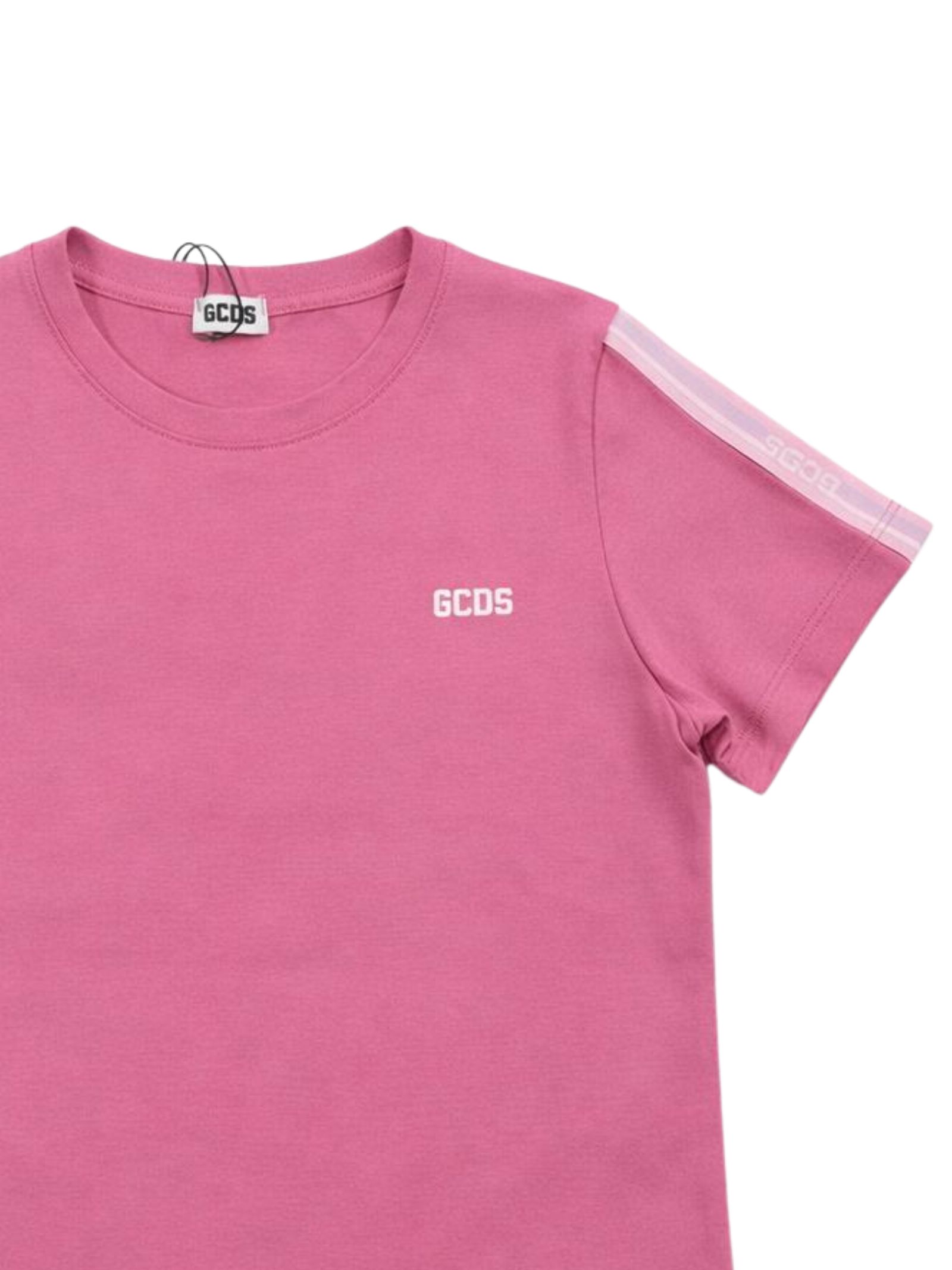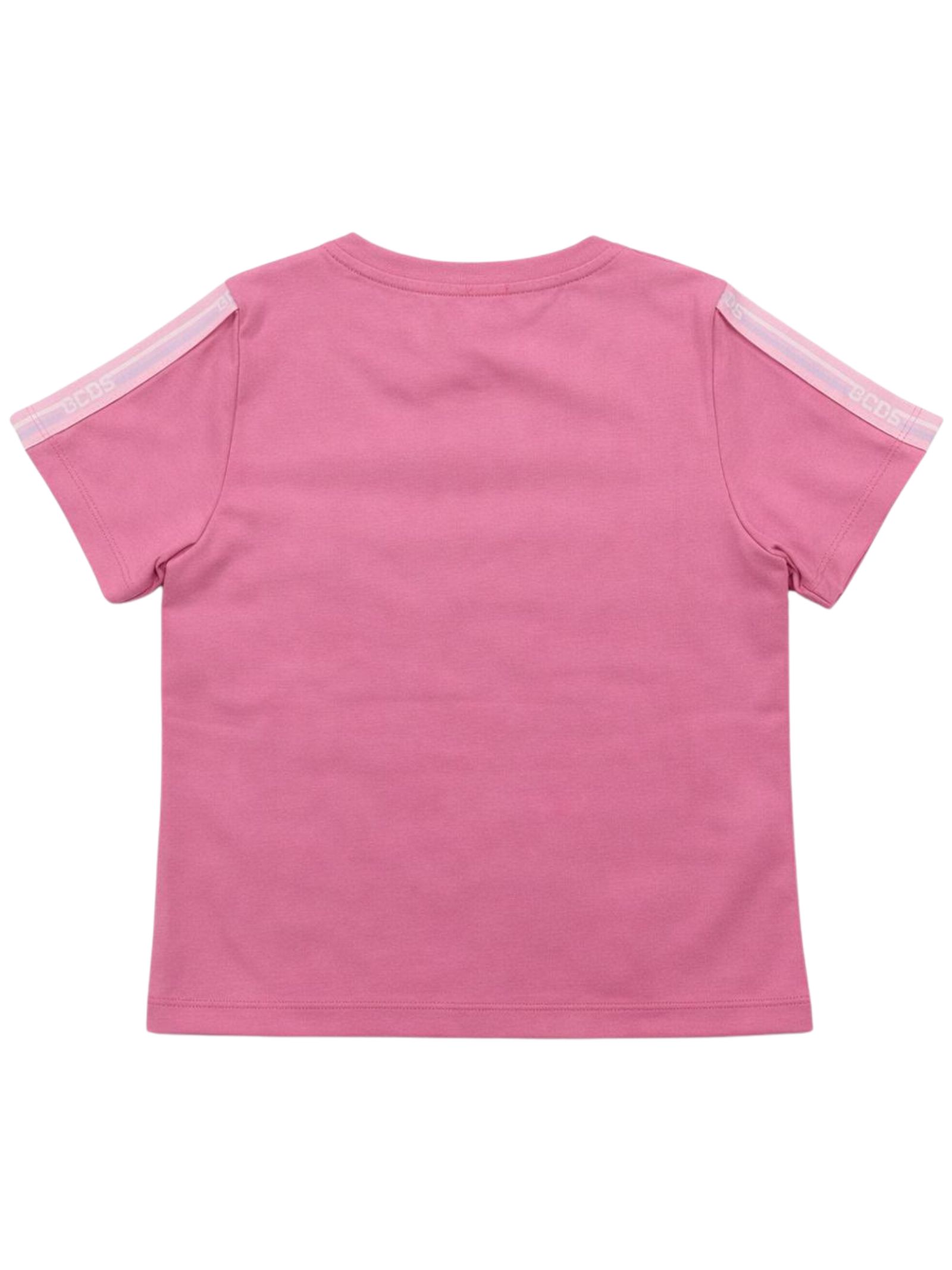 GCDS Kids t-shirt di colore rosa, stampa logo a contrasto, design girocollo, mezze maniche, bande laterali con logo, vestibilità regolare. Composizione: 95% cotone 5% elastan. Made in Italy