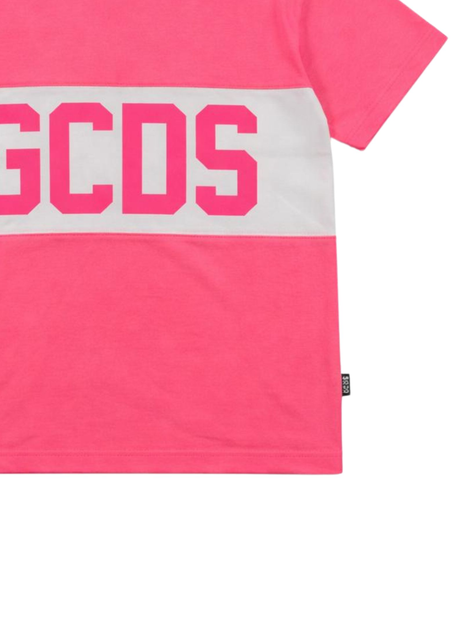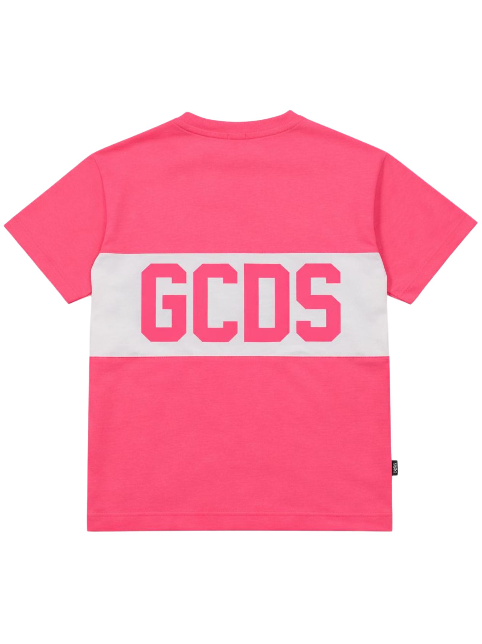 GCDS Kids t-shirt di colore fucsia fluo, inserto a contrasto bianco con logo su entrambi i lati, design girocollo, mezze maniche, vestibilità regolare. Composizione: 65% poliestere 30% cotone 5% elastan. Made in Italy