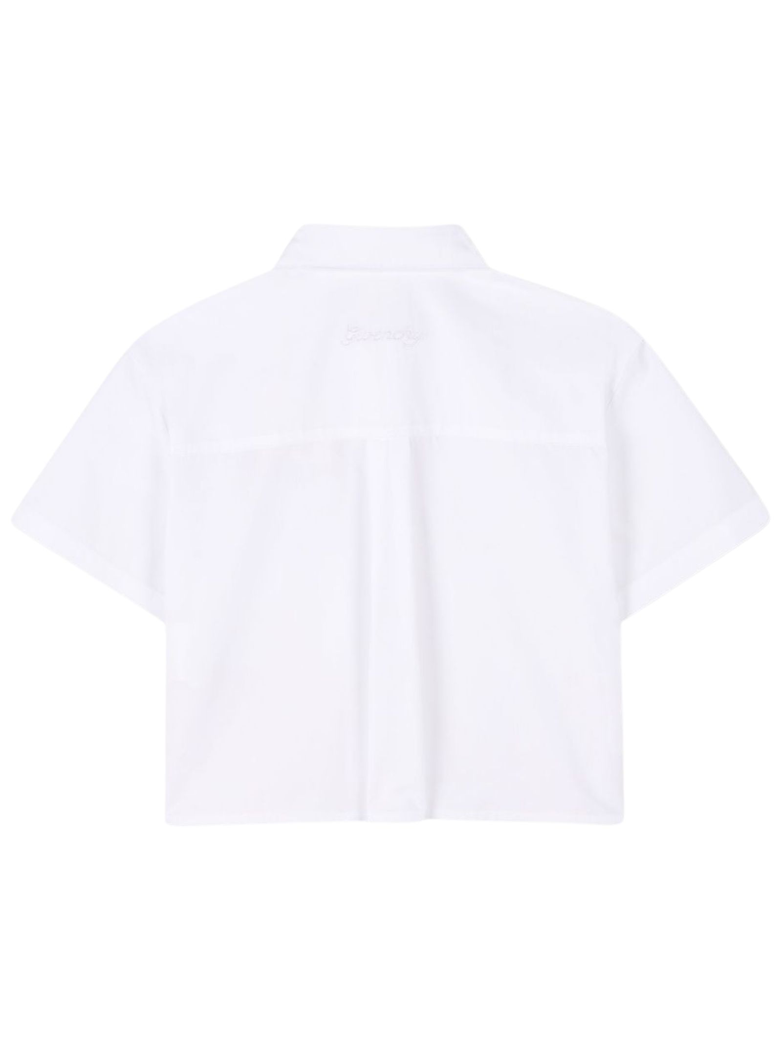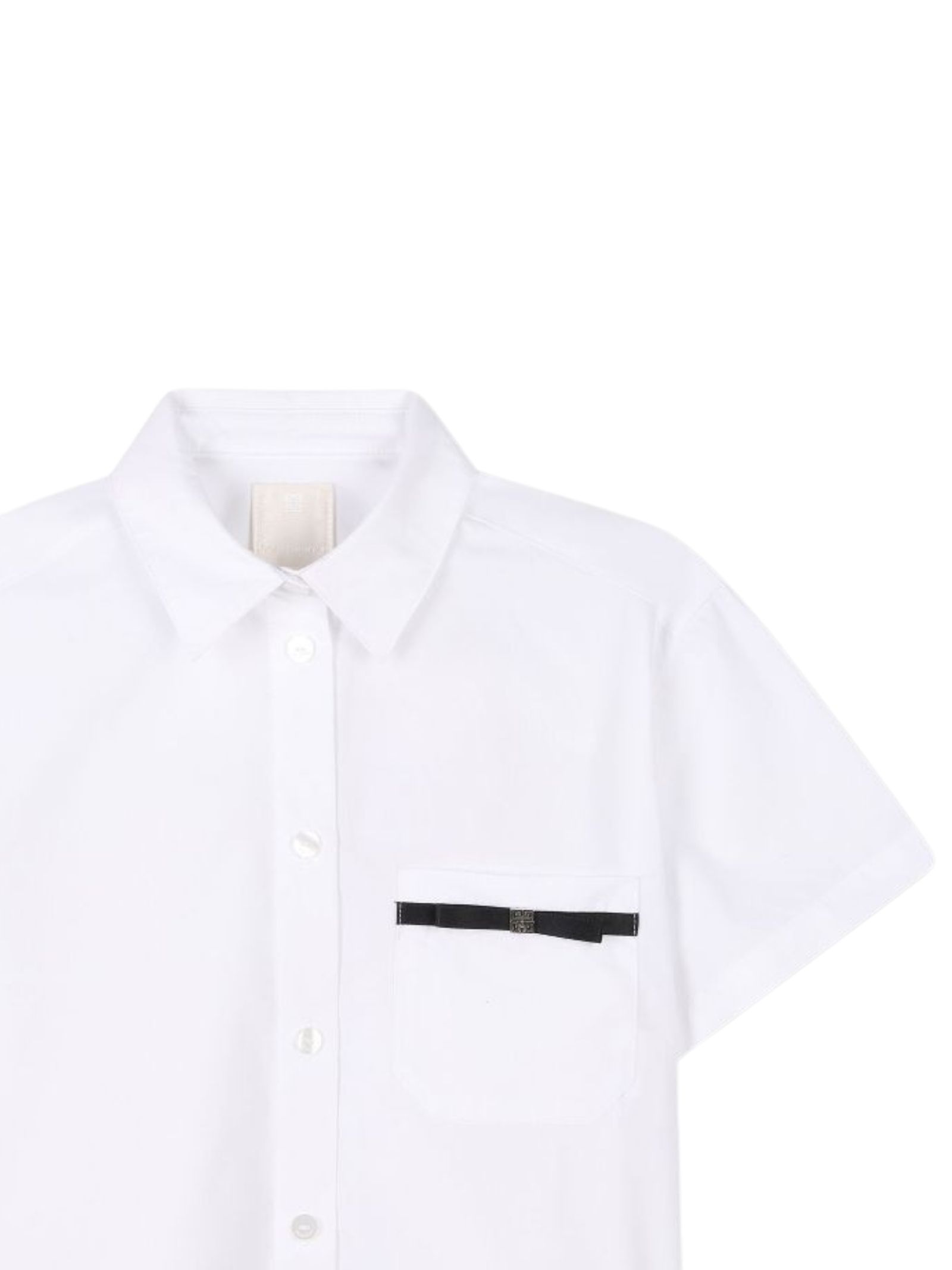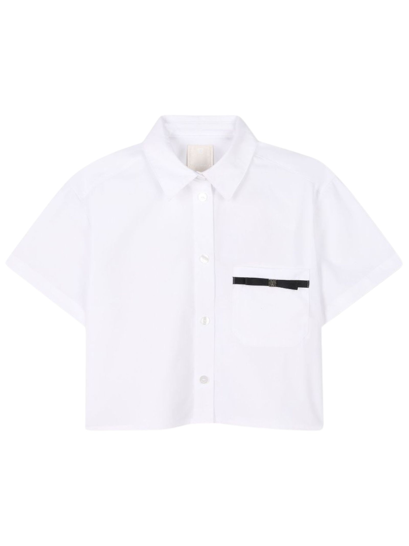 Givenchy Kids camicia di colore bianco, tessuto in popeline, modello cropped, placca con logo 4G, chiusura frontale con bottoni, colletto classico, maniche corte, tasca applicata sul petto, fiocco in raso, orlo dritto. Composizione: 100% cotone