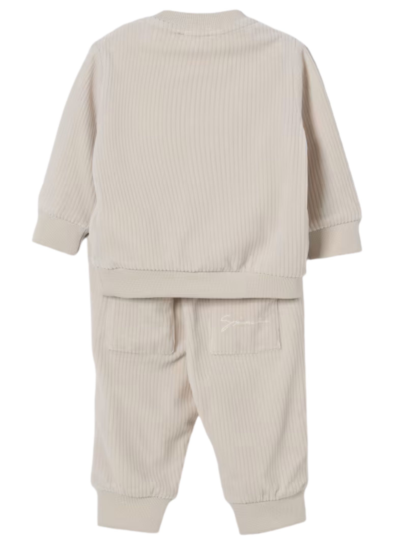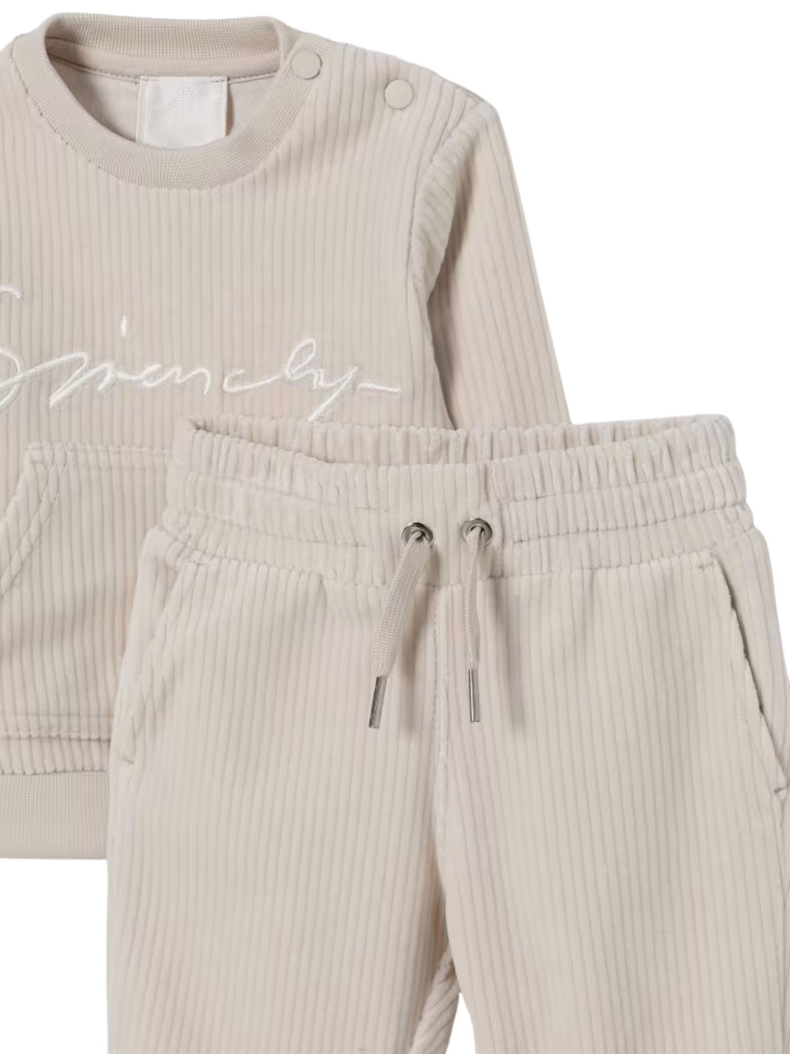 Givenchy Kids completo di colore beige, realizzato in morbido velluto a costine, composto da felpa girocollo, maniche lunghe, due tasche, orlo e polsi a costine, decorata con logo ricamato, pantaloni abbinati con elastico in vita e coulisse. Composizione: 77% Cotone 20% poliestere 3% elastan