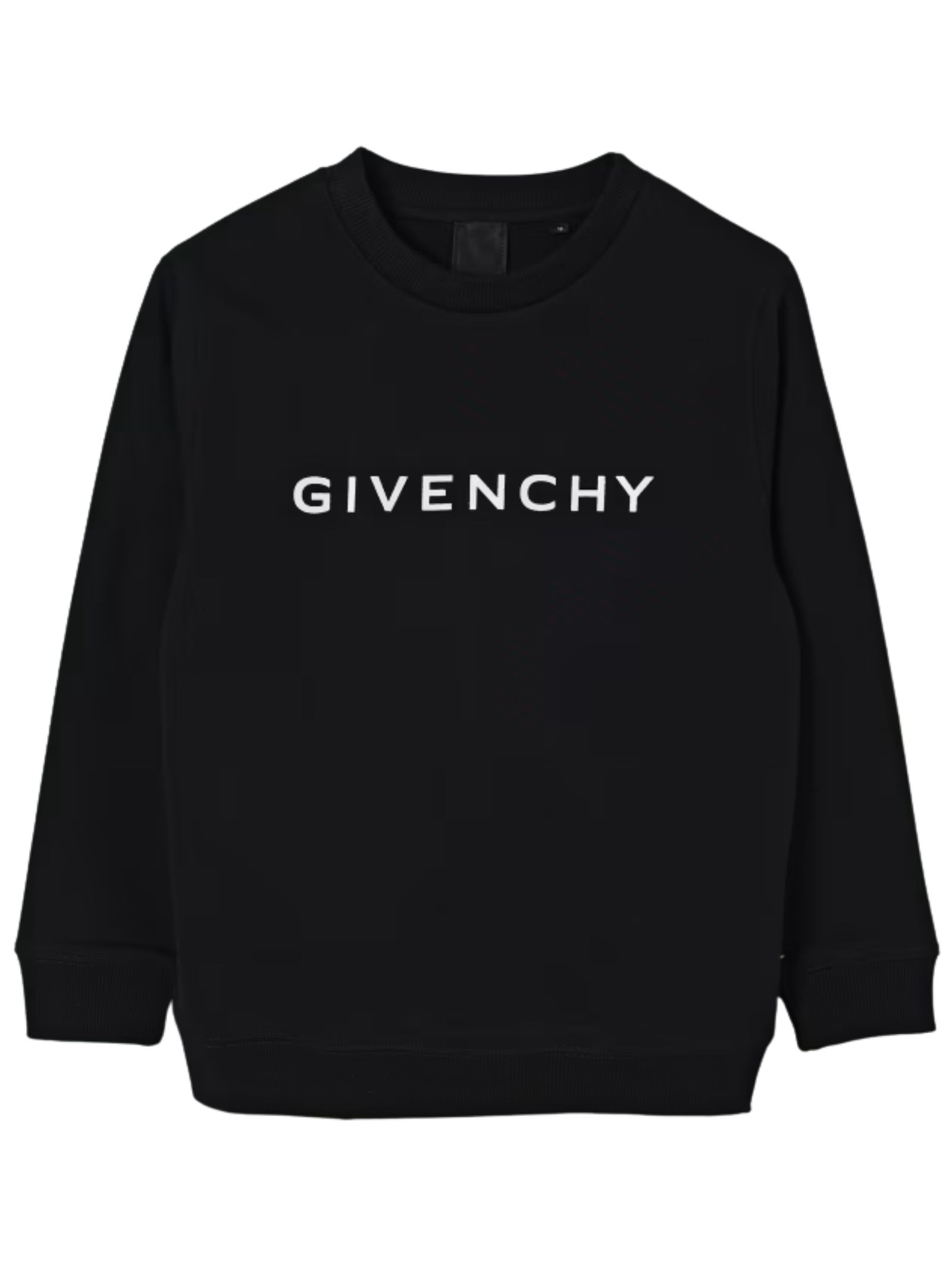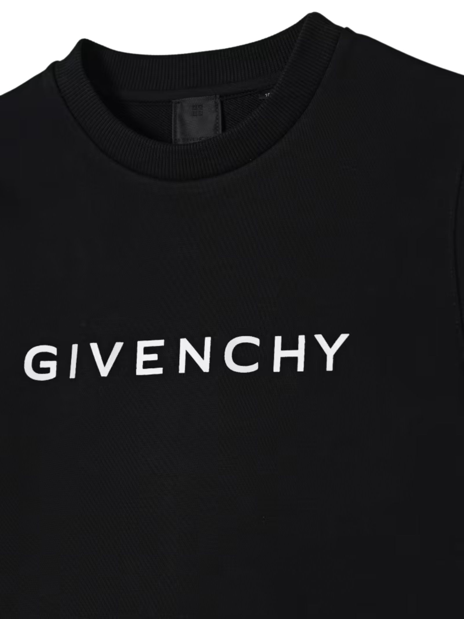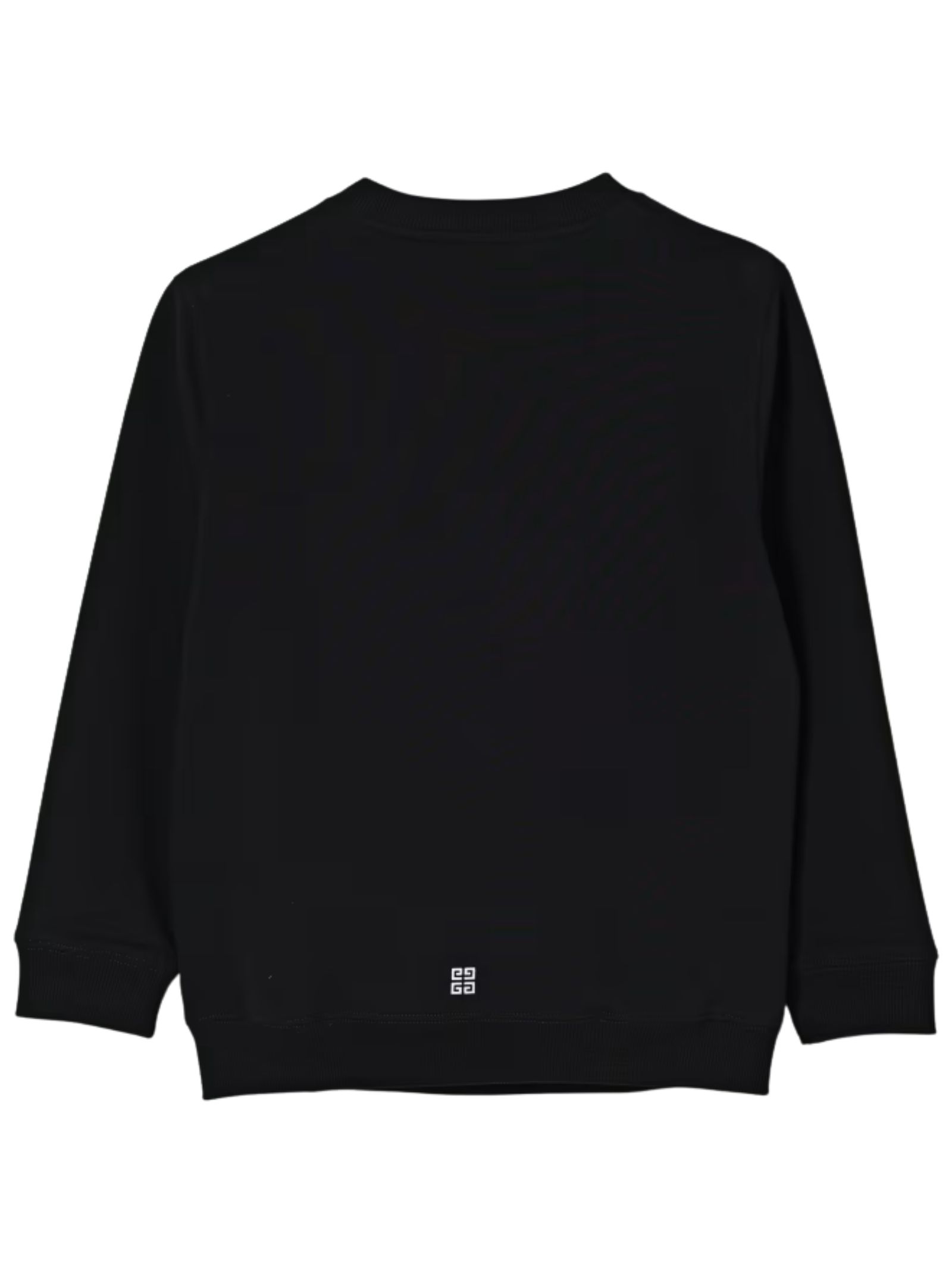 Givenchy Kids felpa di colore nero, modello girocollo, maniche lunghe, stampa logo centrale a contrasto, orli a costine, design corto. Composizione: 85% cotone 15% poliestere
