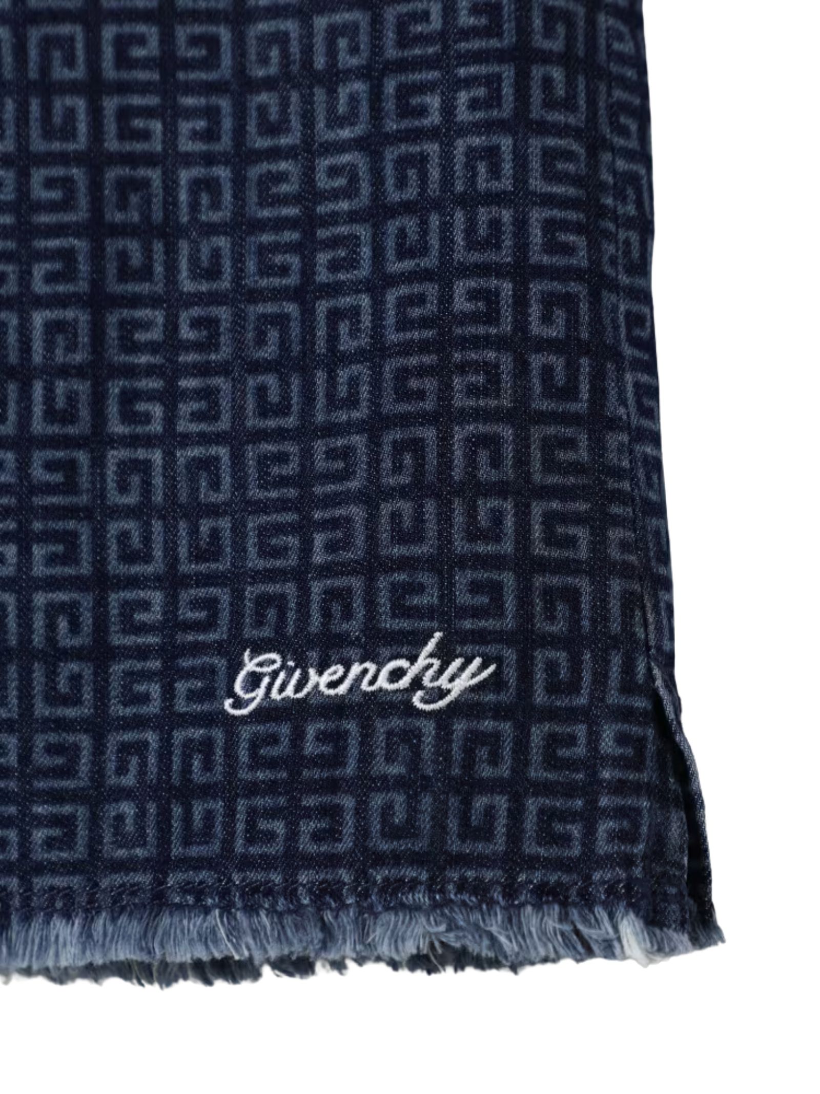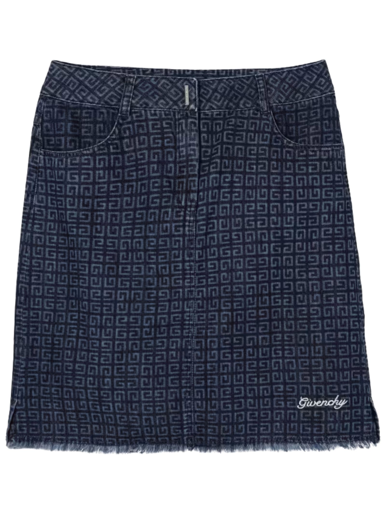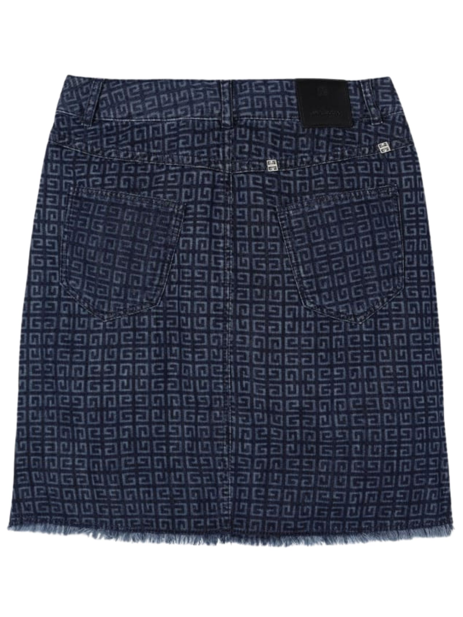 Givenchy Kids gonna in denim azzurro, lavaggio medio, caratteristico motivo 4G all-over, chiusura frontale nascosta, passanti, design a 4 tasche, spacchetti laterali, orlo sfrangiato. Composizione: 100% cotone