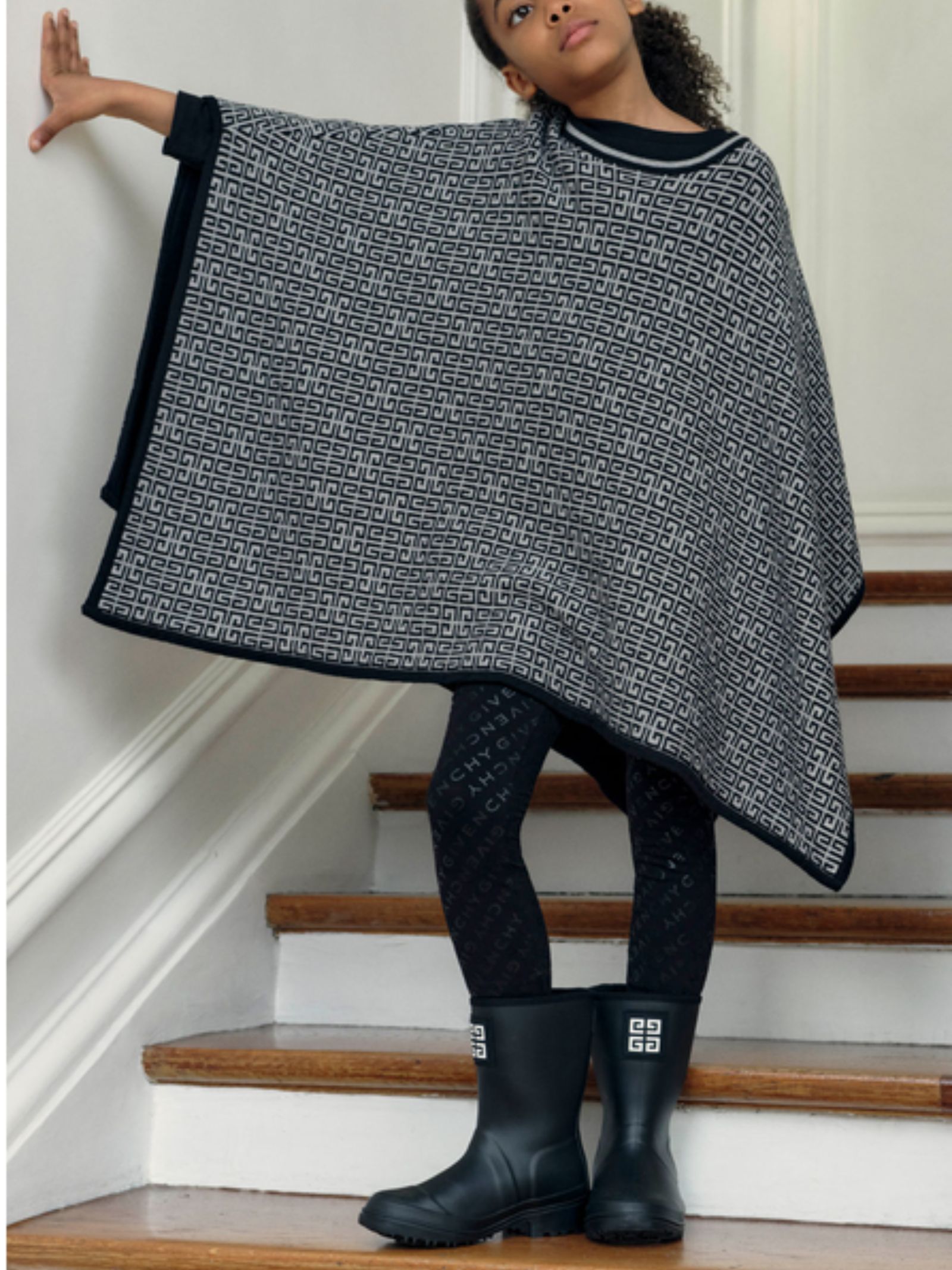 Givenchy Kids mantella reversibile ispirata alla collezione per adulti, lato di colore nero con un logo lavorato a maglia sul petto e un altro lato di colore grigio in una stampa 4G all-over, design girocollo, realizzato in una miscela ricca di cotone con cashmere.