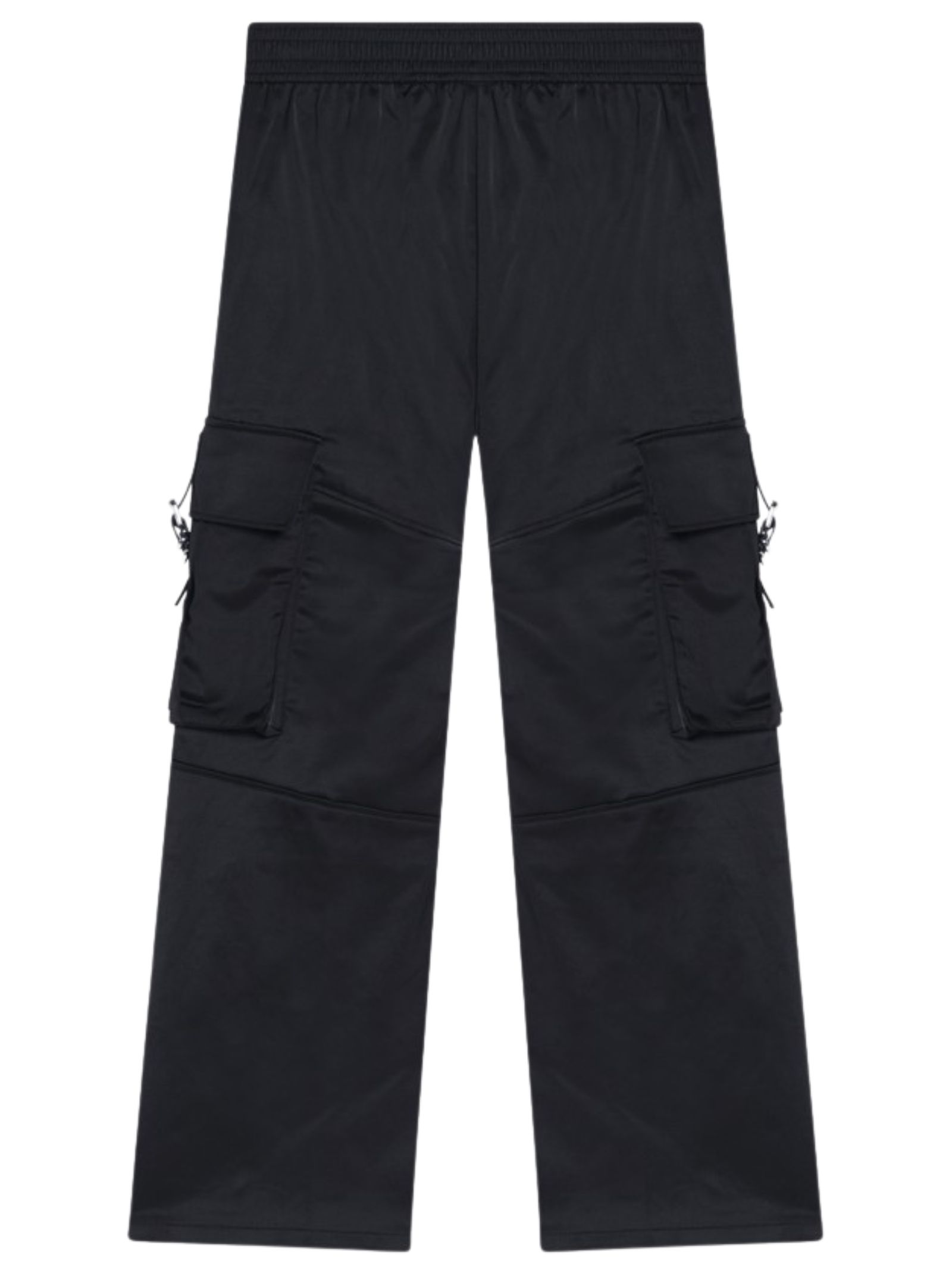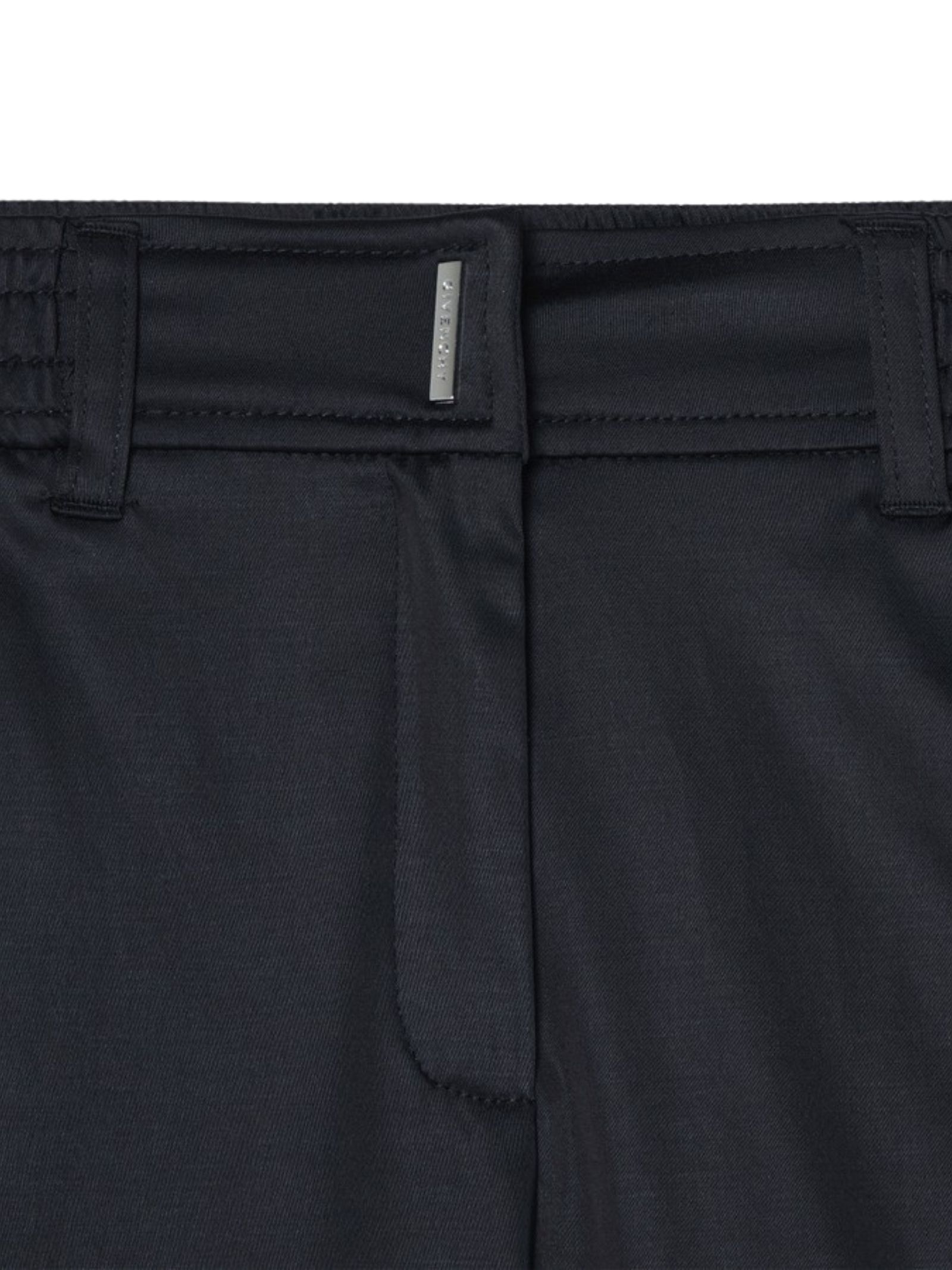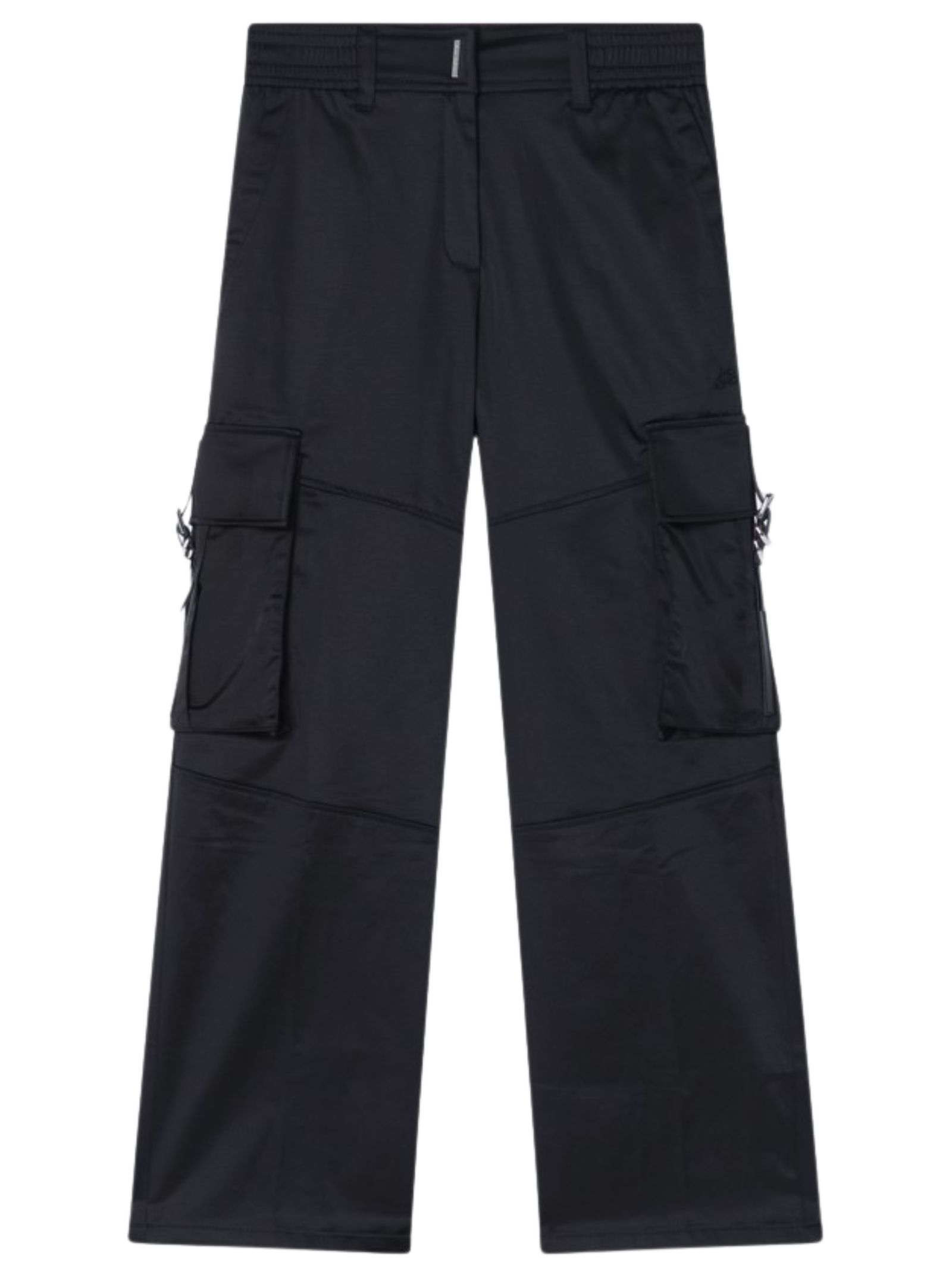 Givenchy Kids pantaloni di colore nero, realizzati in un tessuto di misto cotone effetto raso, design con elastico in vita, bottone e zip, due tasconi laterali con fibbie, ricamo logo, gamba leggermente svasata. Composizione: 58% poliestere 39% cotone 3% elastan