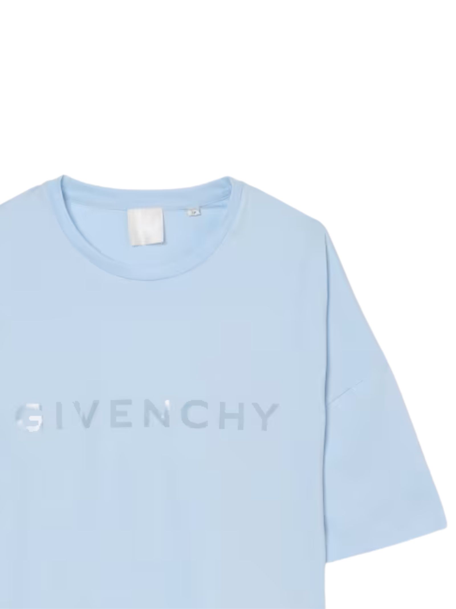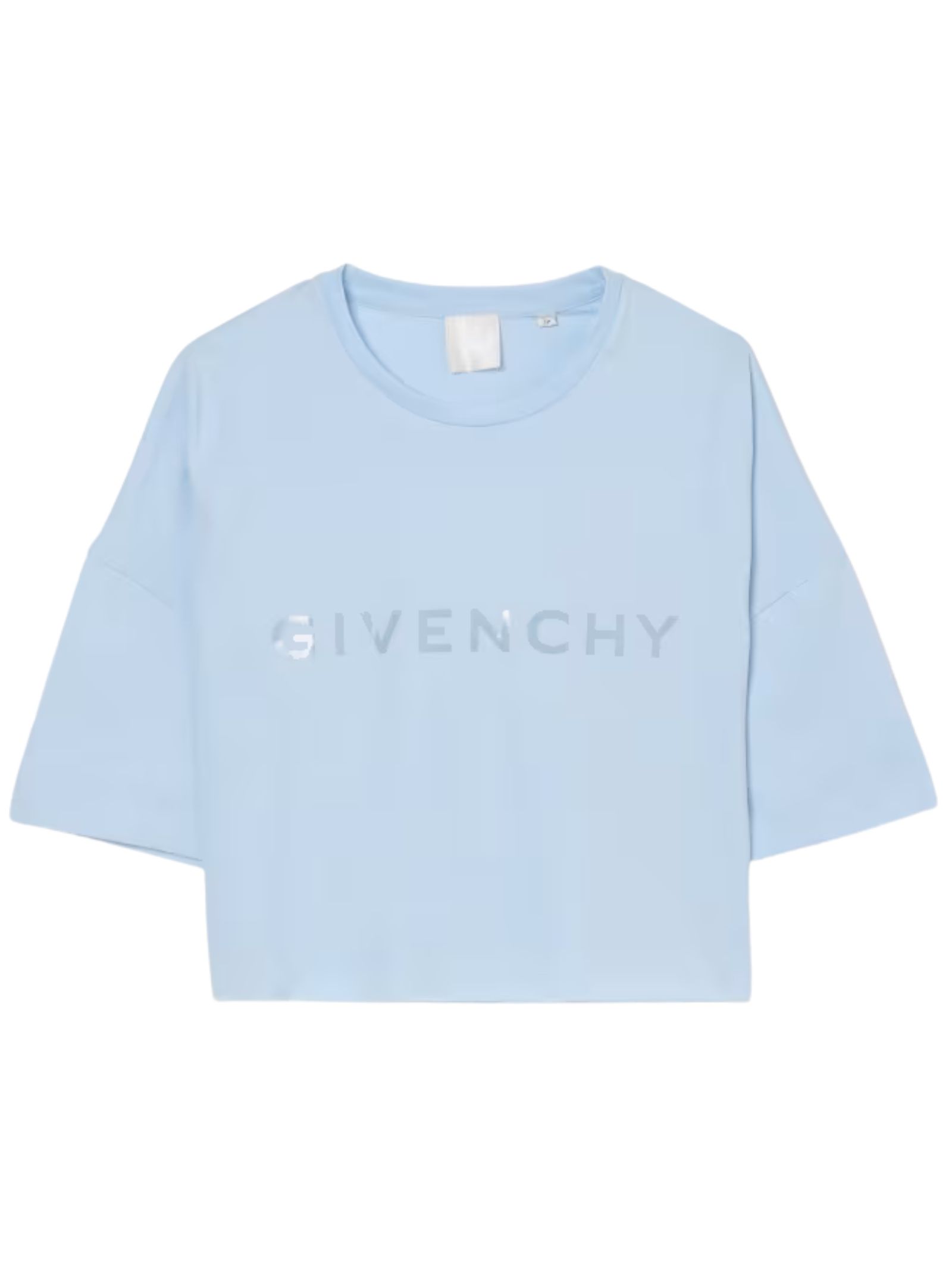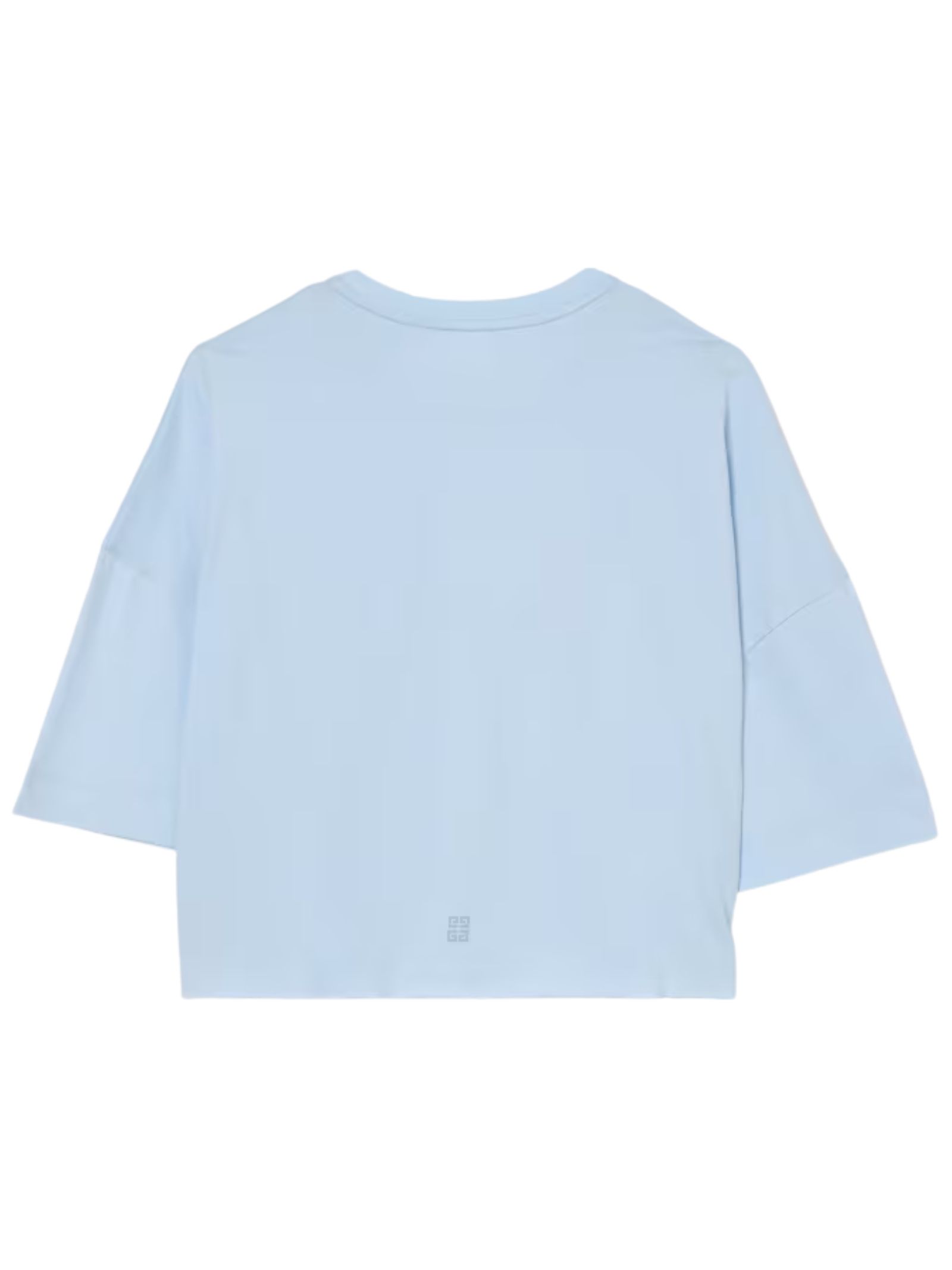 Givenchy Kids t-shirt di colore azzurro, modello cropped, girocollo, mezza manica, stampa logo centrale su tinta, orlo dritto a taglio vivo, vestibilità ampia. Composizione: 100% cotone