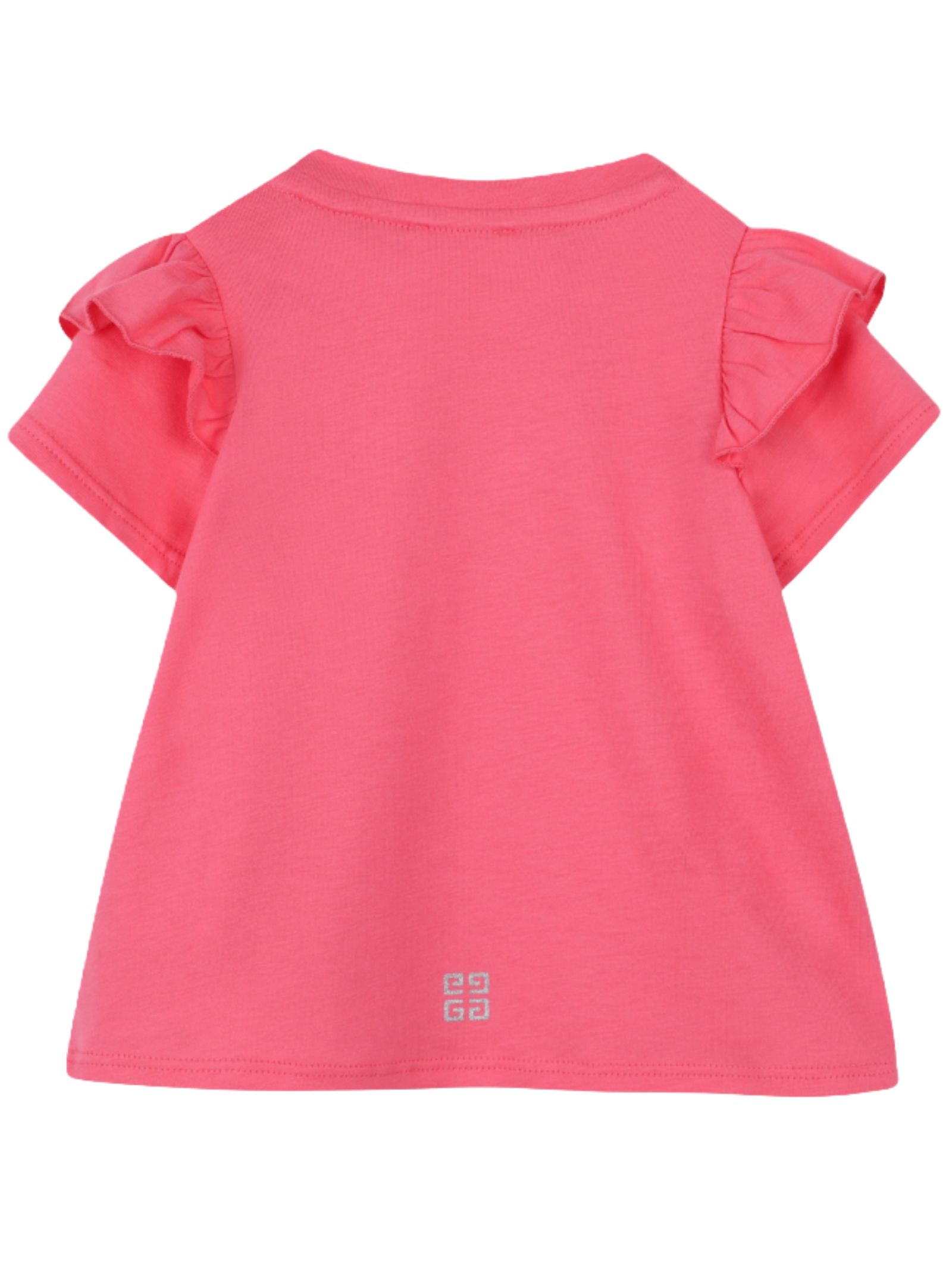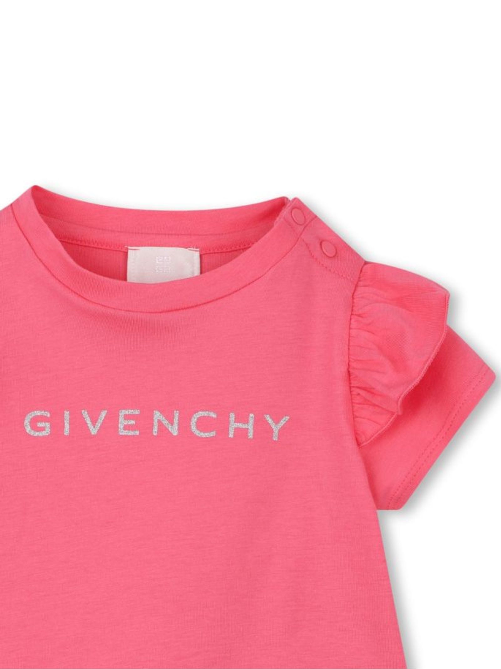 Givenchy Kids t-shirt di colore rosa, modello girocollo, mezza manica con volant, stampa logo centrale glitter, apertura con bottoni a clip sulla spalla, vestibilità regolare. Composizione: 100% cotone