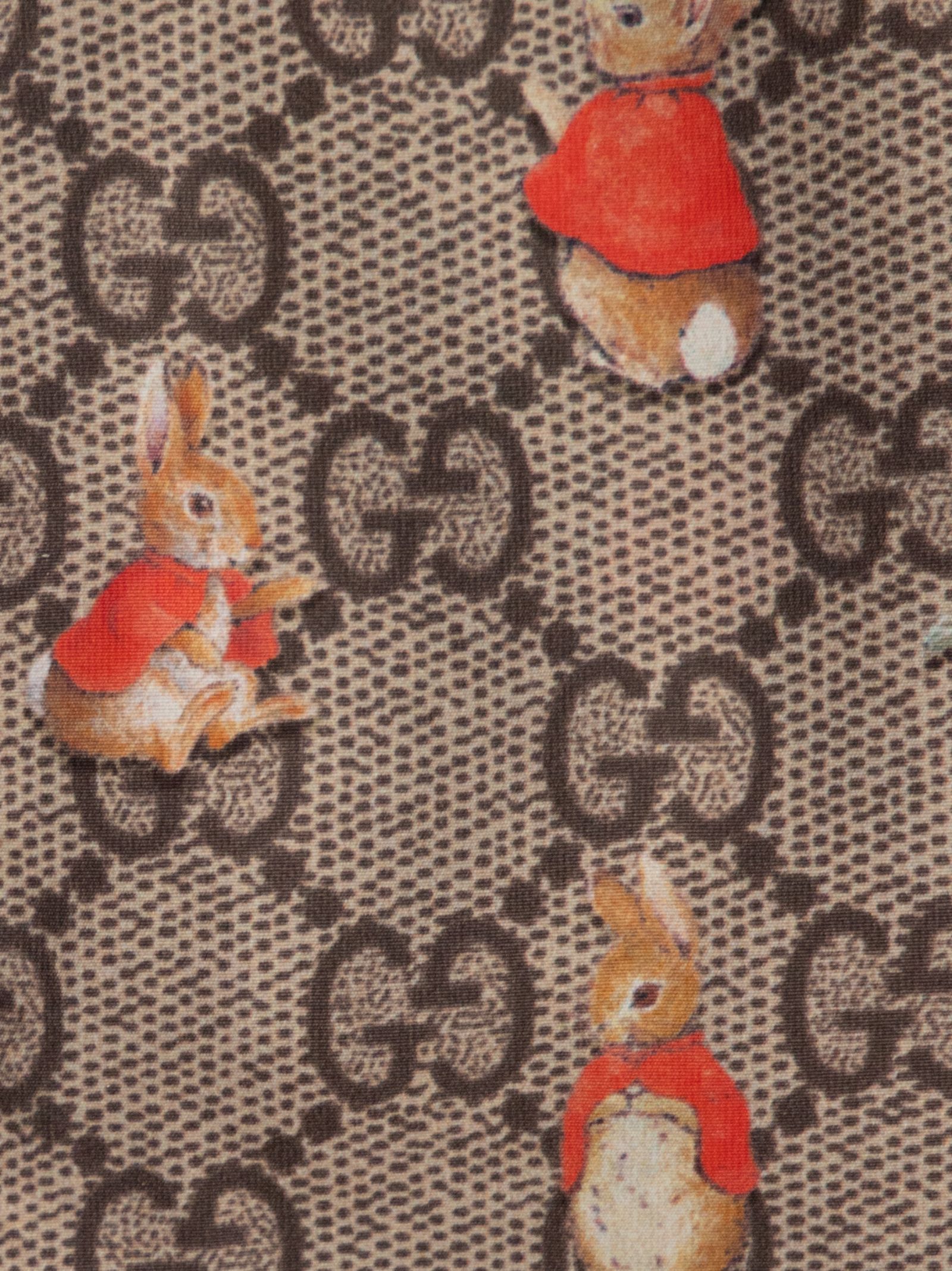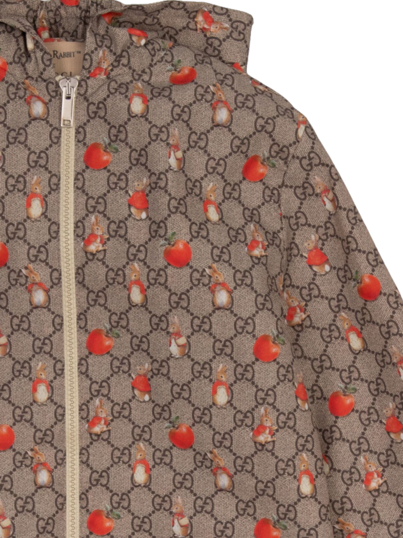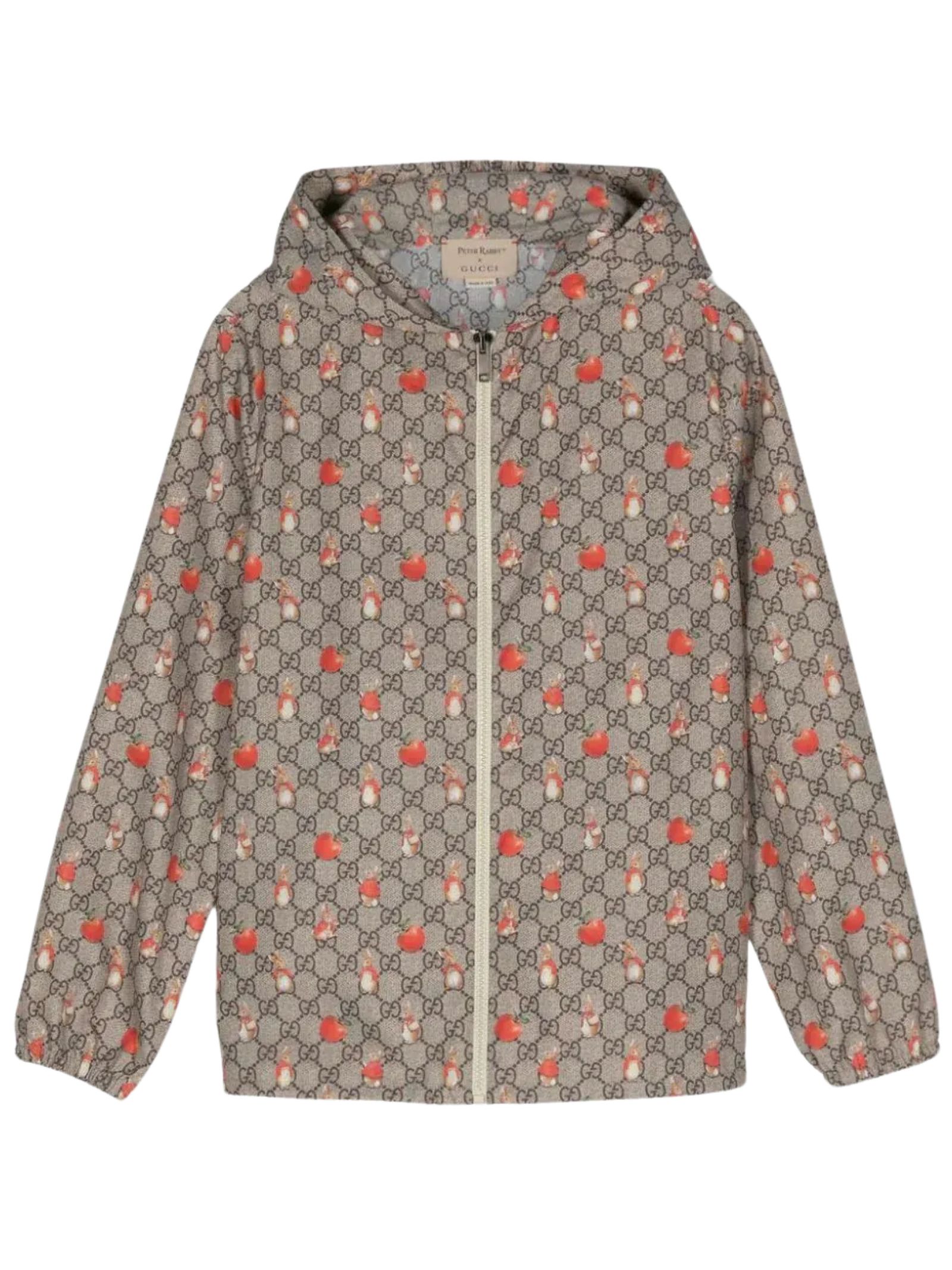 Gucci Kids giubbino di colore beige, motivo monogramma, stampa a contrasto di Peter RabbitTM, design con cappuccio, due tasche scorrevoli e finiture elastiche. Composizione: 100% poliammide. Made in Italy