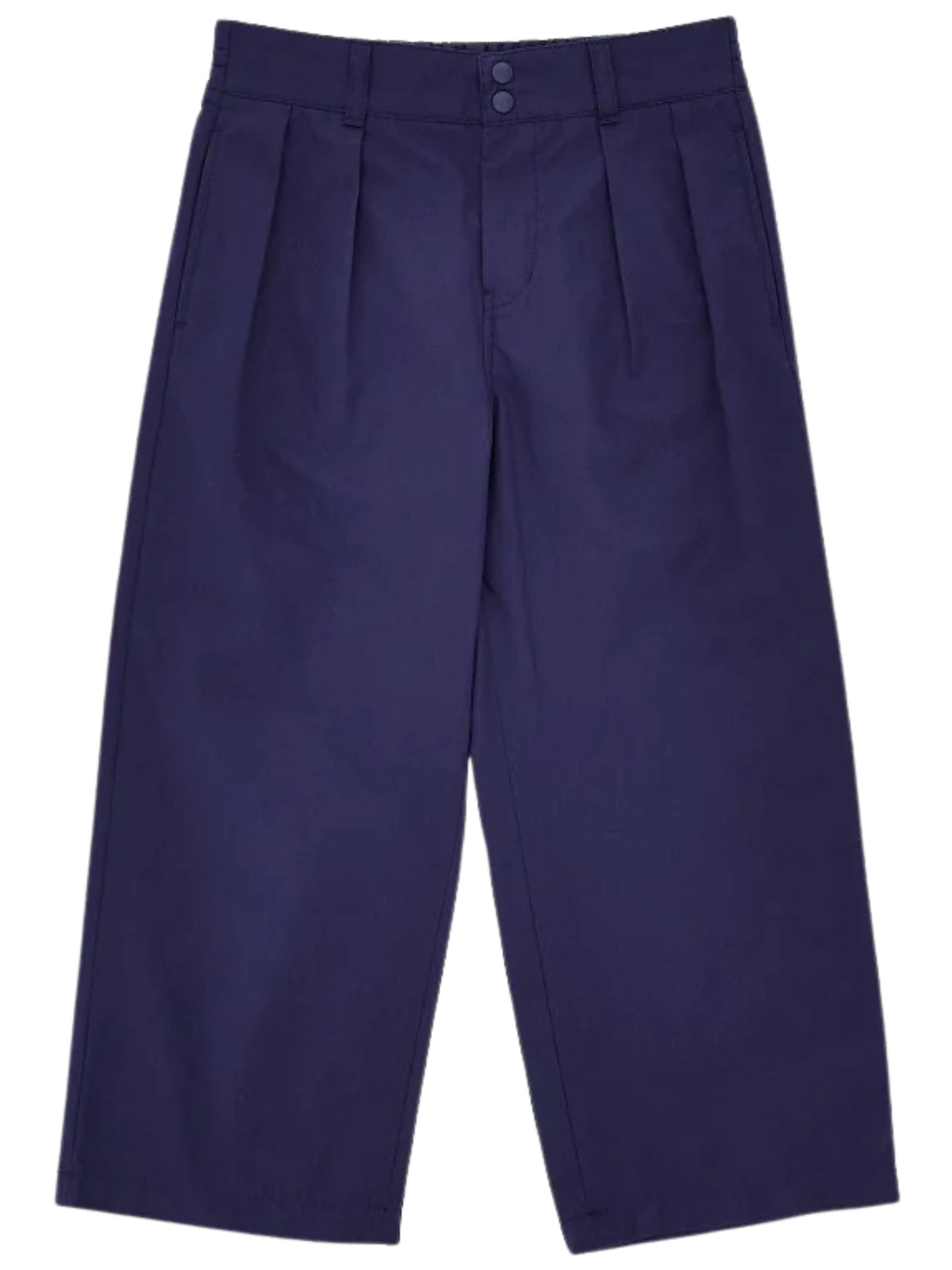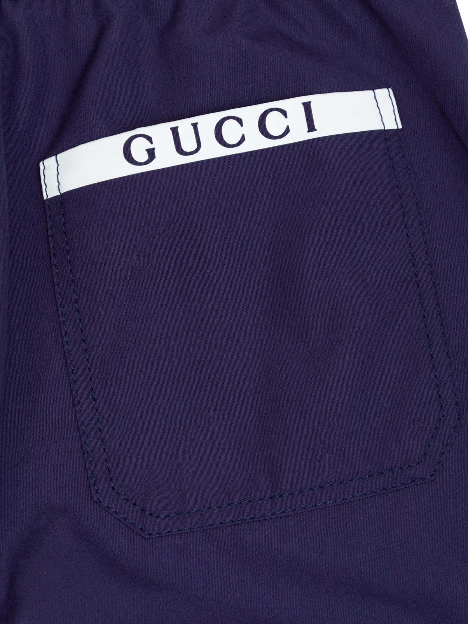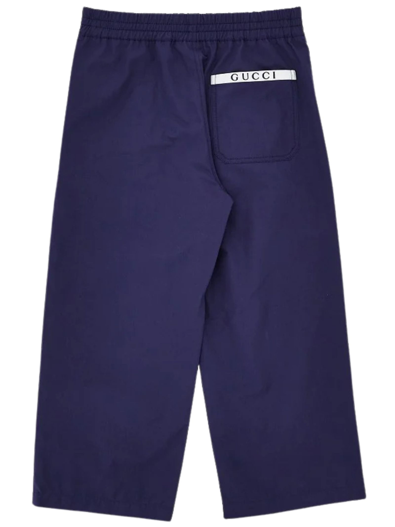 Gucci Kids pantalone di colore blu realizzato in leggero popeline di puro cotone, caratterizzato dalla gamba dritta e ampia con doppia pince sul davanti, passanti per cintura, vita elasticizzata sul retro, patta e chiusura con bottoni a pressione, tasche laterali a filetto e una a toppa sul retro con stampa logo gommata. Composizione: 100% Cotone. Made in Italy