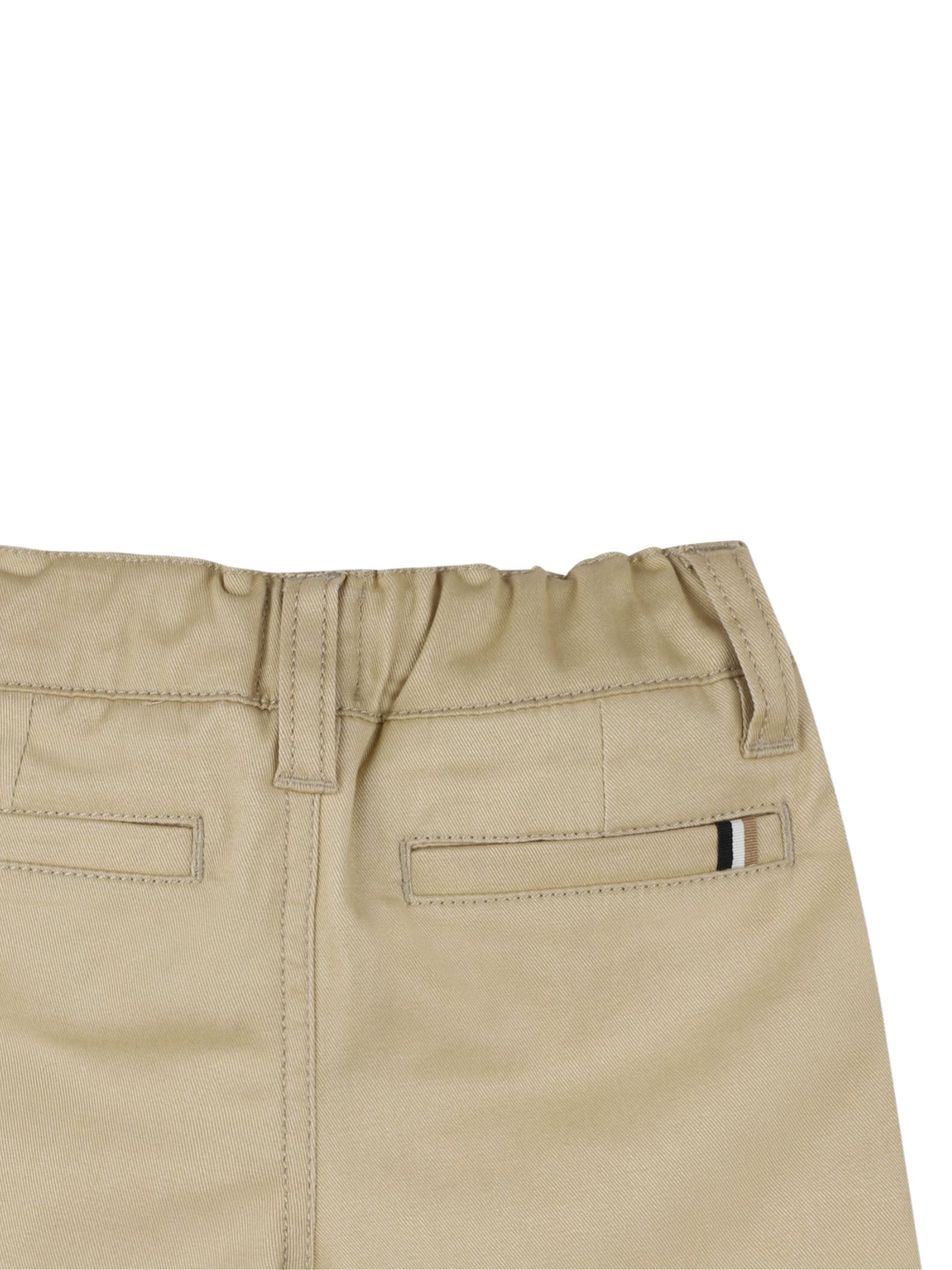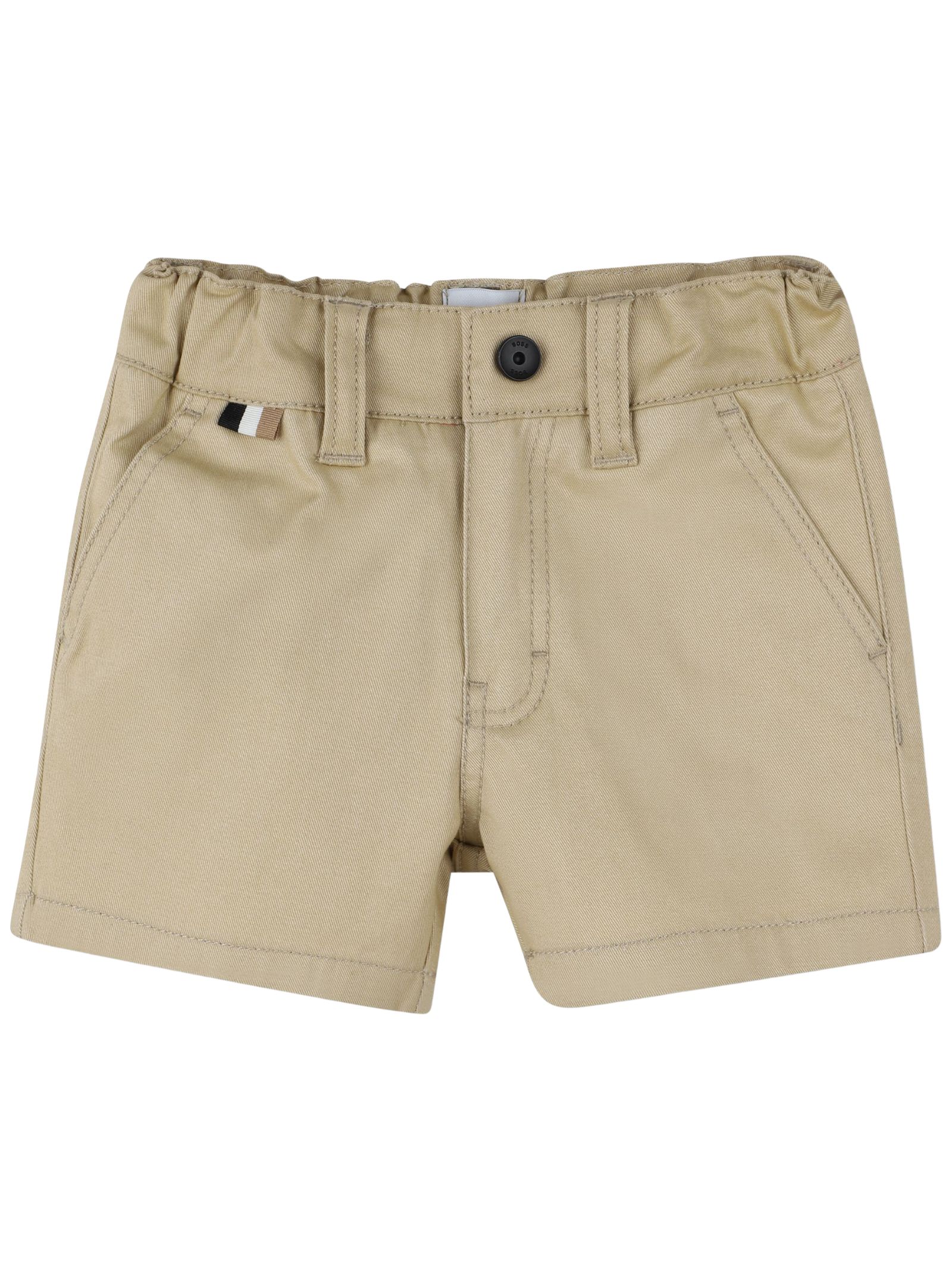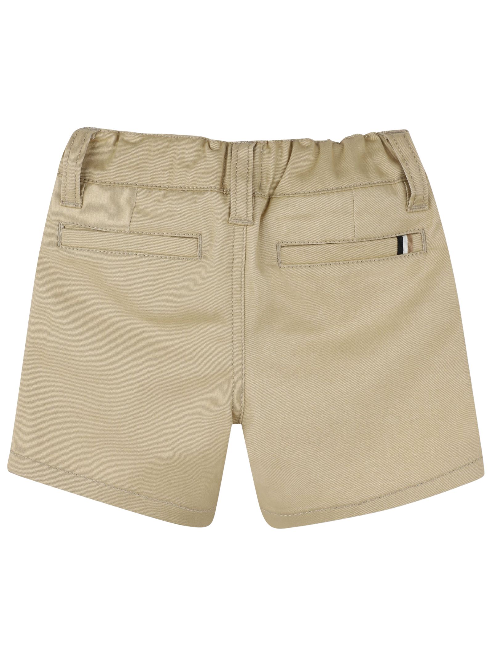Hugo Boss Kids bermuda di colore beige in cotone elasticizzato drill, chiusura frontale con bottoni, 2 tasche laterali, 2 tasche posteriori, vita con elastico, etichetta in tessuto tricolore sul davanti, vestibilità regolare. Composizione: 98% cotone 2% elastan