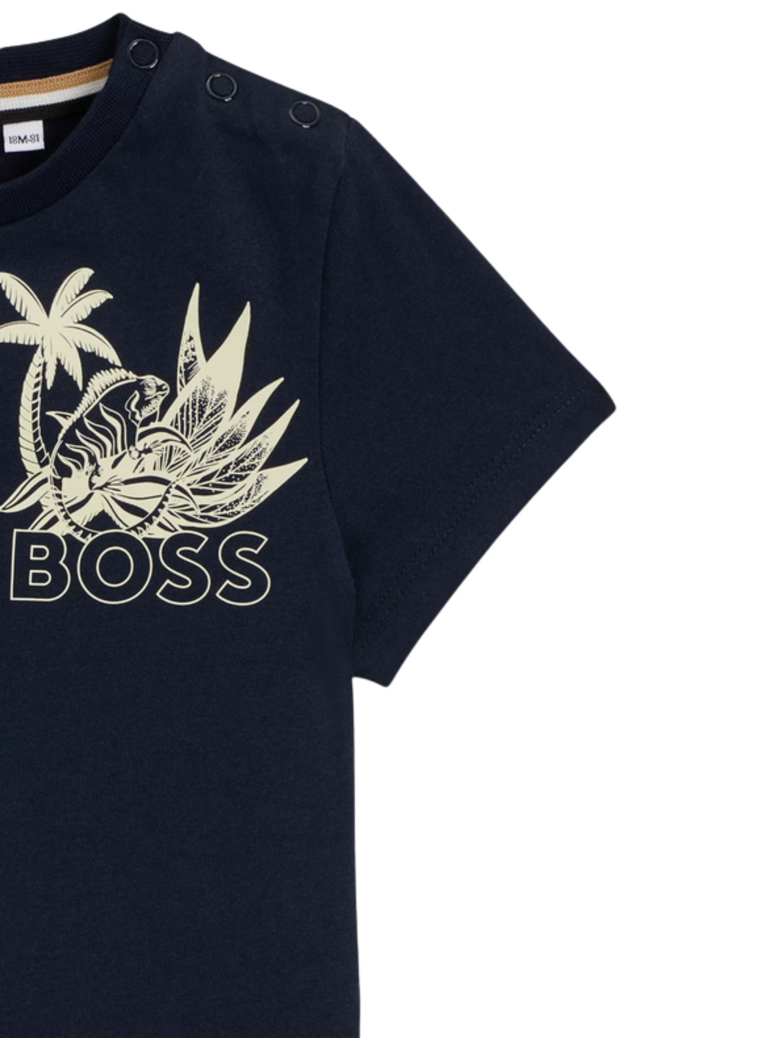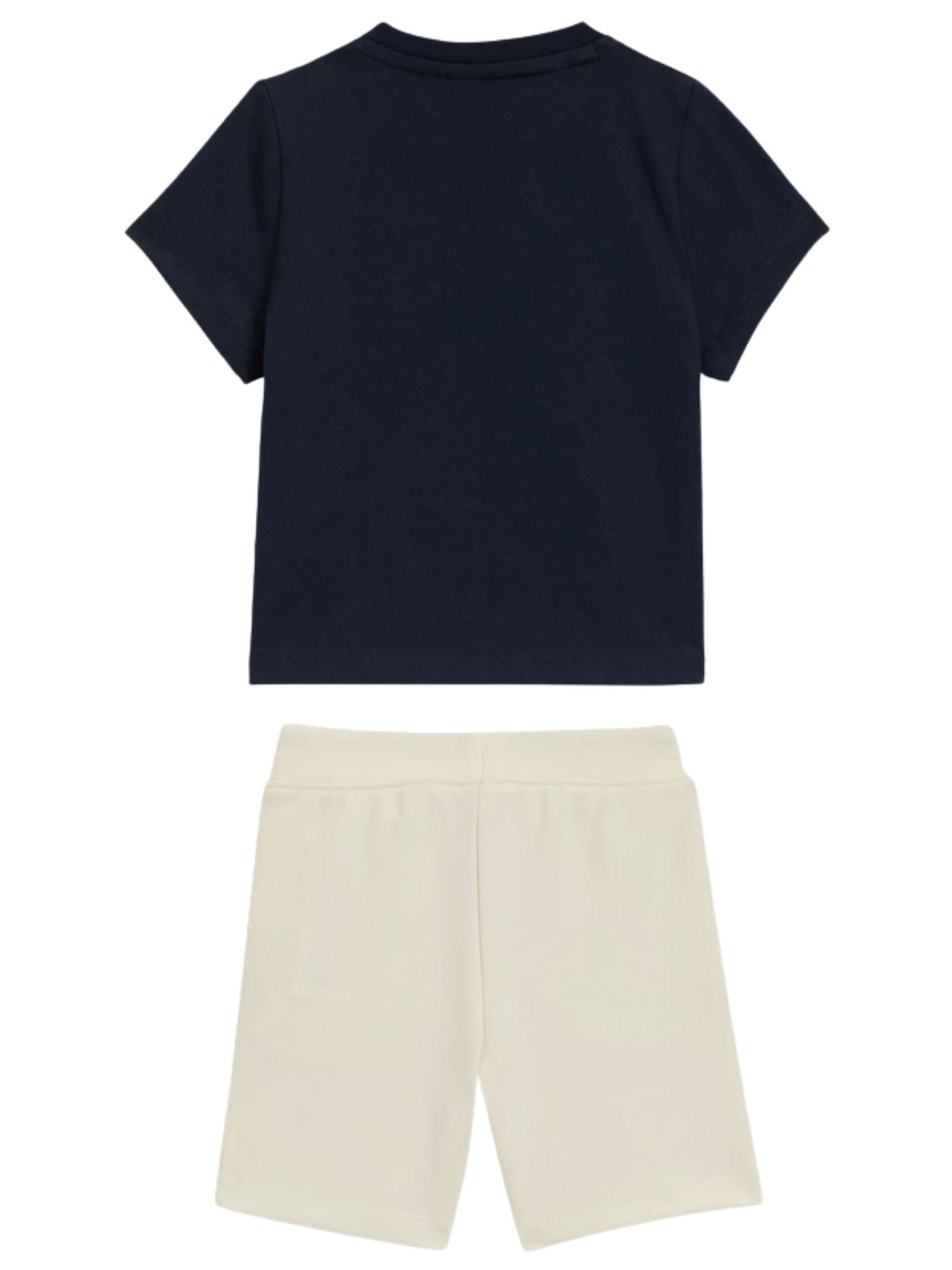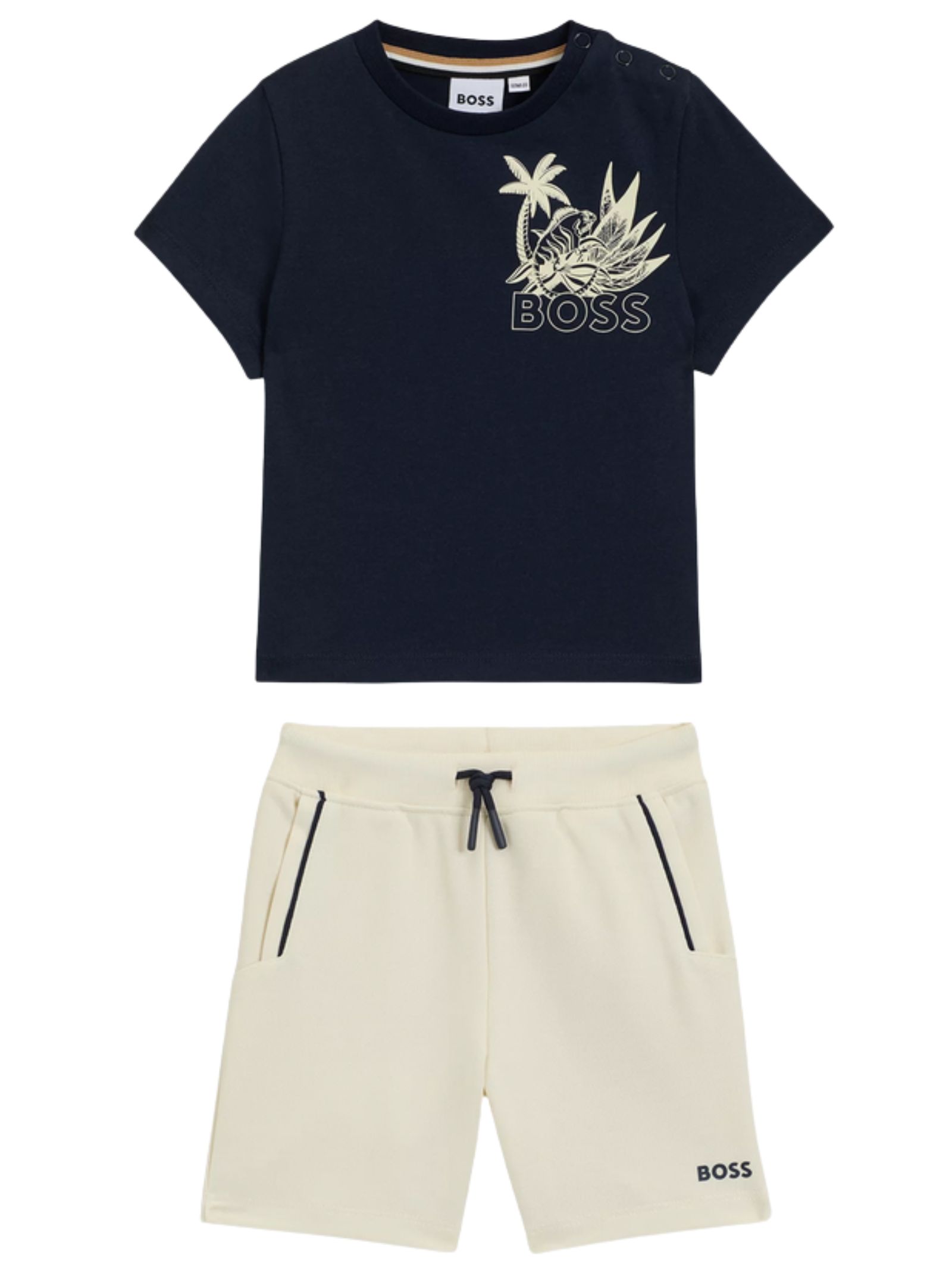 Hugo Boss Kids completo di colore blu/sabbia composto da t-shirt girocollo, mezza manica, stampa logo sul petto a contrasto, bottoni automatici sulla spalla; bermuda abbinato con vita elastica, tasche laterali, stampa logo, vestibilità regolare. Composizione: 60% cotone 40% poliestere