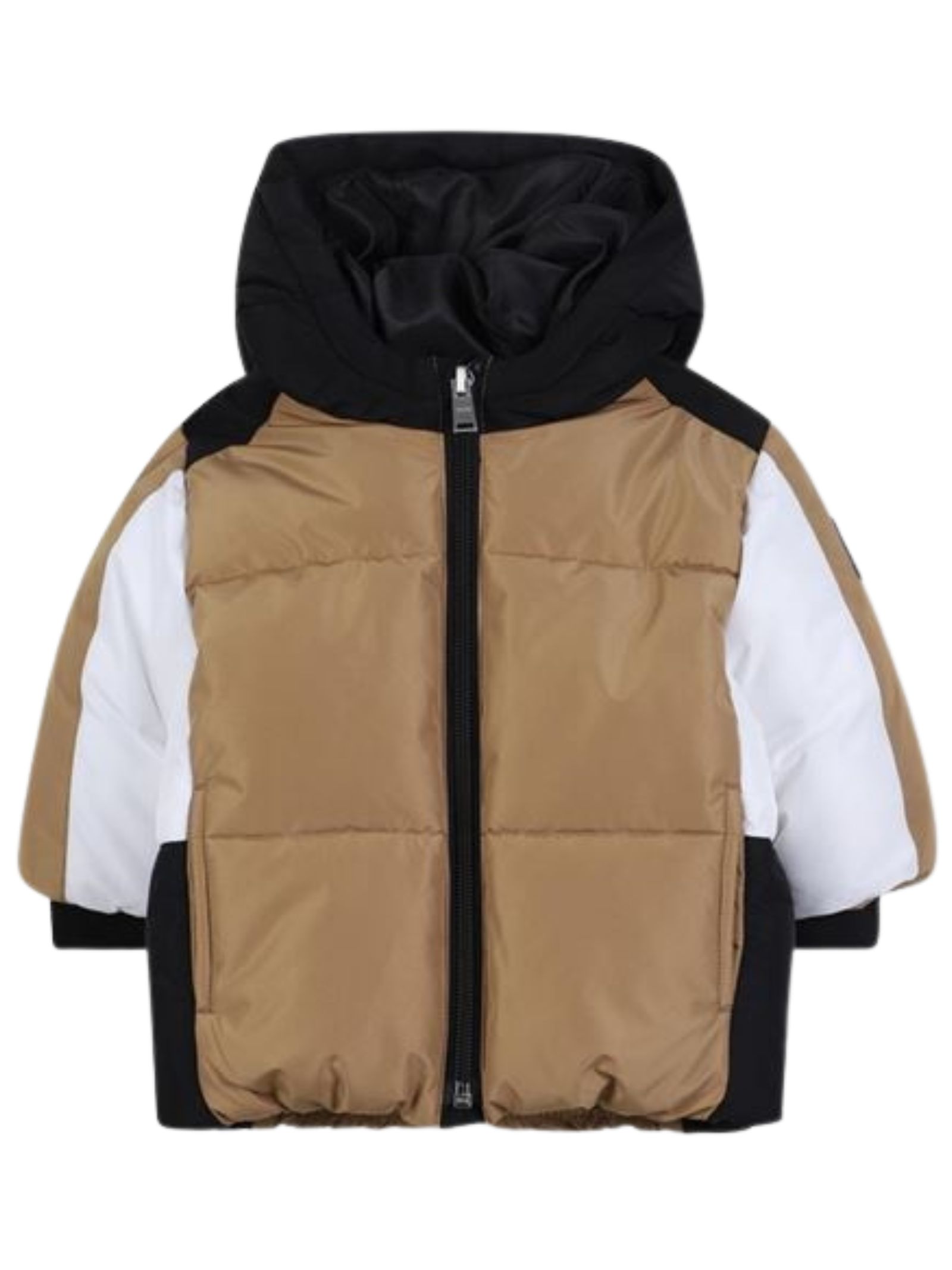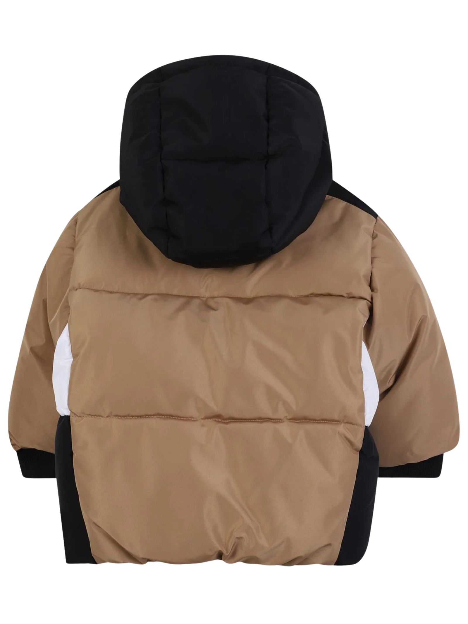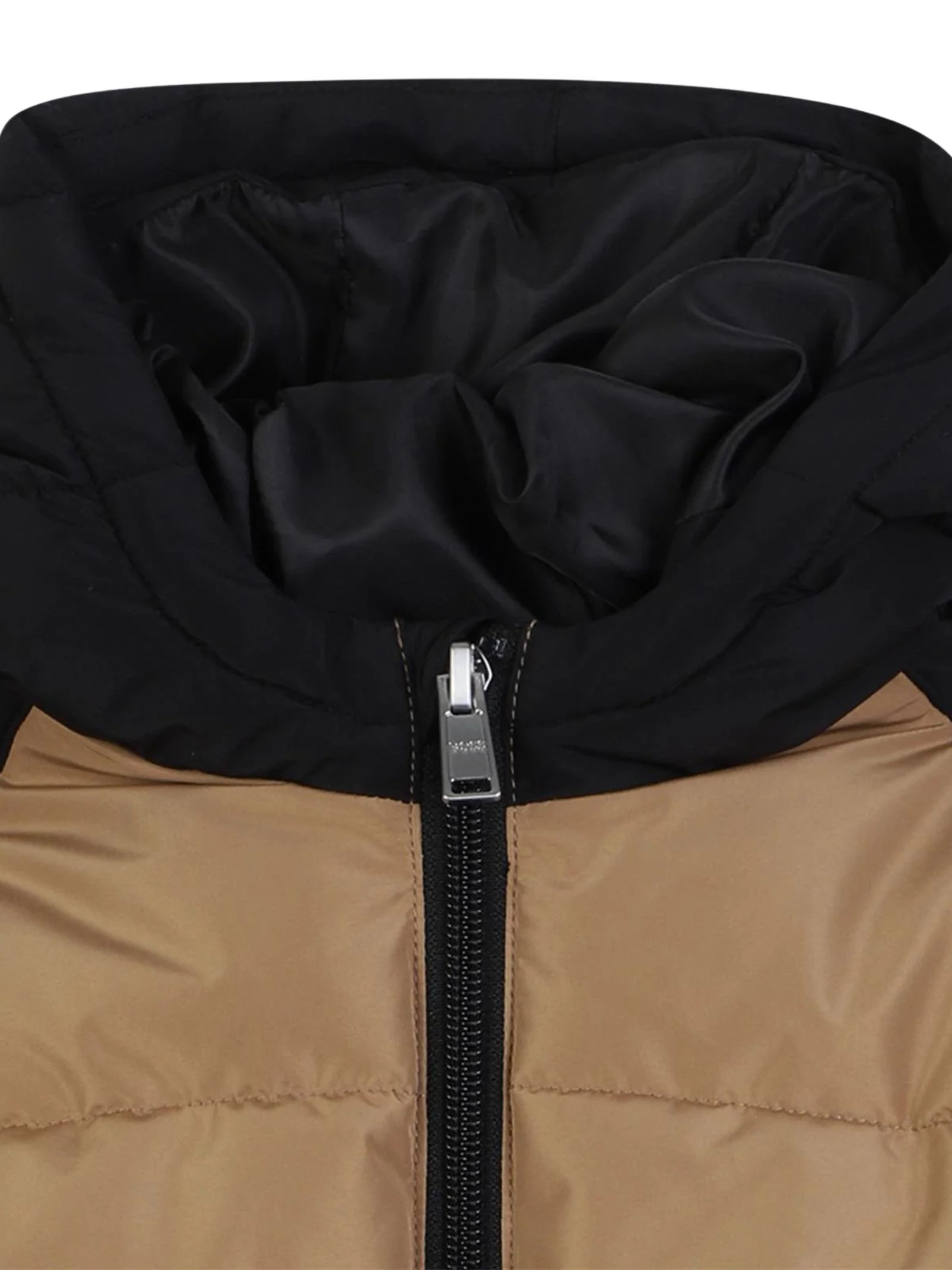 Hugo Boss Kids giubbino di colore beige, dettagli a contrasto nero/bianco, trapuntato, cappuccio fisso, logo sul braccio, due tasche laterali, vestibilità regolare. Composizione: Poliestere 100%. Imbottitura: 100% Poliestere