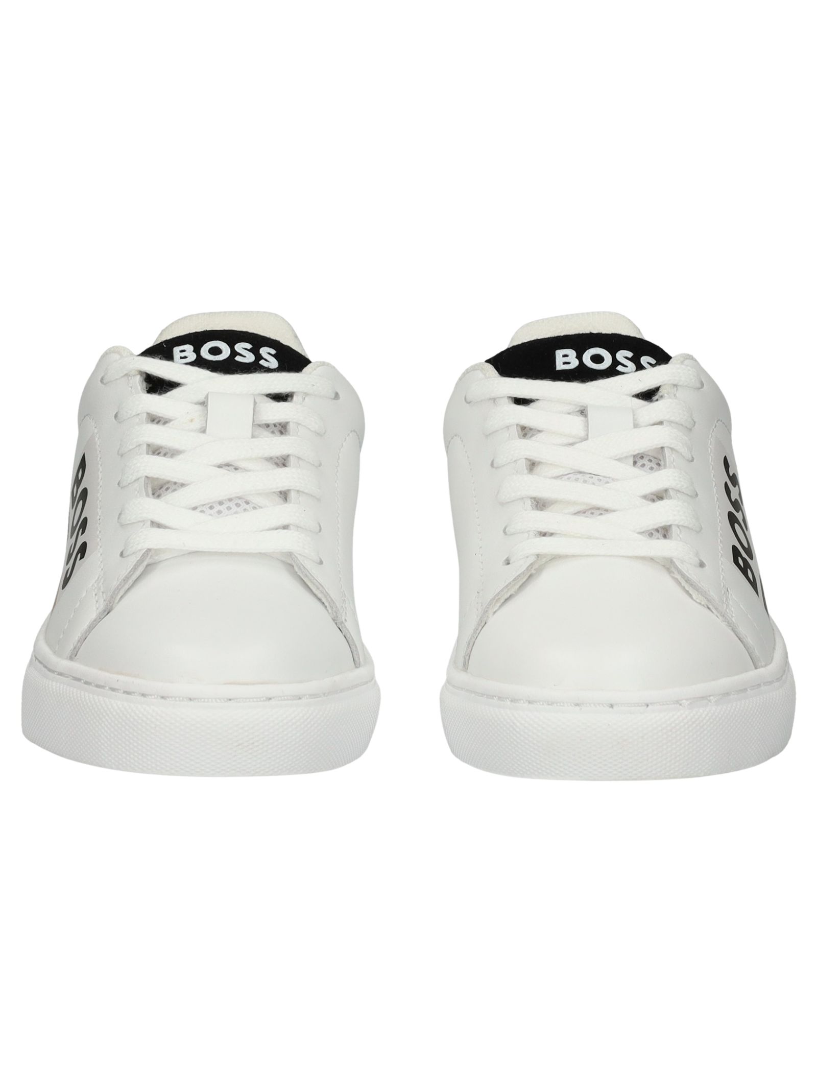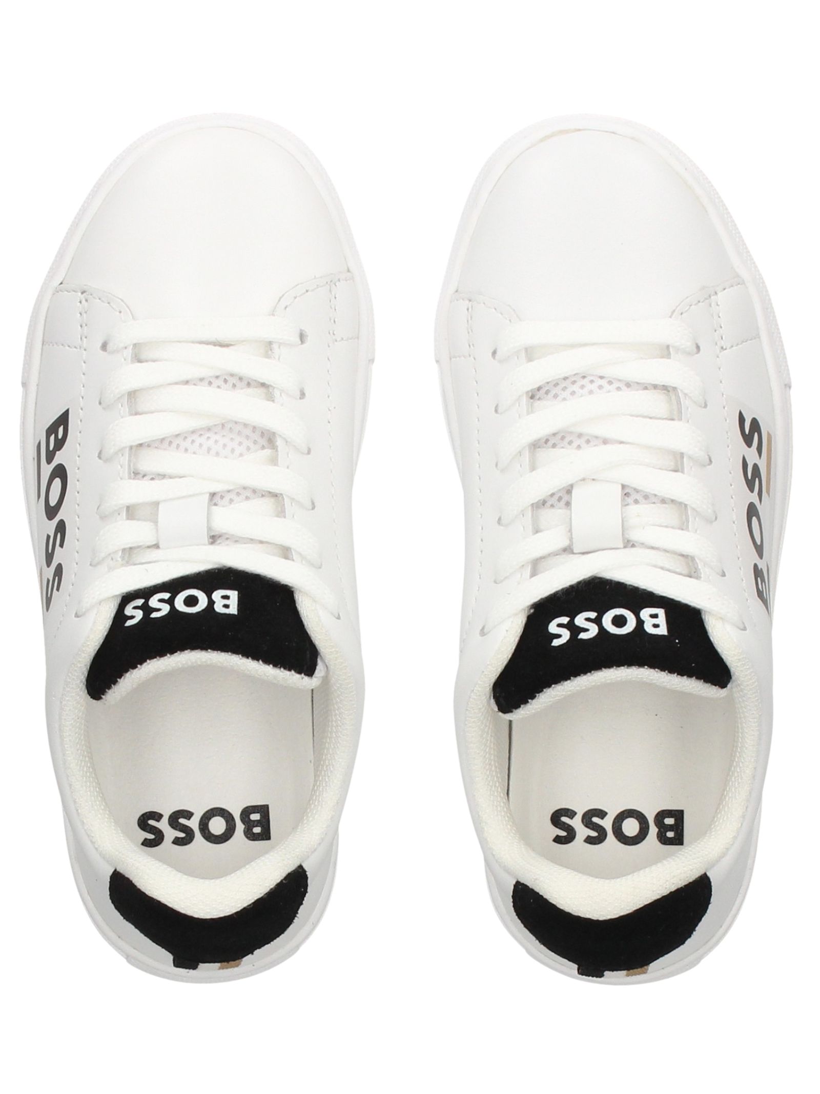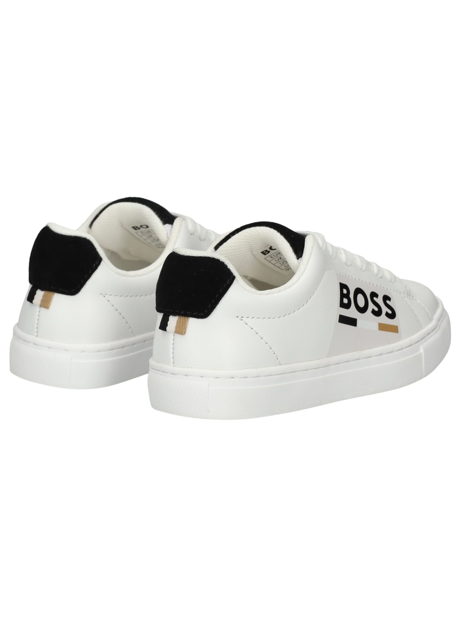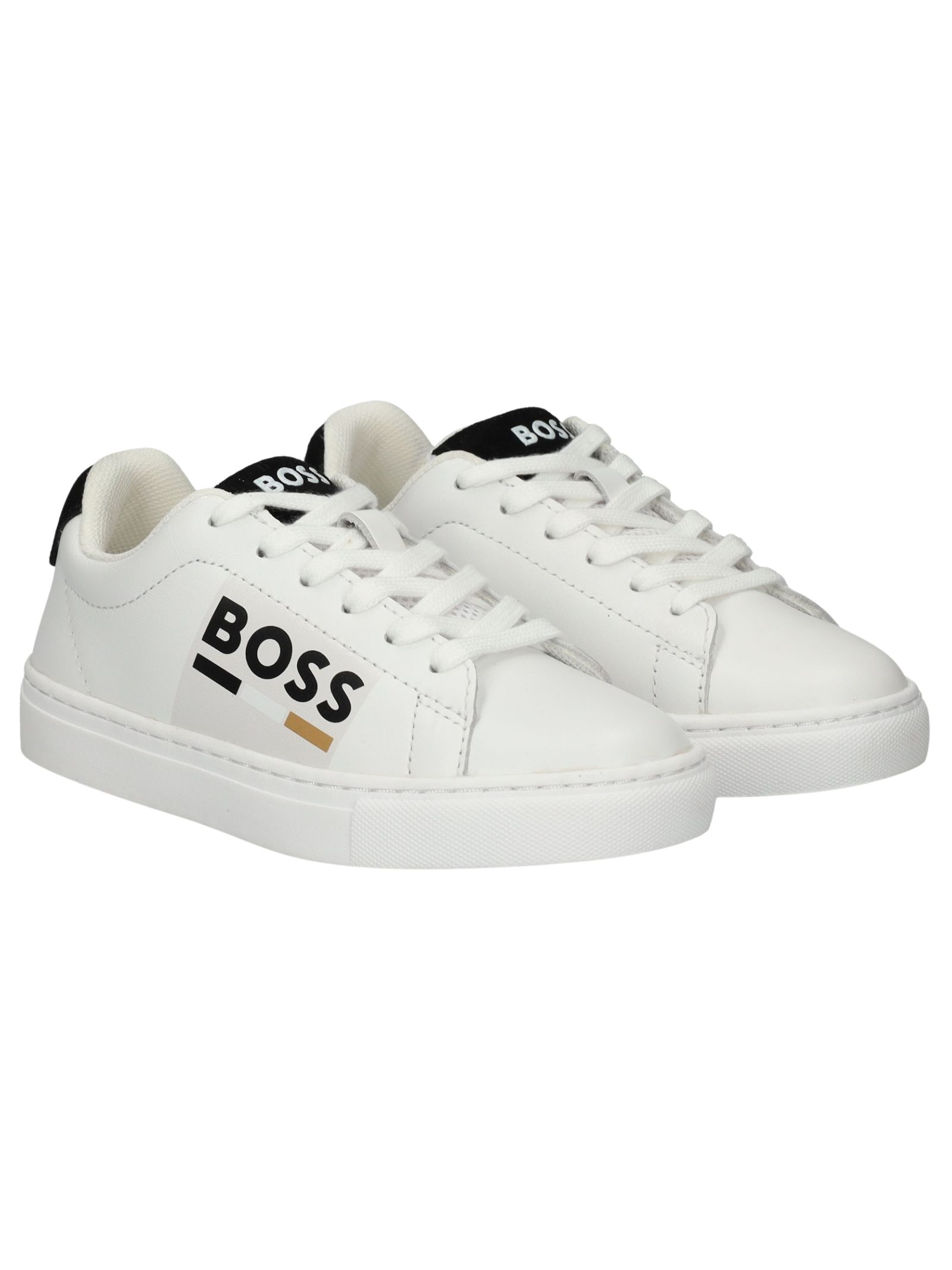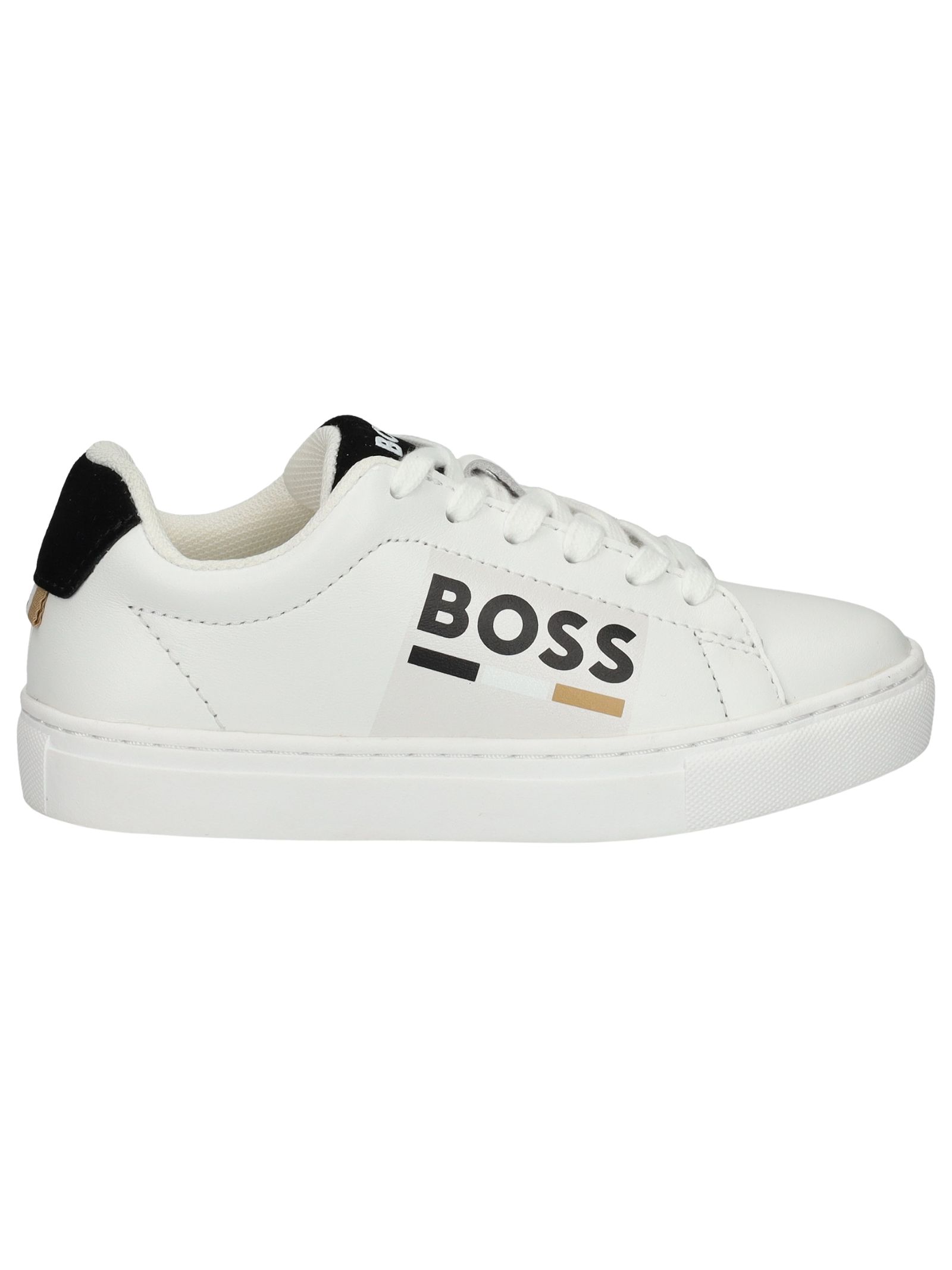 Sneakers HUGO BOSS bambino di colore bianco, realizzata in pelle, punta tonda, chiusura con lacci, logo laterale, inserto sul tallone di colore nero e suola in gomma.