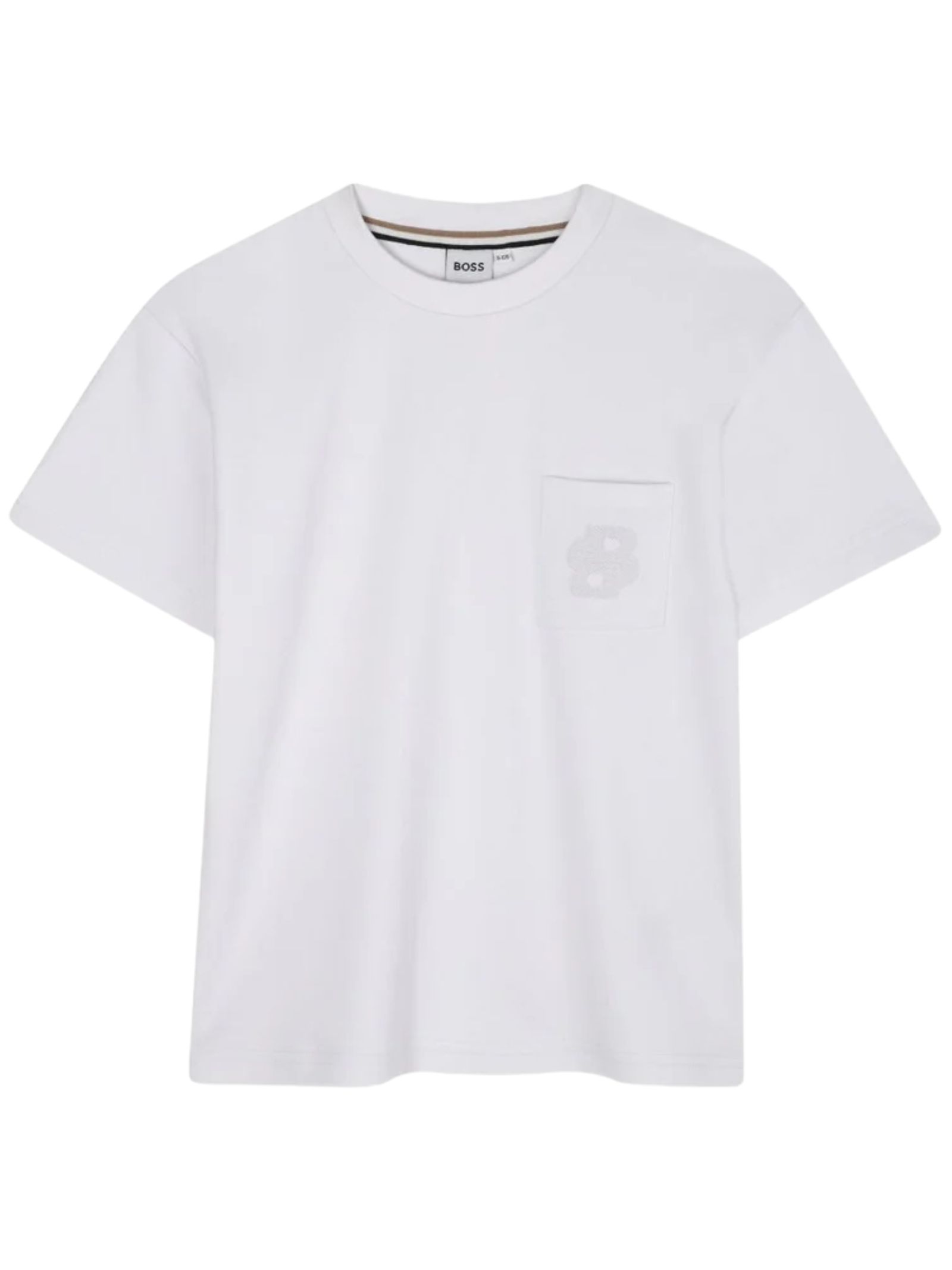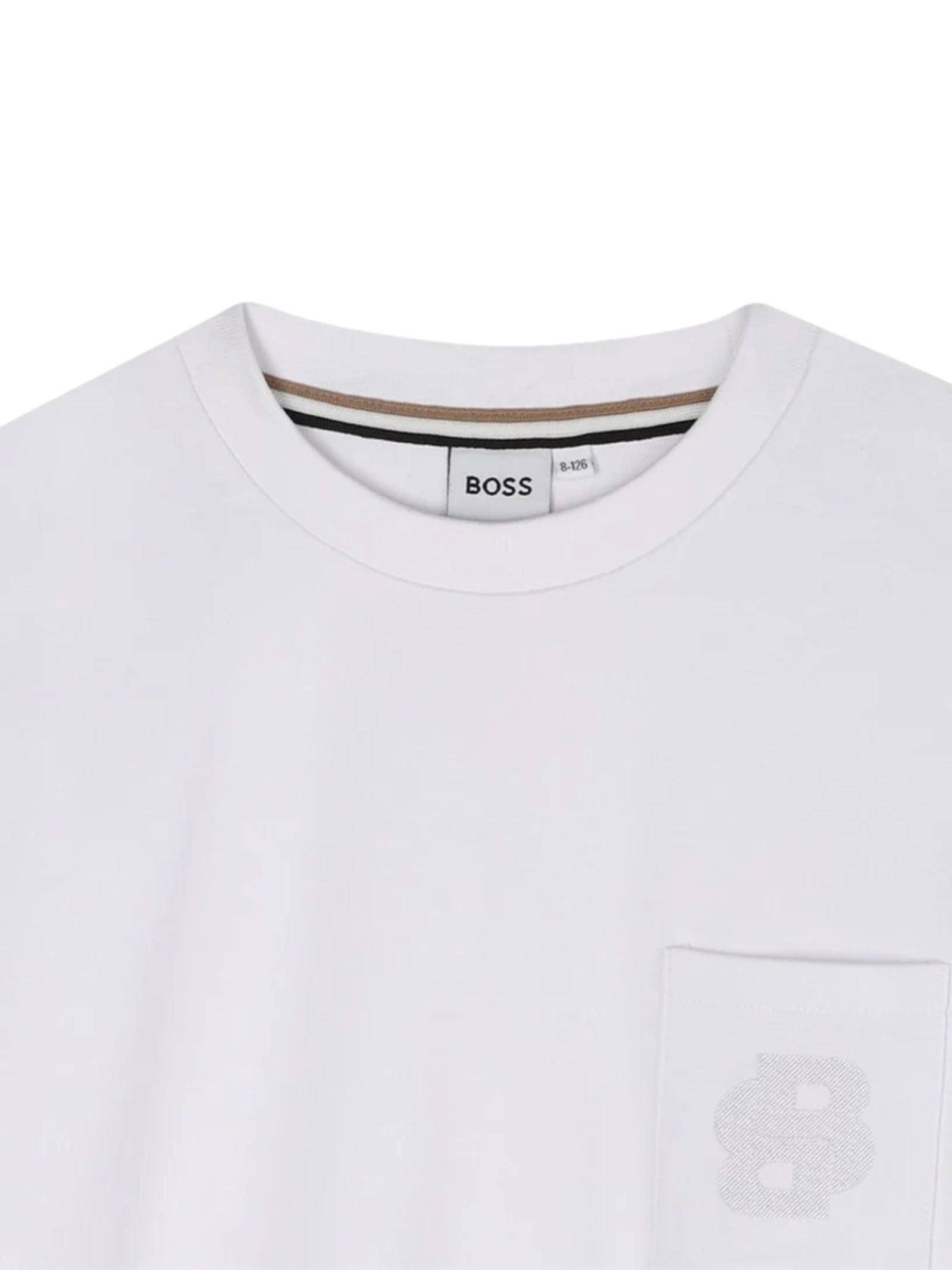 Hugo Boss Kids t-shirt di colore bianco, modello girocollo, mezze maniche, ltaschino sul petto con logo in rilievo, orlo dritto, vestibilità regolare. Composizione: 100% cotone