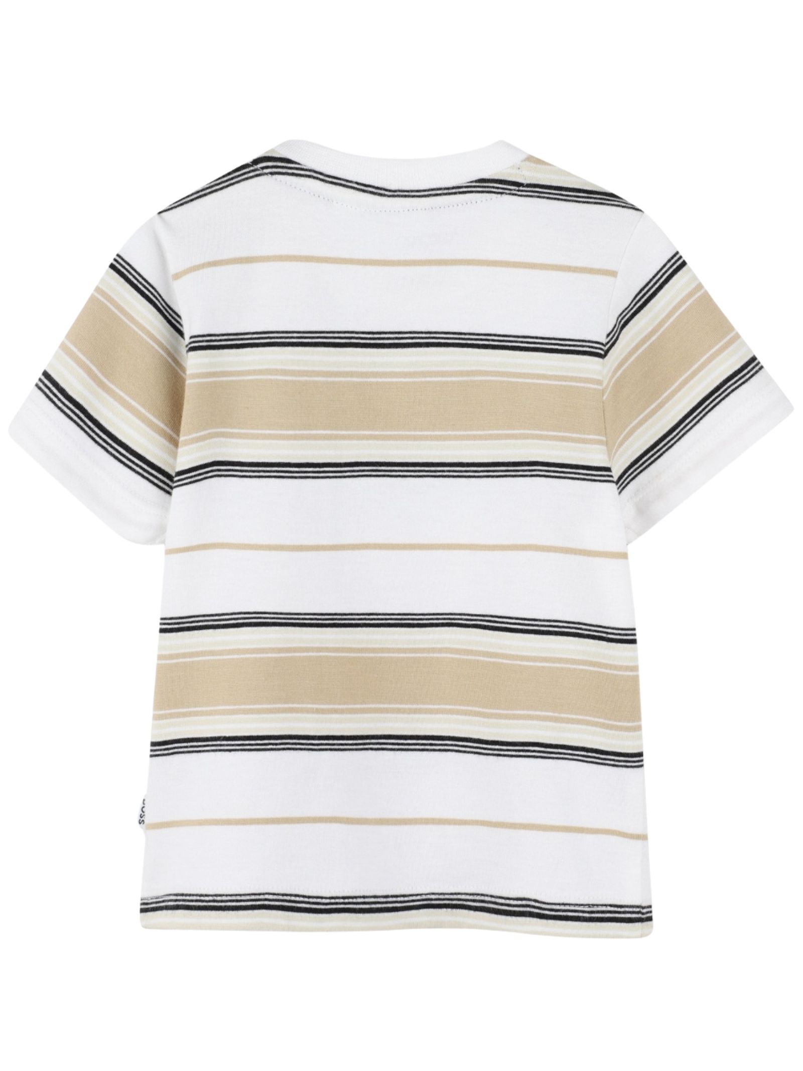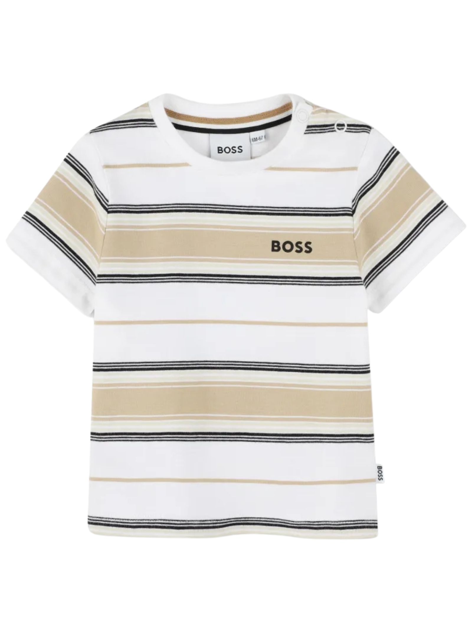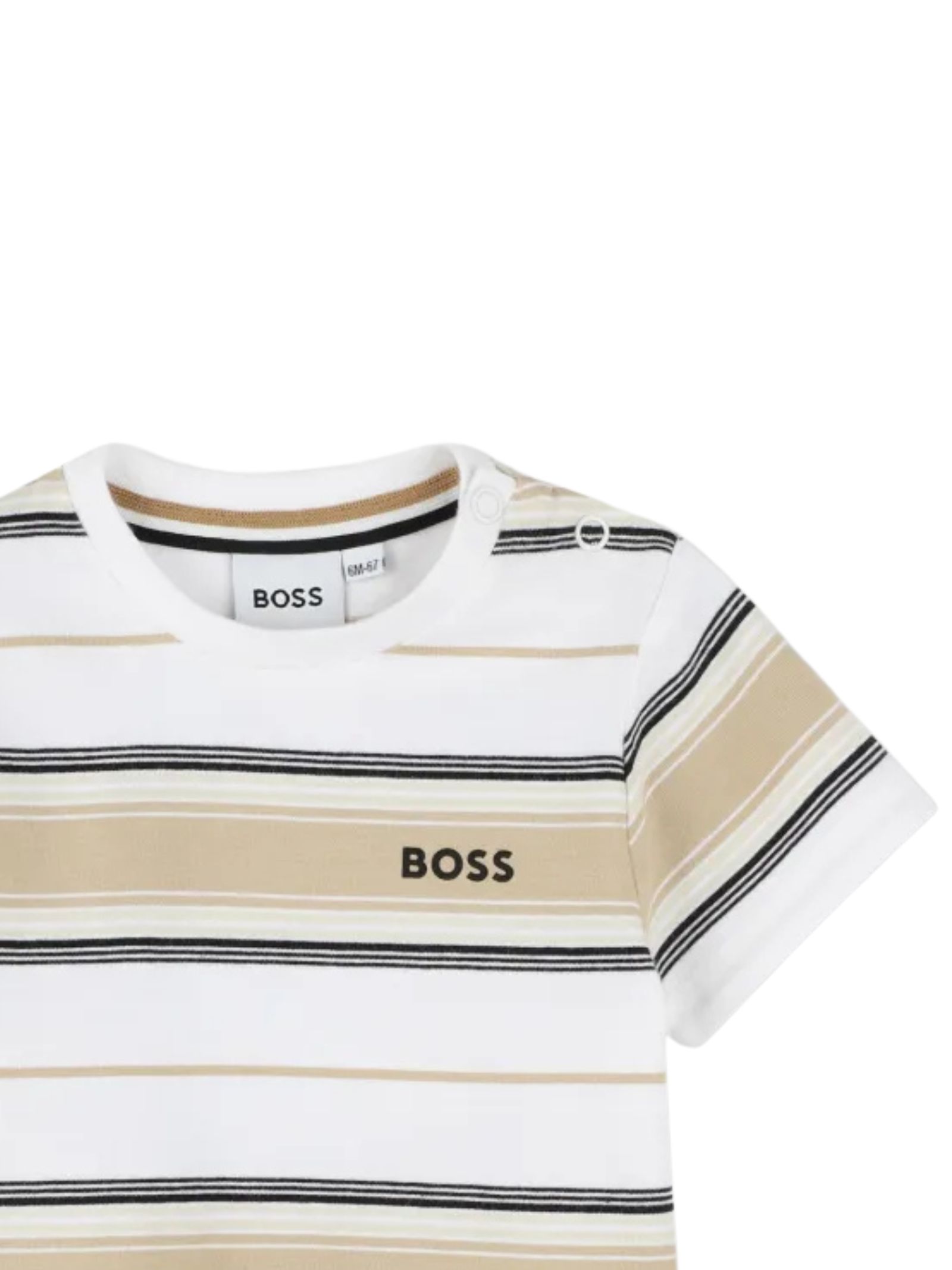 Hugo Boss Kids t-shirt in fantasia a righe di colore bianco/sabbia, modello girocollo, mezza manica, stampa logo sul petto a contrasto, bottoni automatici sulla spalla, vestibilità regolare. Composizione: Cotone 100%