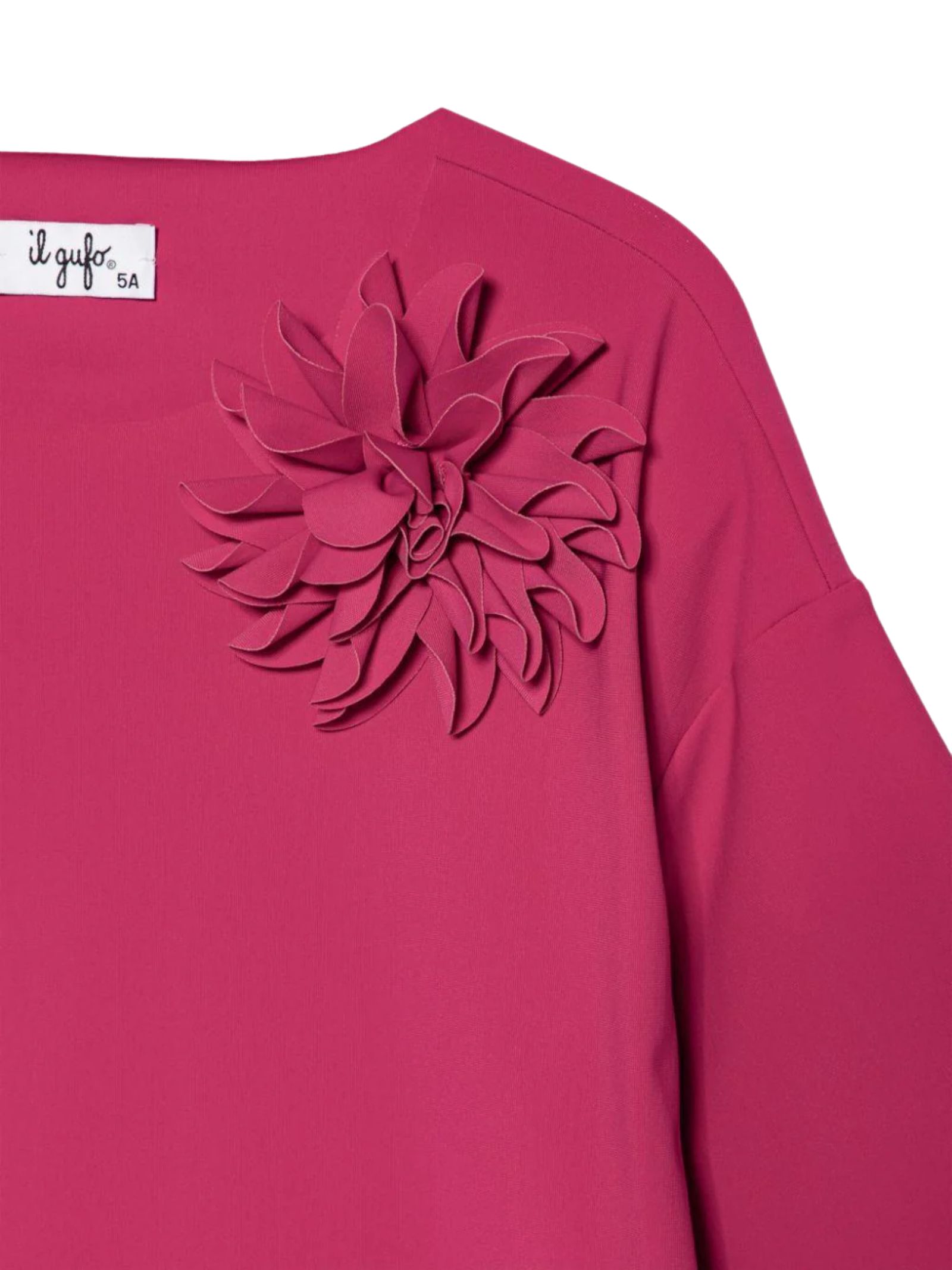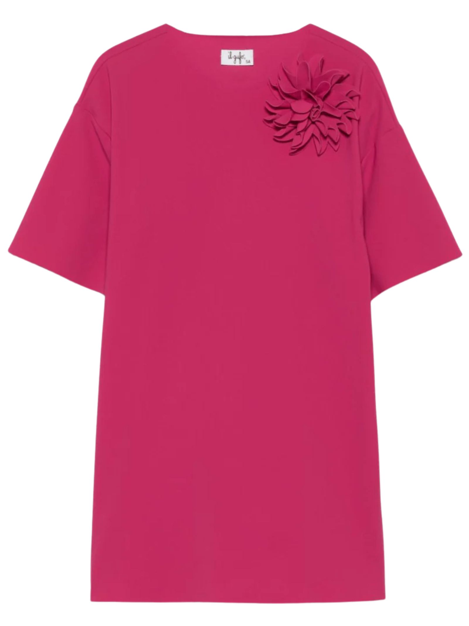 IL GUFO Kids abito di colore fucsia, taglio vivo, applicazione fiore, girocollo, mezza manica, orlo dritto. Composizione: 74% poliammide, 26% elastan