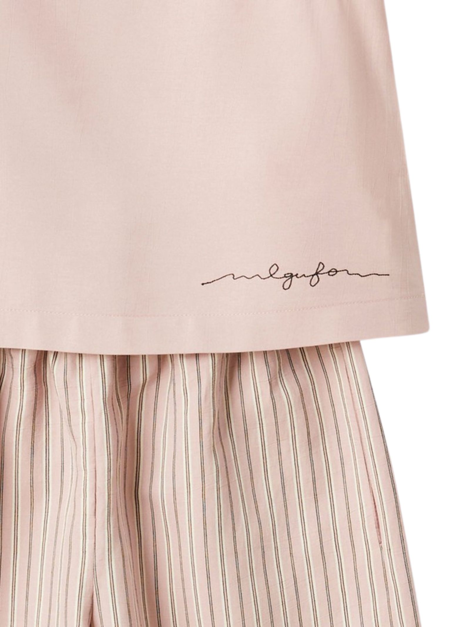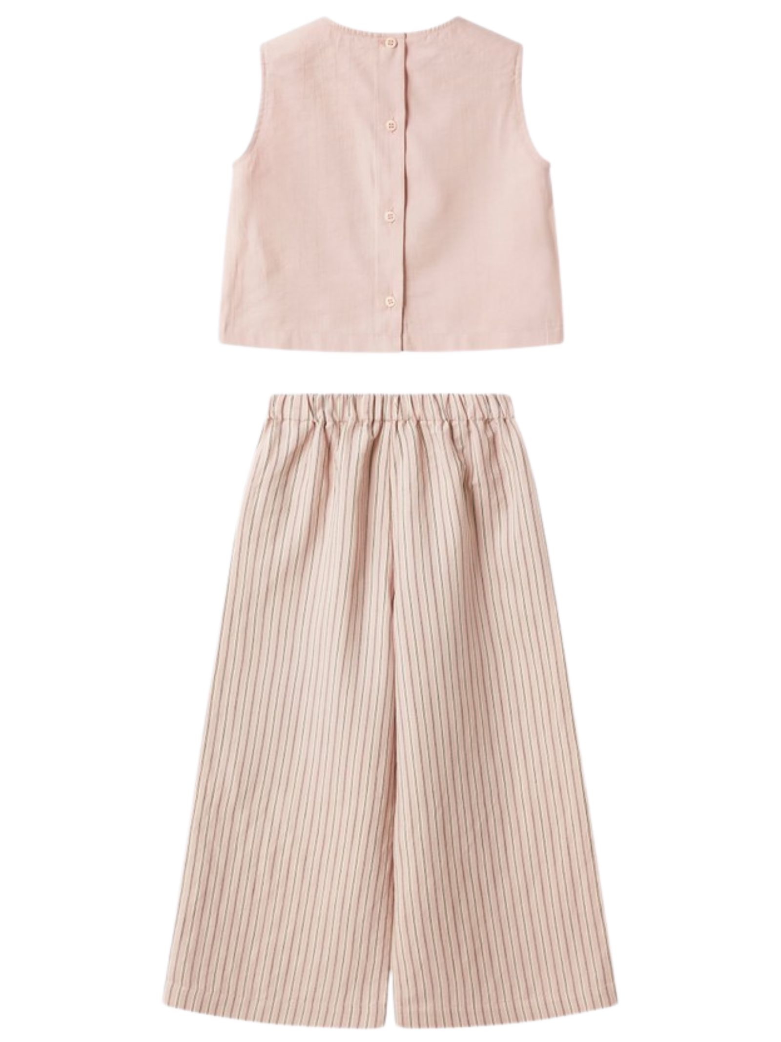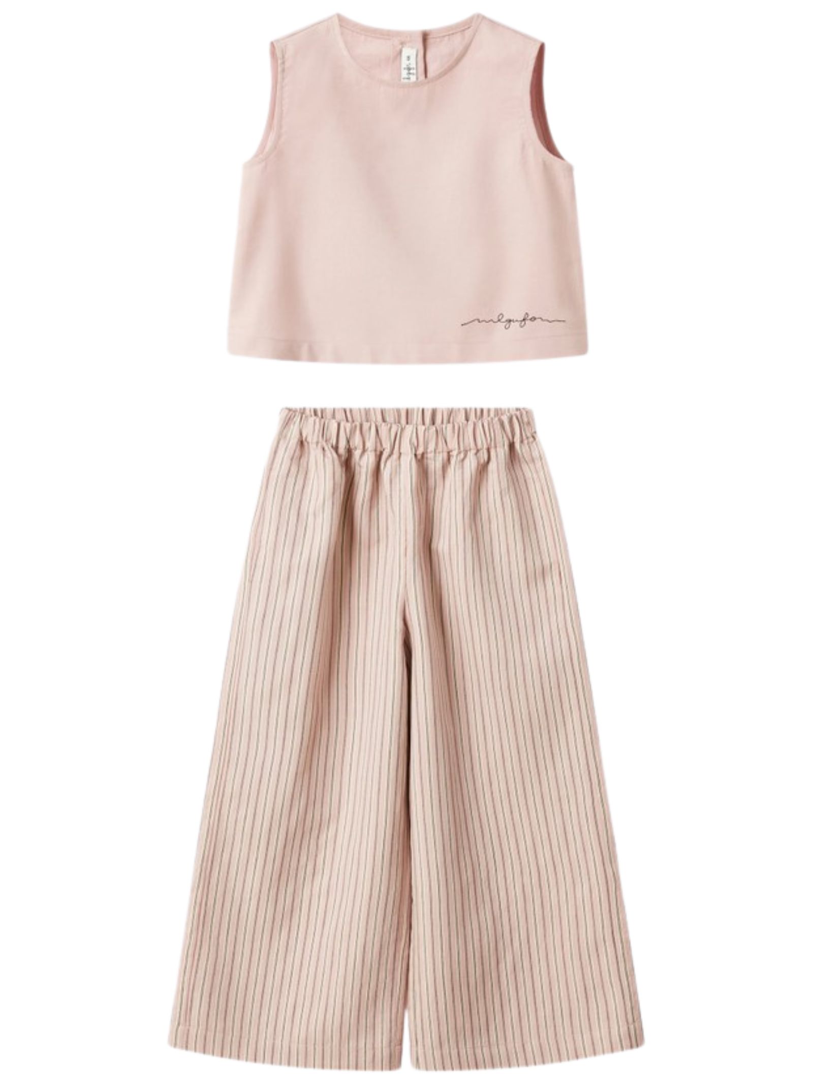 IL GUFO Kids completo in viscosa di colore rosa cipria, composto da canotta girocollo smanicata con logo lettering sul davanti e bottoncini sul retro; pantalone ampio a righe con vita elasticizzata. Composizione: 90% viscosa 10% poliestere