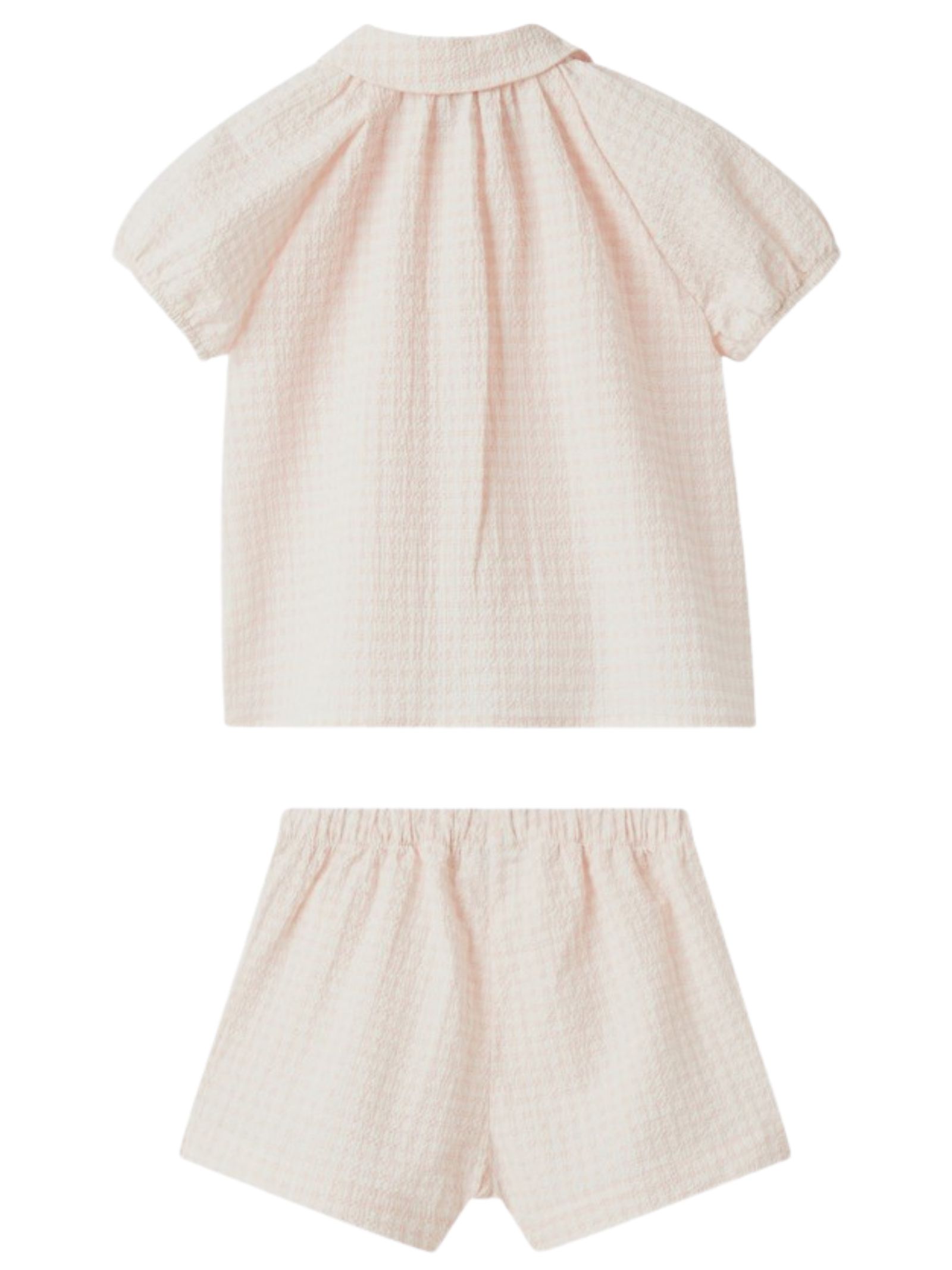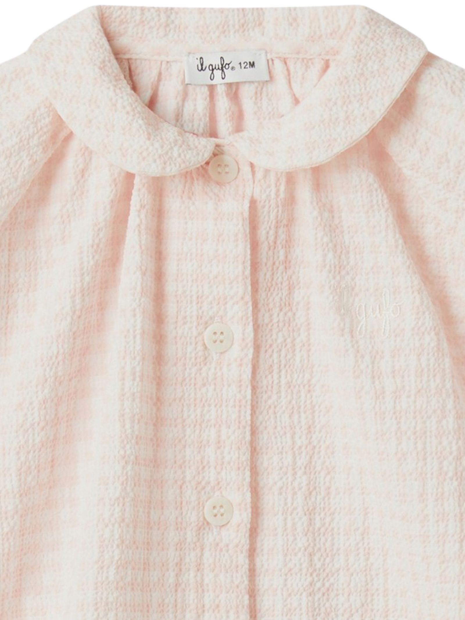 IL GUFO Kids completo in seersucker vichy di colore rosa in fantasia a quadretti, composto da camicia con colletto tondo, manica a sbuffo con finitura elastica e abbottonatura frontale; shorts abbinato con elastico in vita. Composizione: 97% cotone 3% elastan