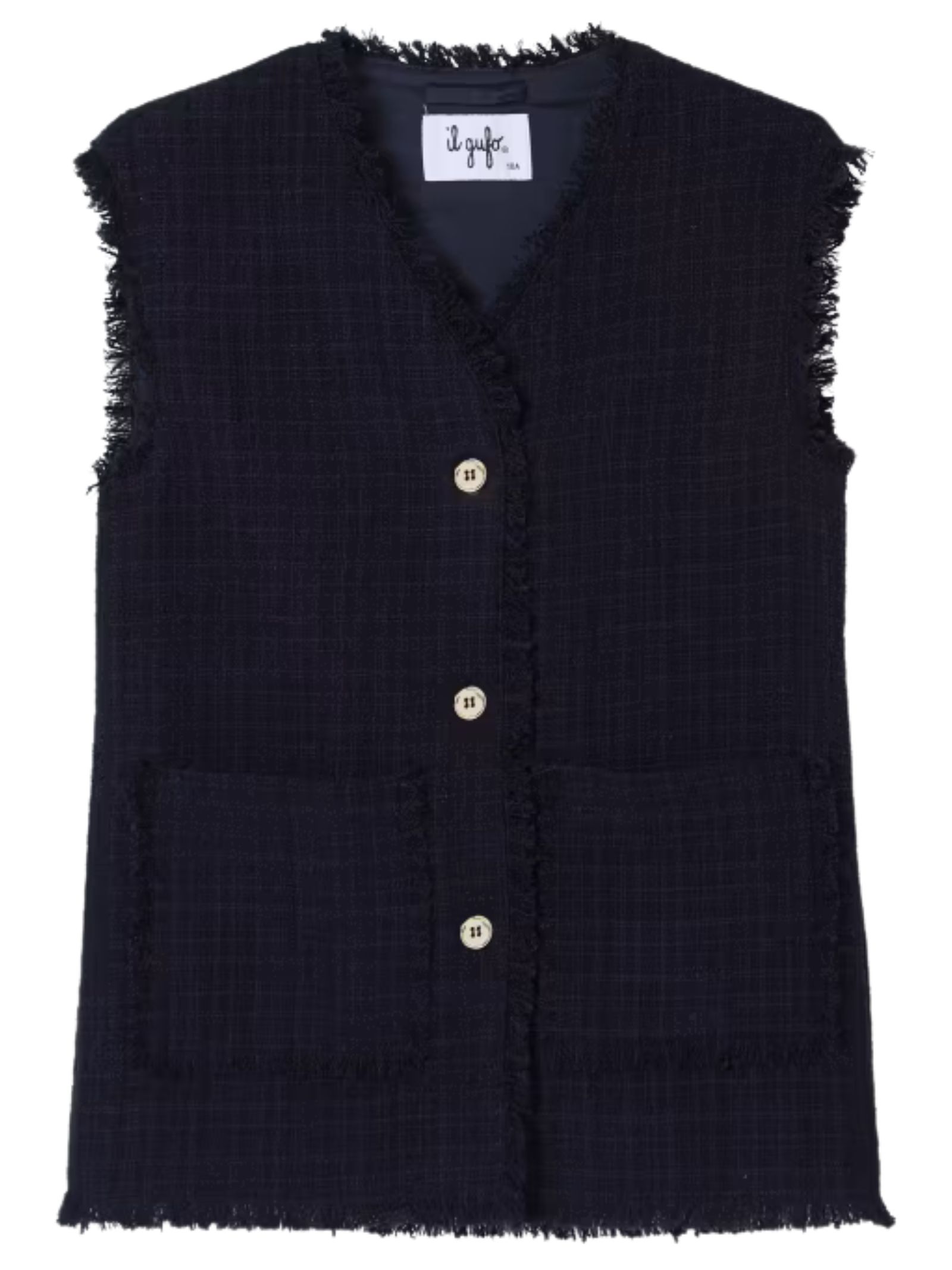 IL GUFO Kids Gilet in tweed di colore blu navy, chiusura frontale con bottoni, due tasche applicate frontali, senza maniche. Composizione: poliestere 48%, cotone 27%, acrilico 11%, fibre sintetiche 3%. Fodera: cotone 100%. Made in Italy