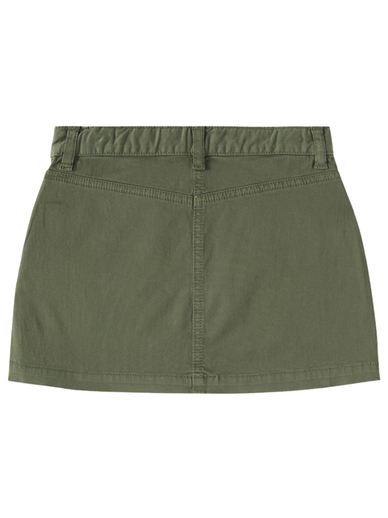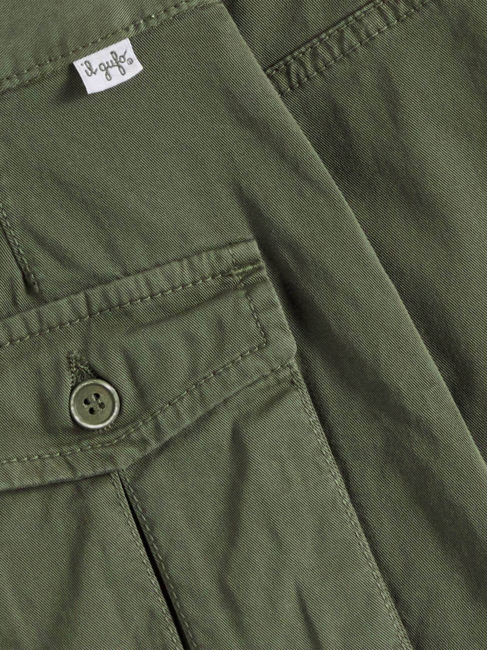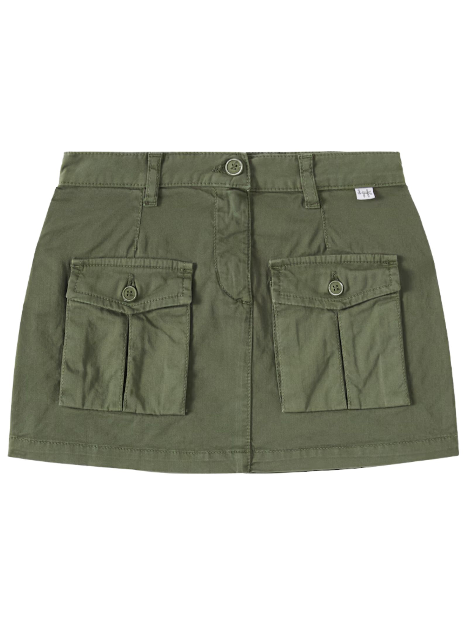 IL GUFO Kids mini gonna di colore verde militare, vita regolare, due tasconi cargo applicati, elastico in vita posteriore, passanti, patch con logo, vestibilità regolare. Composizione: 98% Cotone 2% Elastan