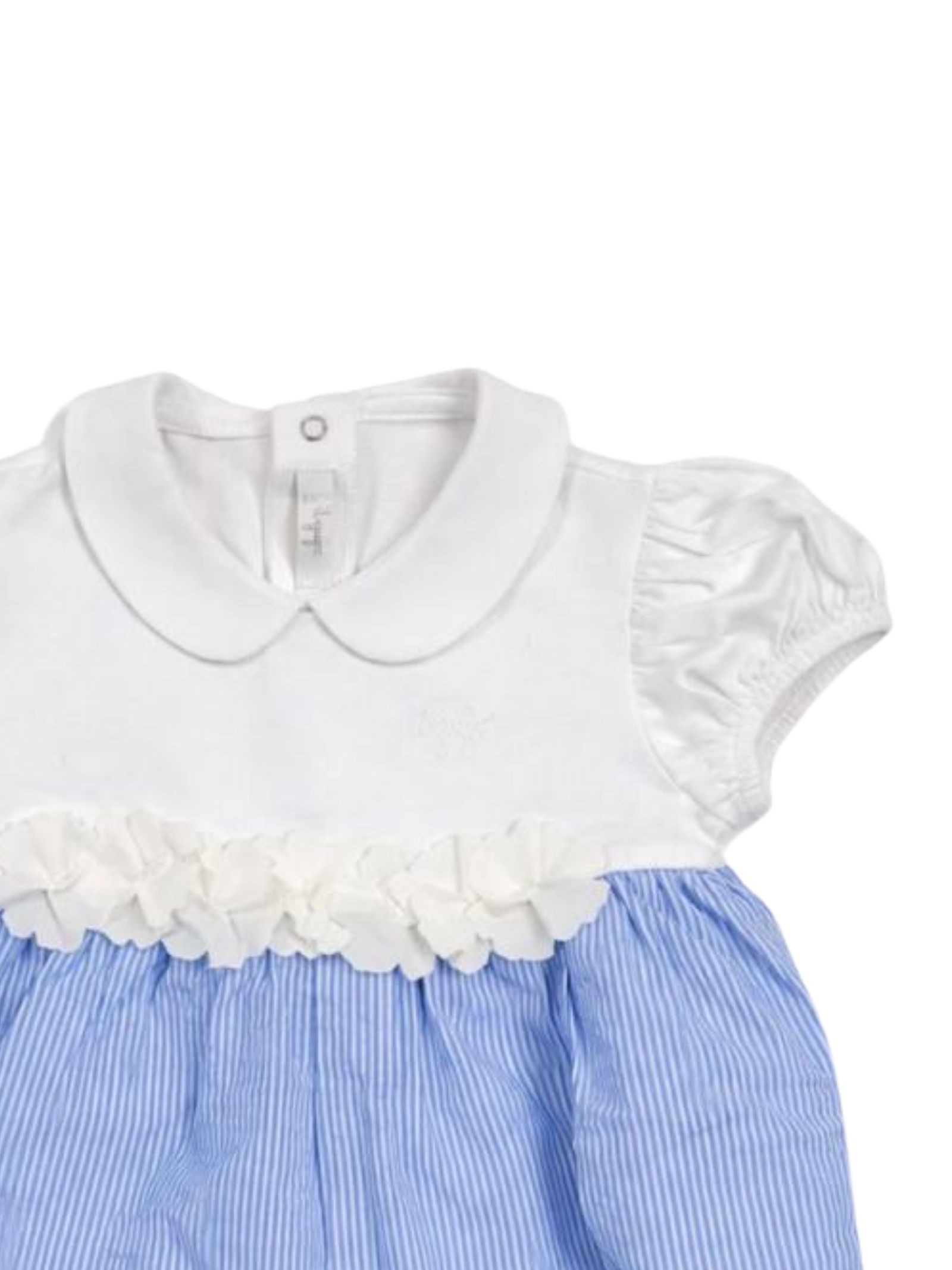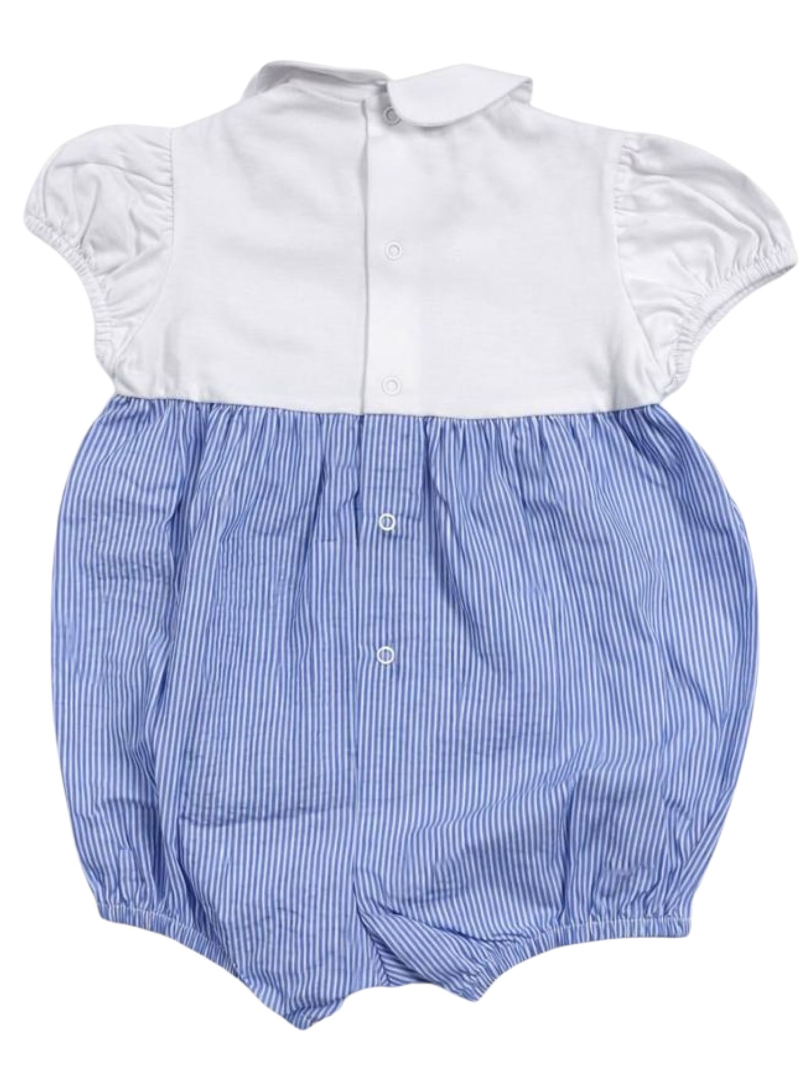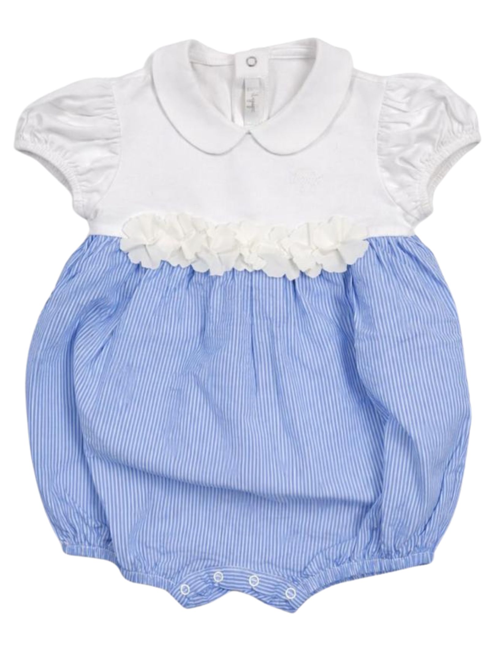 IL GUFO Kids pagliaccetto di colore bianco/azzurro, parte inferiore in fantasia righini, mezze maniche a sbuffo, applicazione fiori, bottoni automatici sul retro e sul cavallo. Composizione: 95% cotone 5% elastan