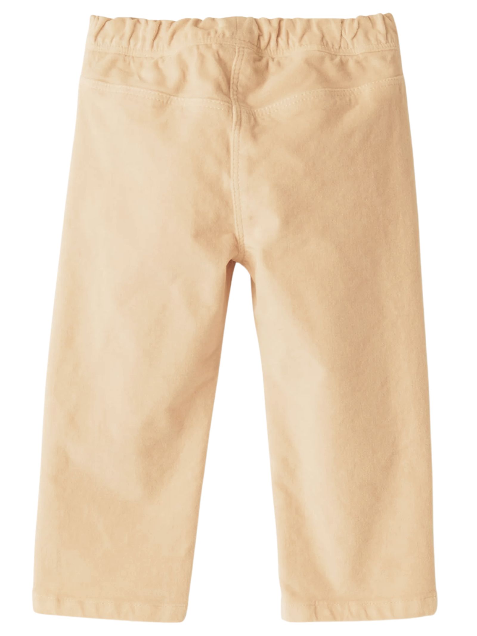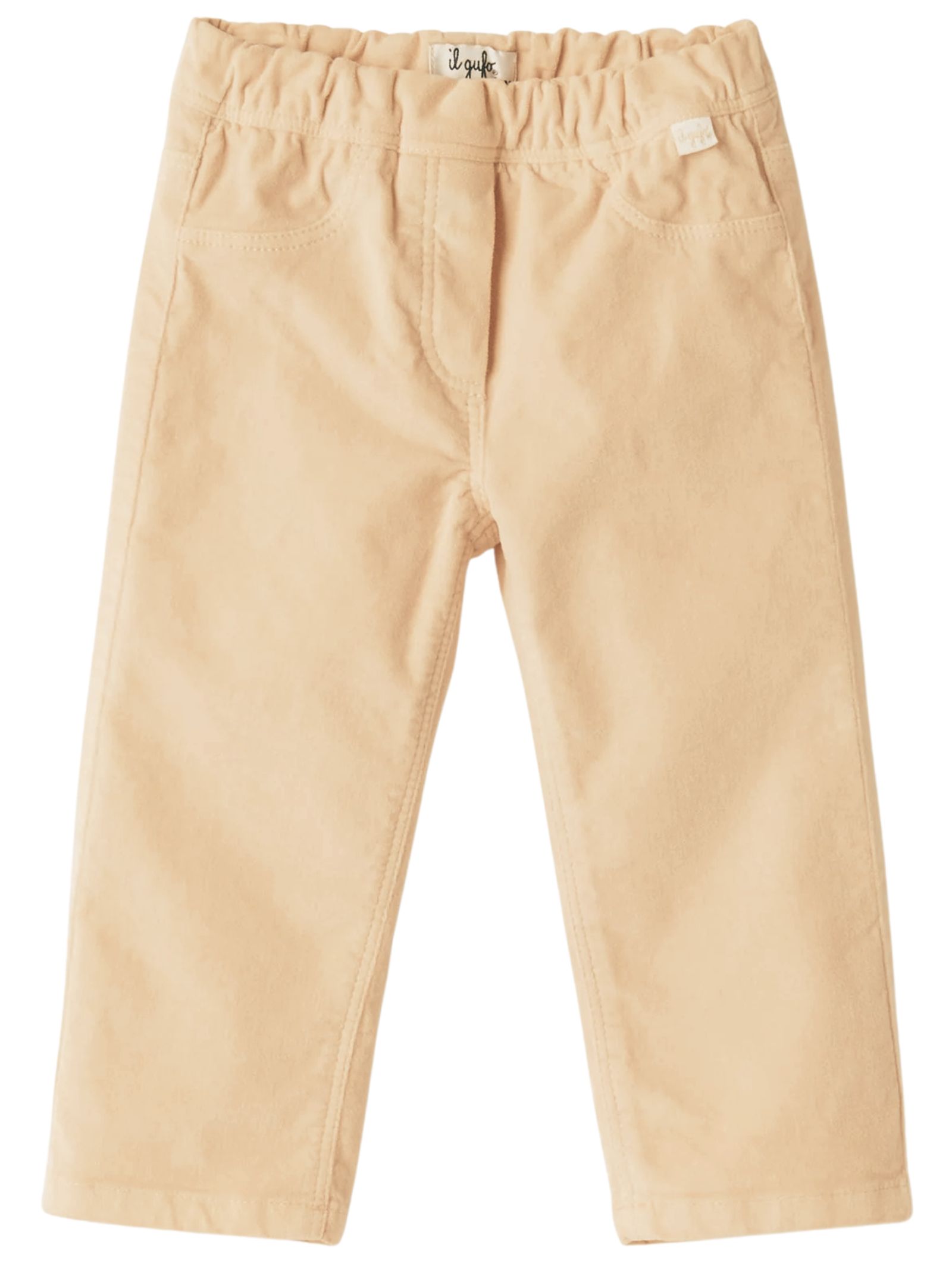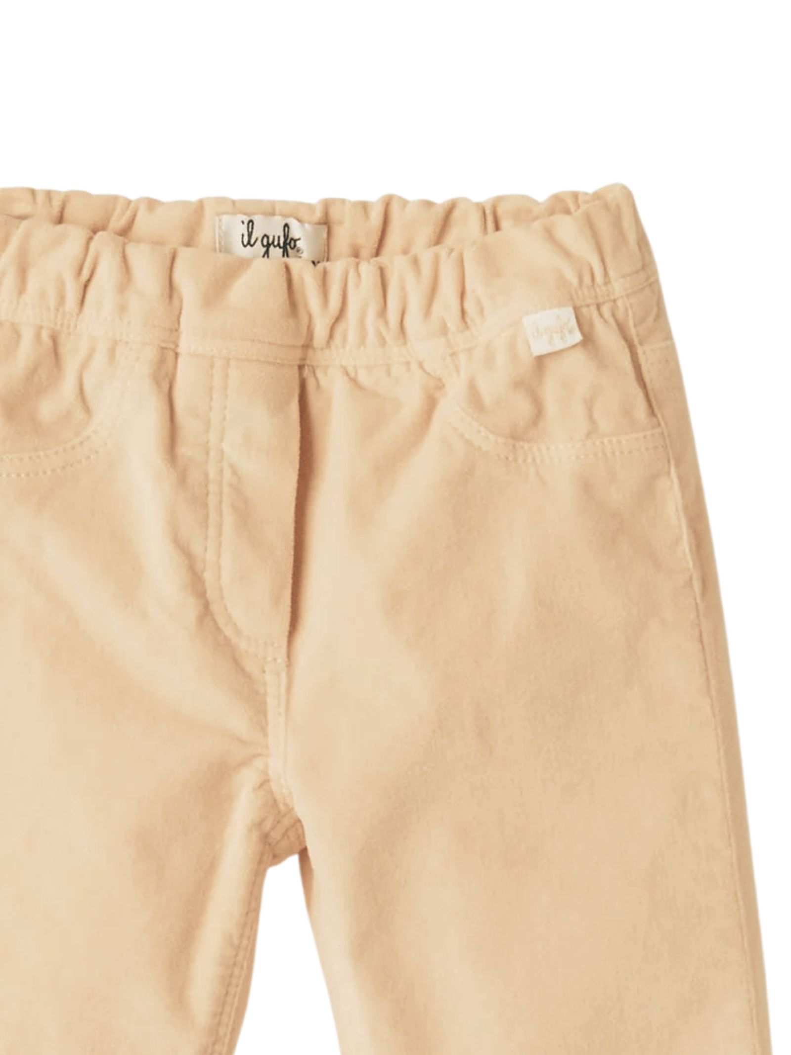 Il Gufo Kids pantalone di colore beige, morbido tessuto effetto velluto, modello con vita elastica, patch con logo applicato, vestibilità regolare. Composizione: 97% Cotone 3% Elastan. Made in Italy
