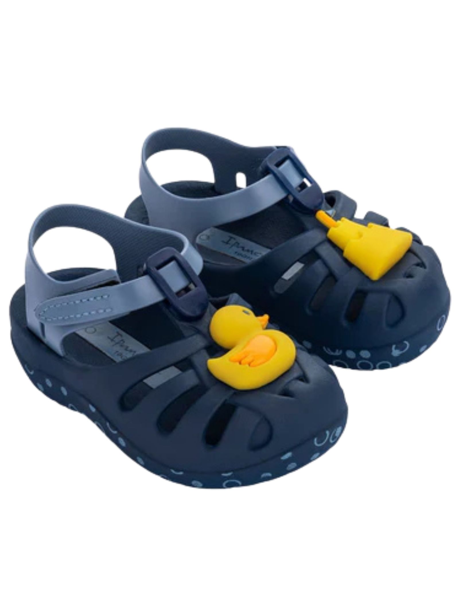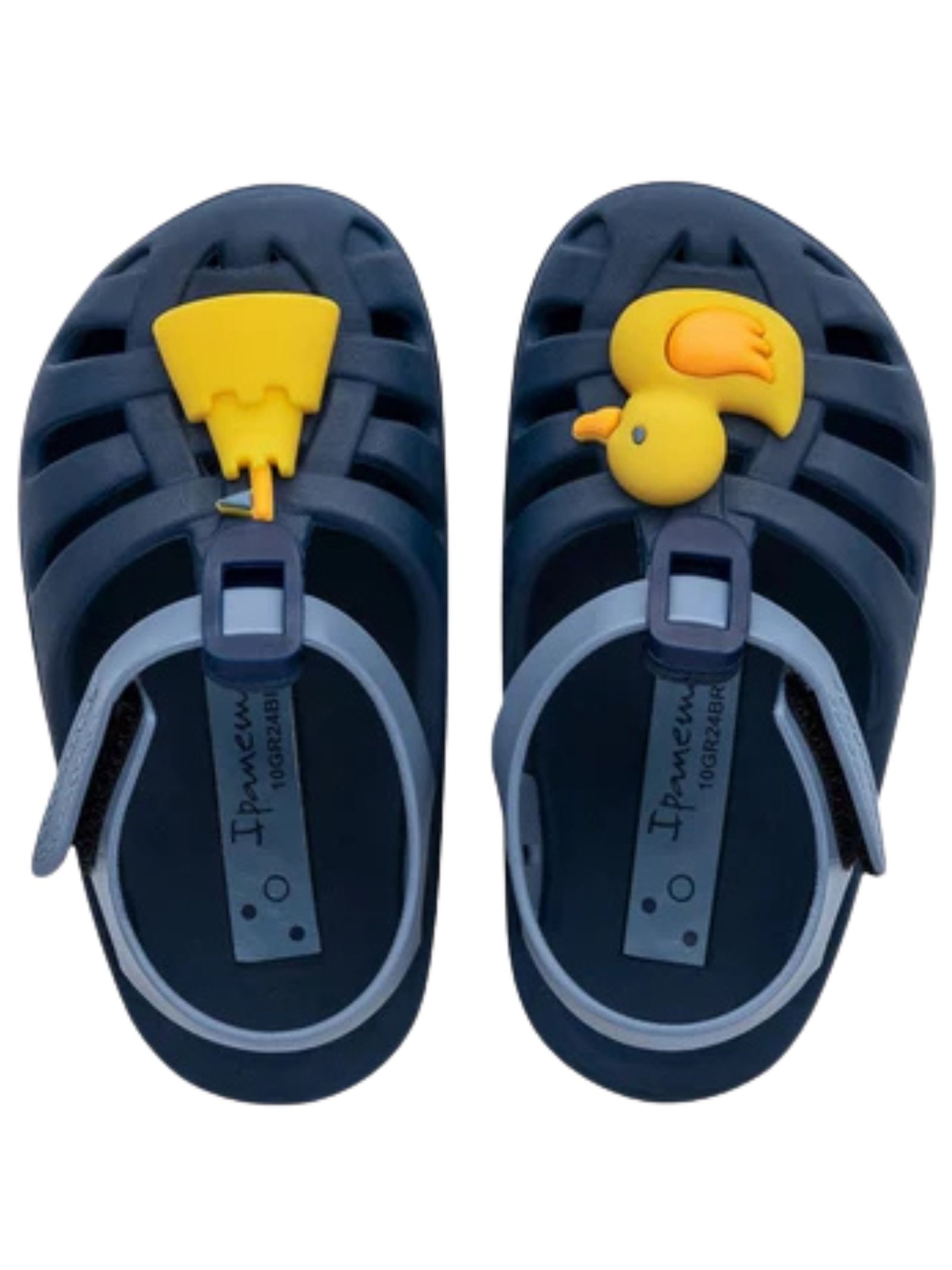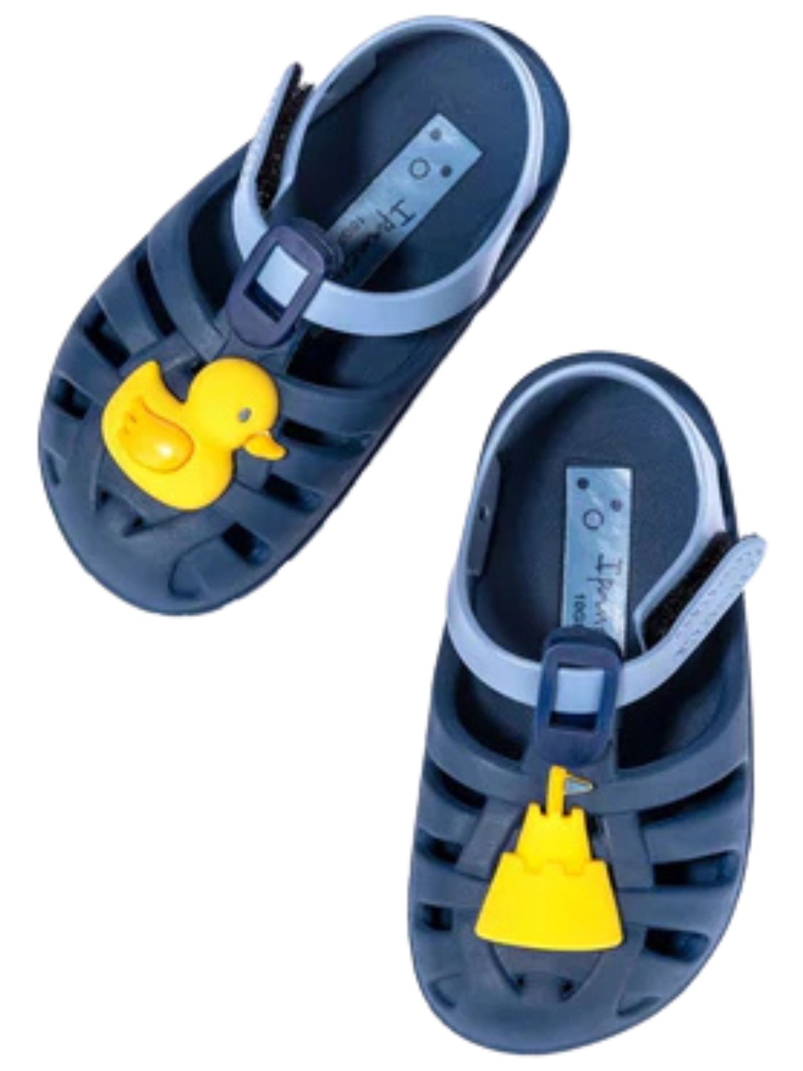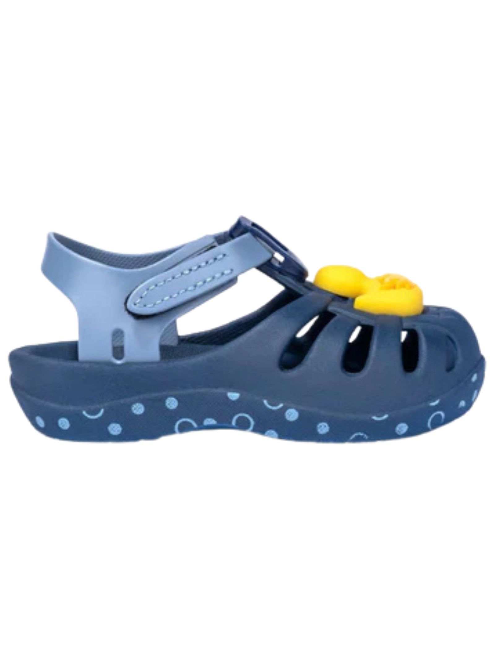 Sandali blu Ipanema Kids con dettagli gialli a contrasto, realizzati in Flexpand, un materiale riciclabile vegano al 100%, chiusura regolabile in velcro e suola anatomica per un maggiore comfort. Prodotto in Brasile.