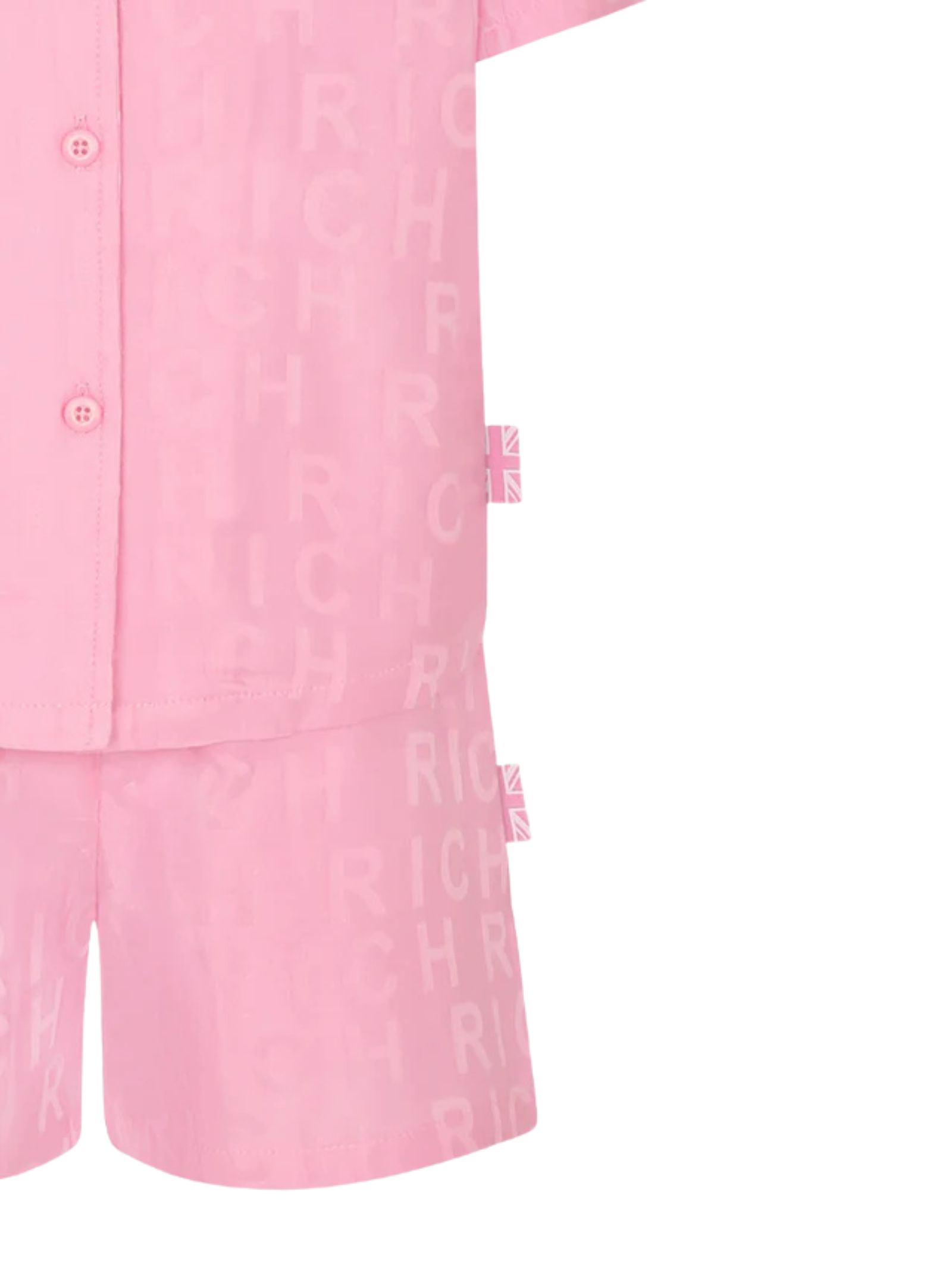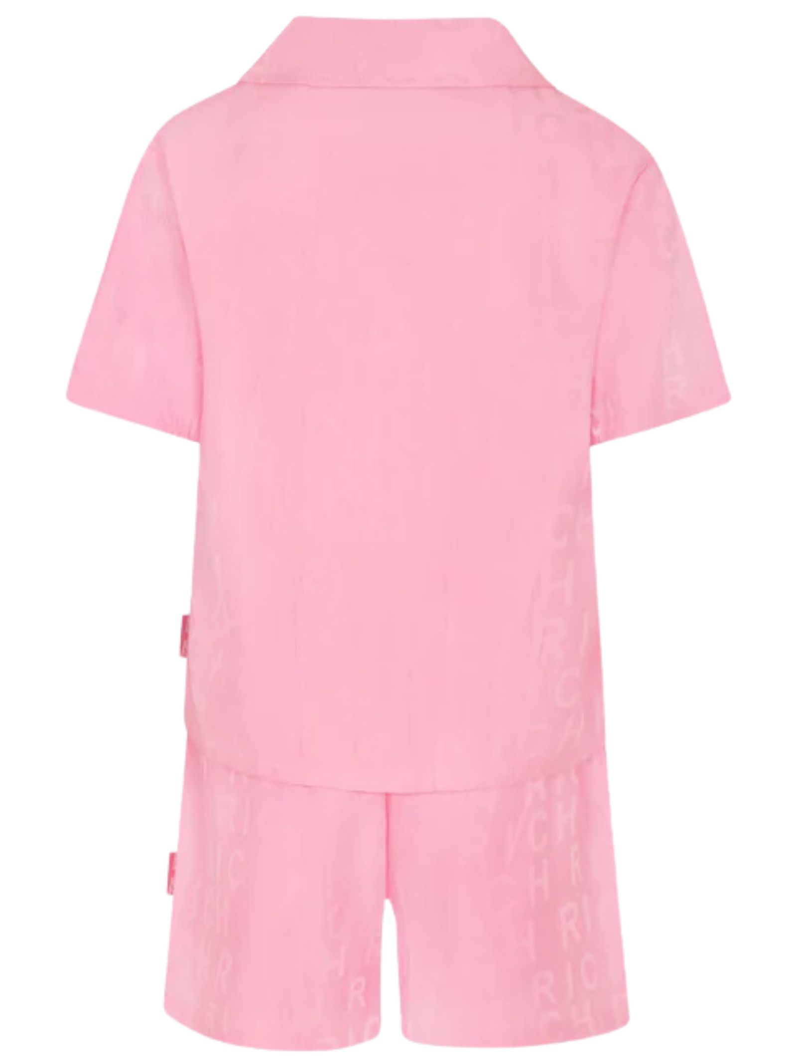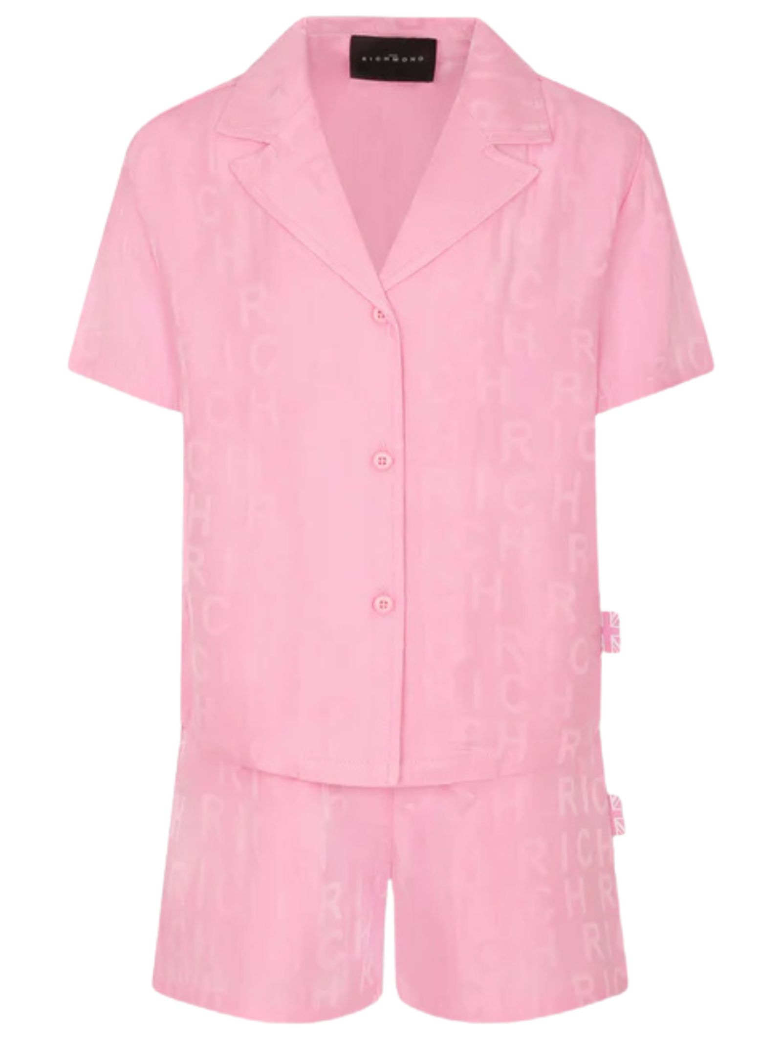 Jhon Richmond Kids completo di colore rosa in misto cotone, logo all-over, composto da camicia a maniche corte, con colletto e revers e chiusura frontale con bottoni; shorts con vita elasticizzata e tasche laterali, decorato con logo jacquard all-over. Composizione: 50% cotone 50% viscosa