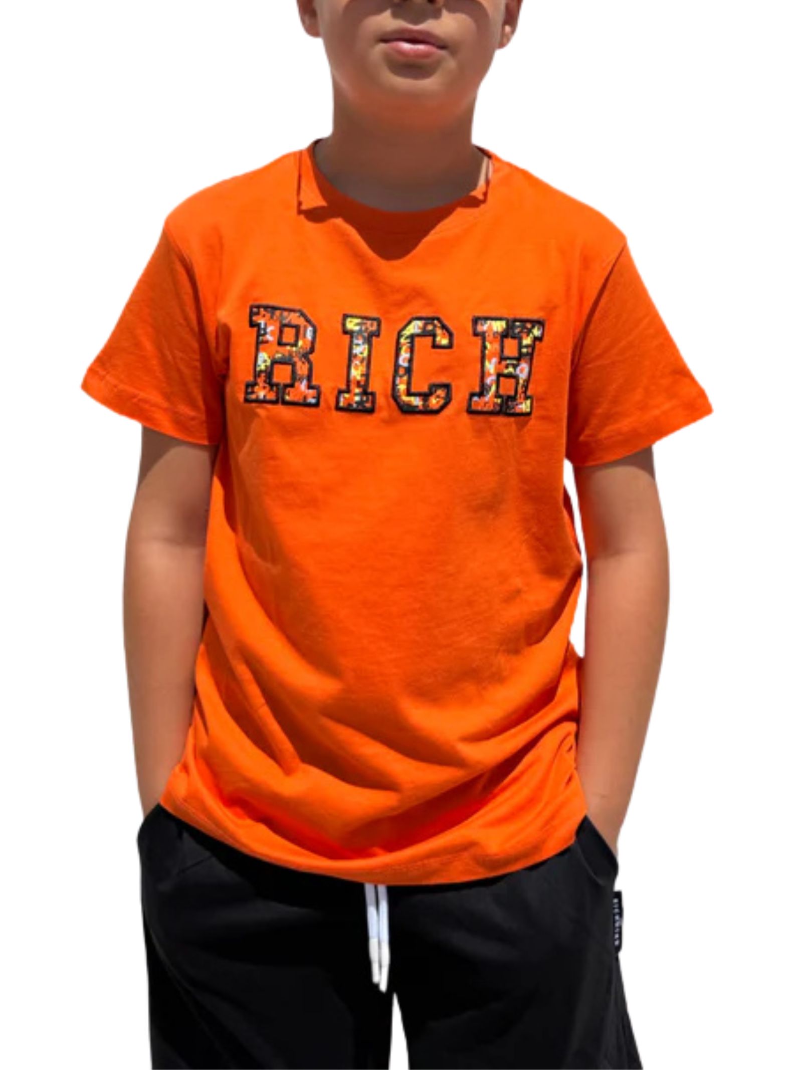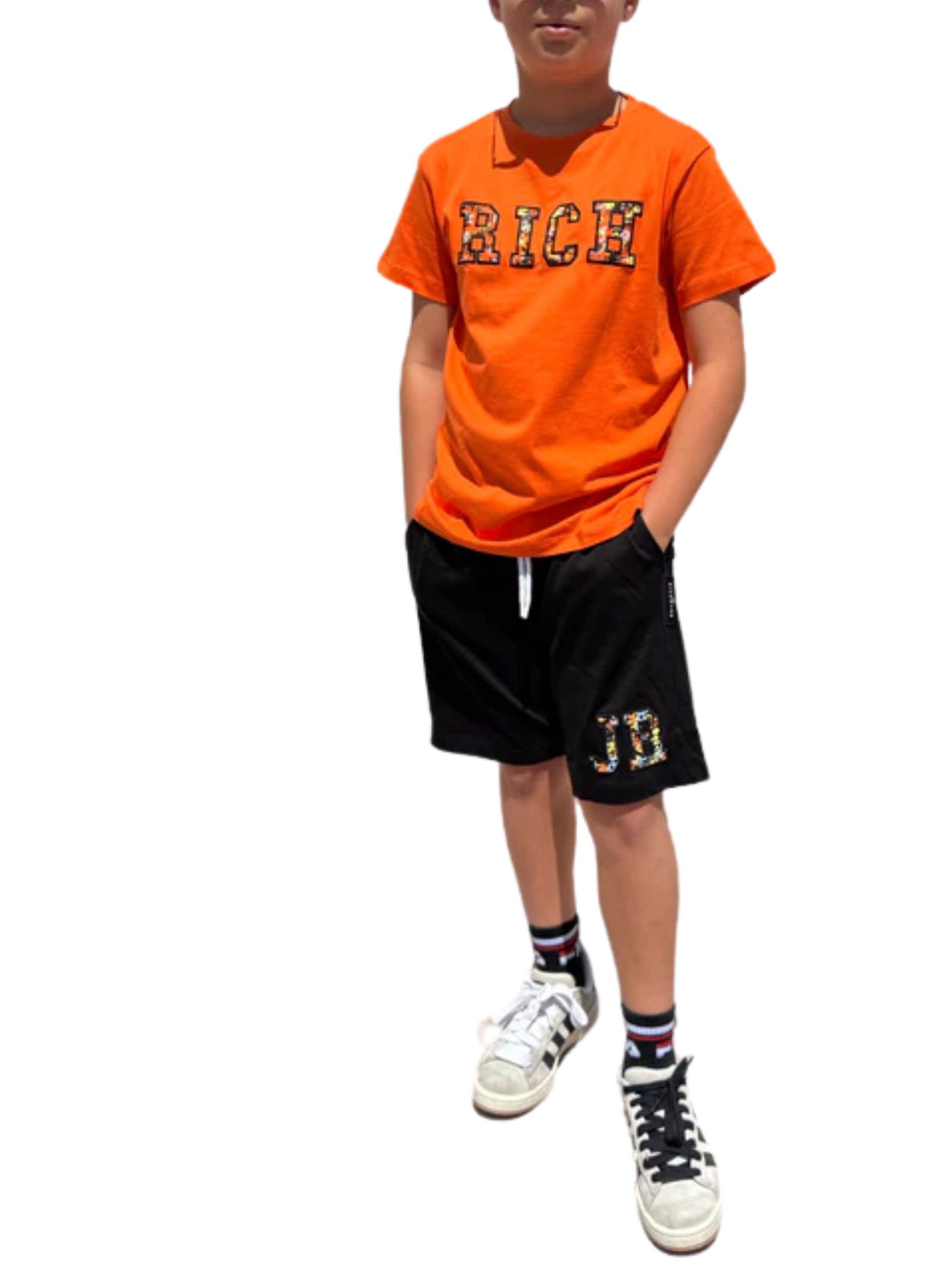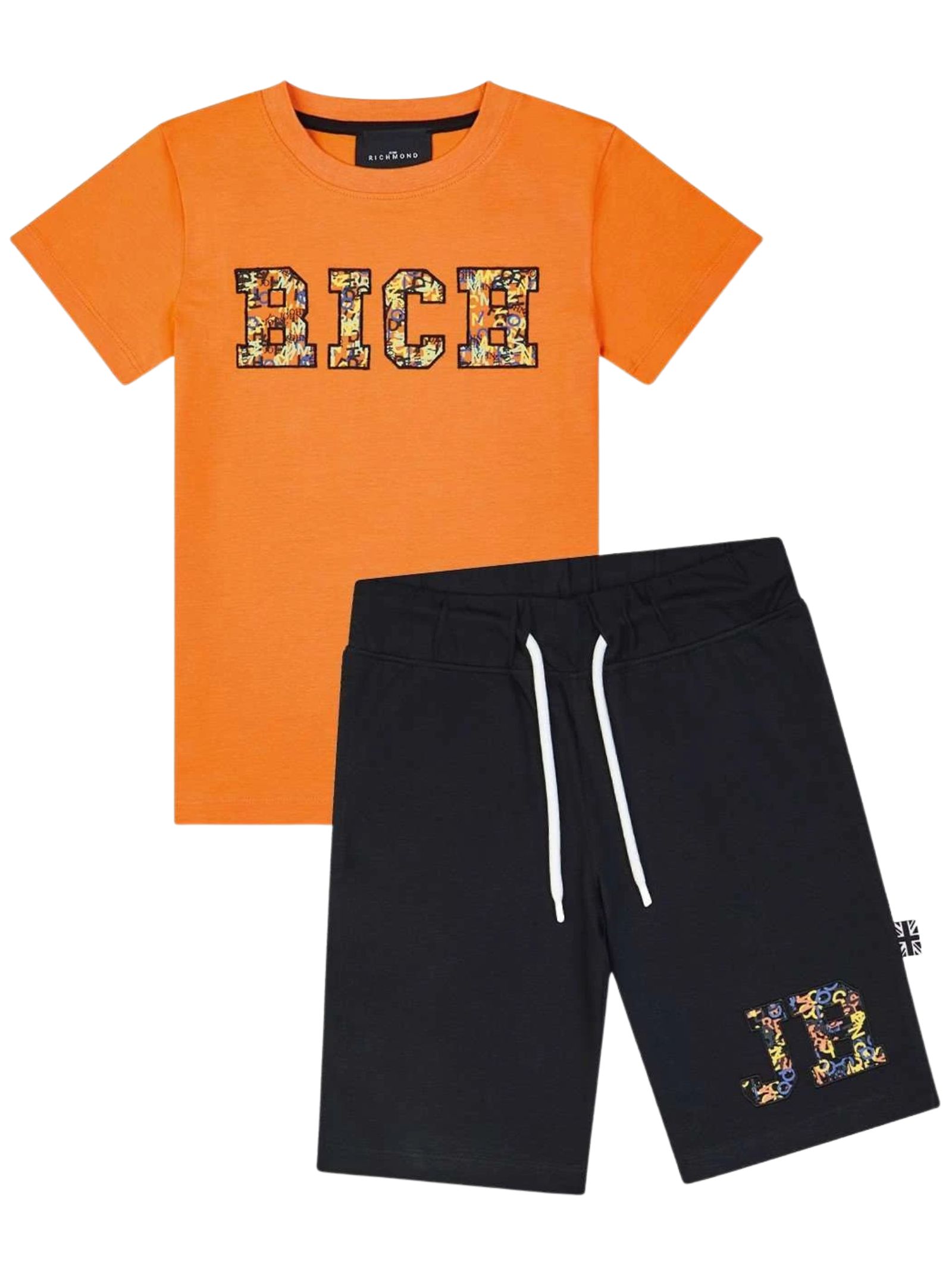 Jhon Richmond Kids completo di colore arancio/nero composto da t-shirt girocollo, mezza manica, ricamo logo a contrasto multicolor; shorts abbinato con elastico in vita e coulisse, due tasche, vestibilità regolare. Composizione: 100% cotone