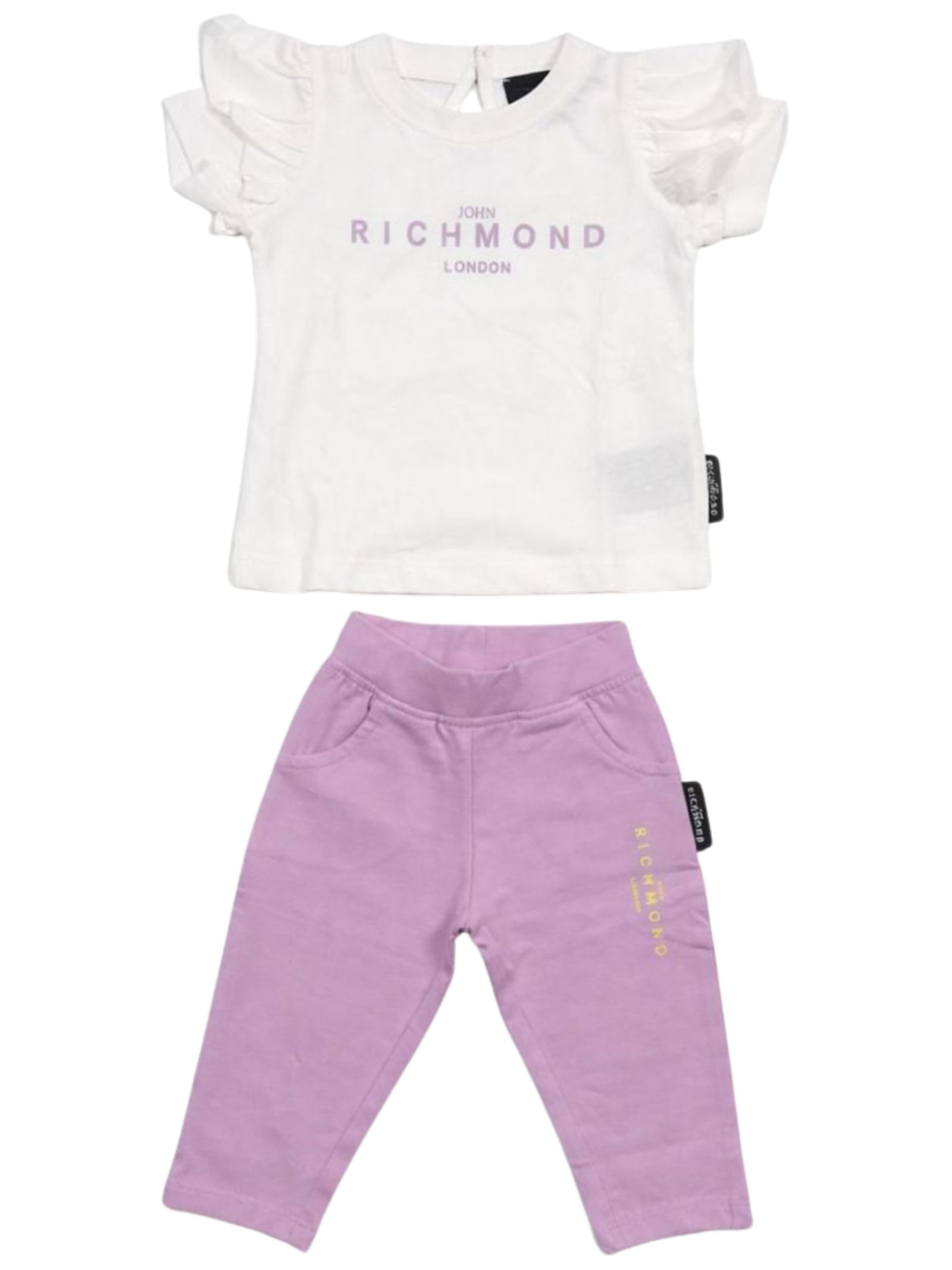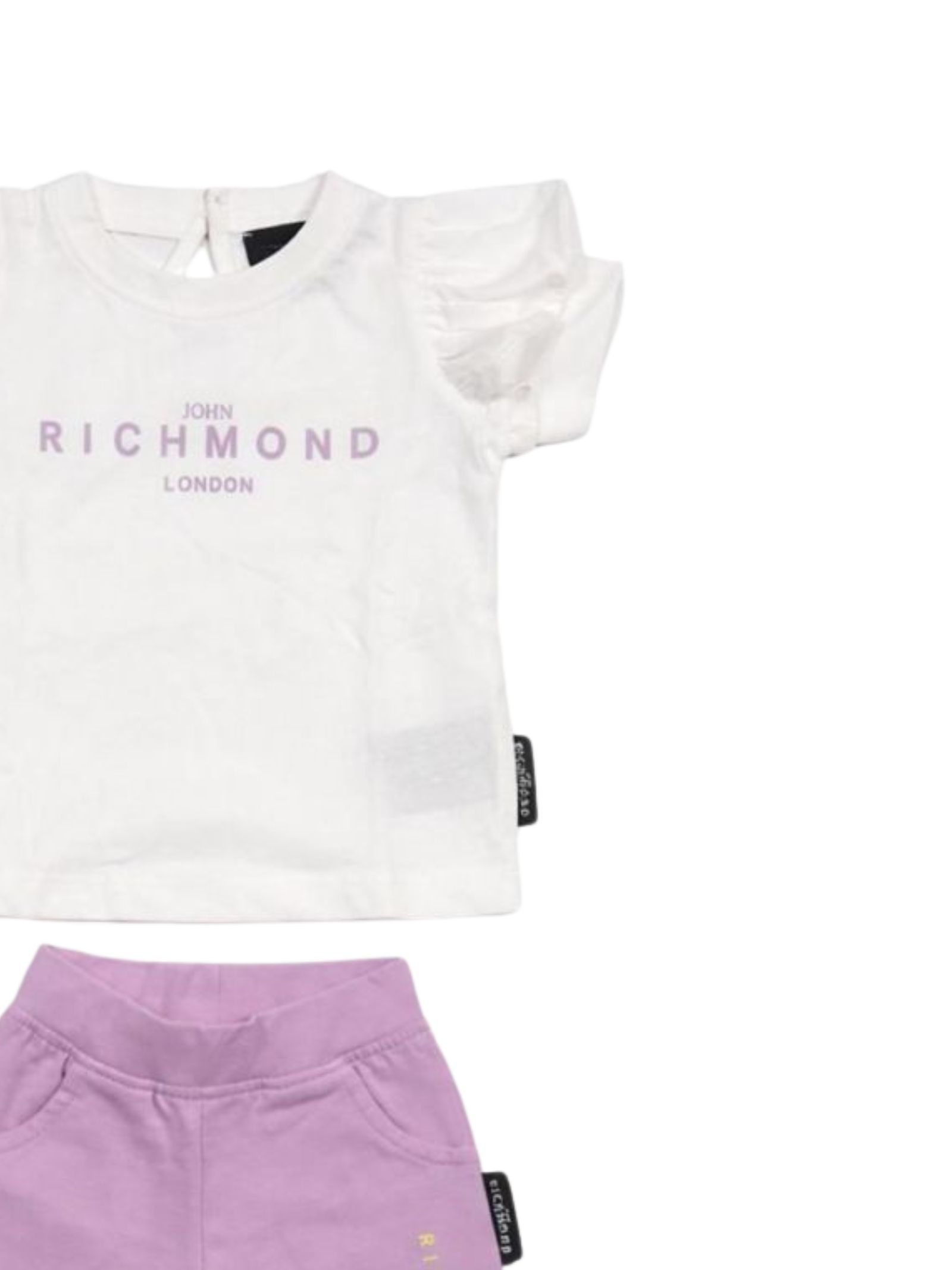Completo bianco/lilla per bambini Jhon Richmond composto da una maglietta girocollo, maniche corte con volant e stampa del logo a contrasto; pantaloni abbinati con elastico in vita, due tasche e vestibilità slim. Composizione: 100% cotone.