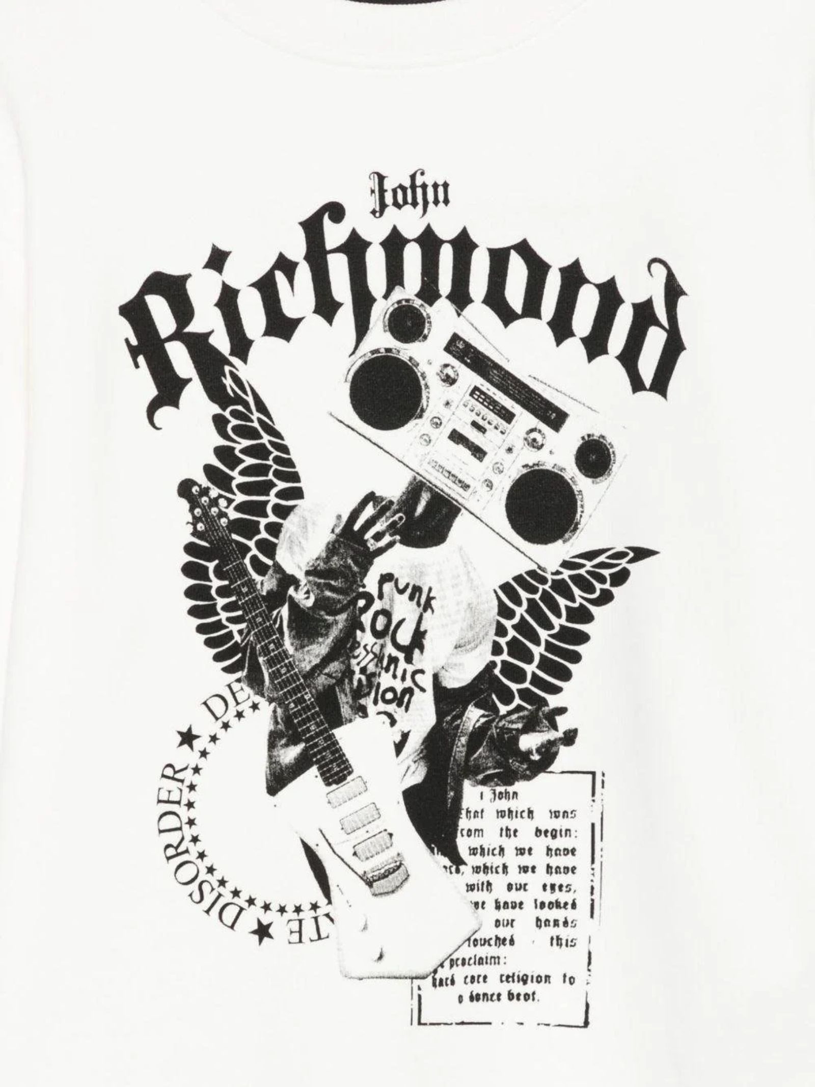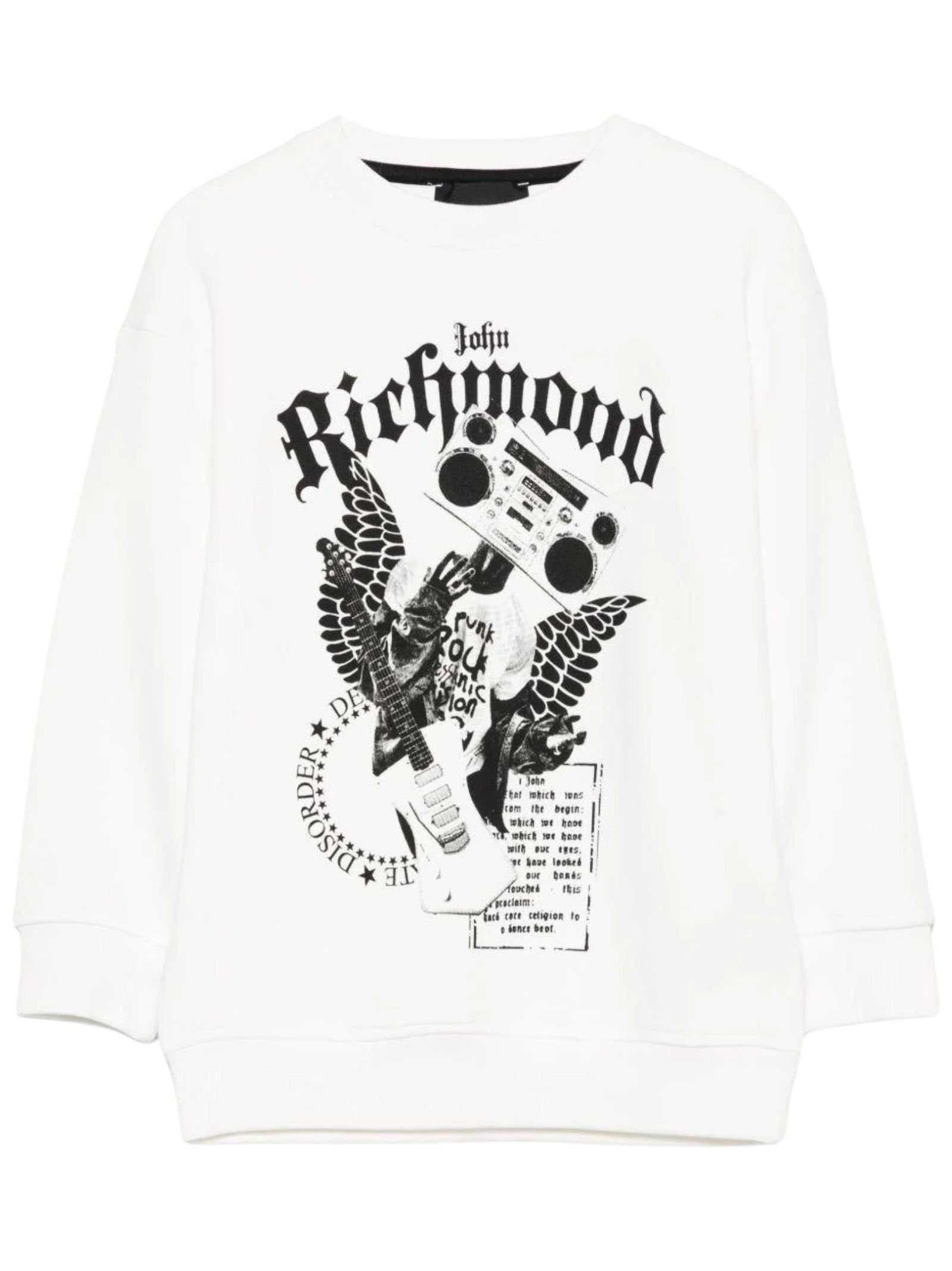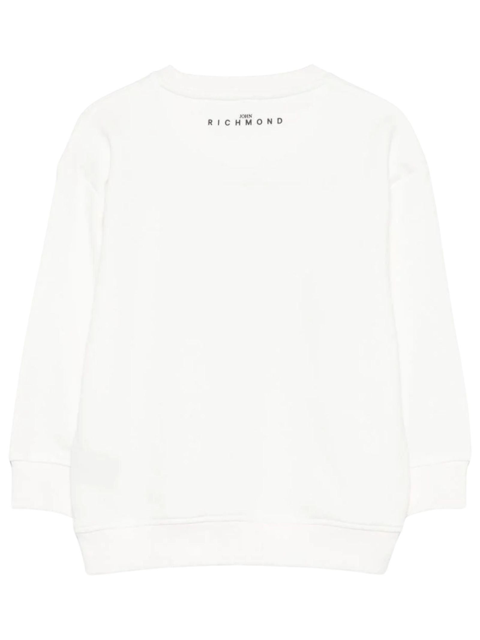 Jhon Richmond Kids felpa di colore bianco, modello girocollo, maniche lunghe, stampa logo centrale a contrasto nero, orli a costine, vestibilità regolare. Composizione: 86% cotone 14% poliestere