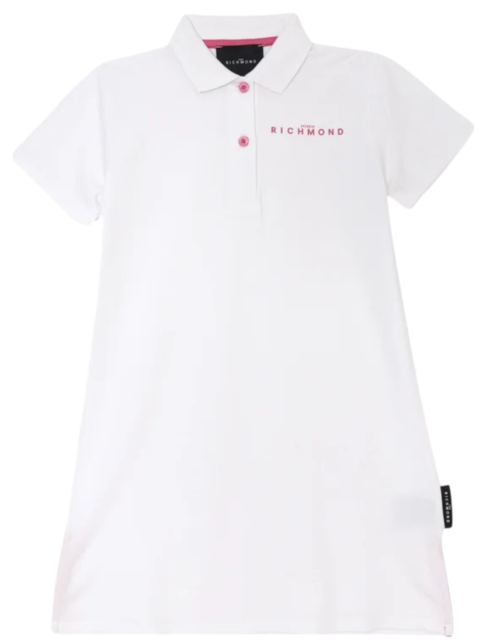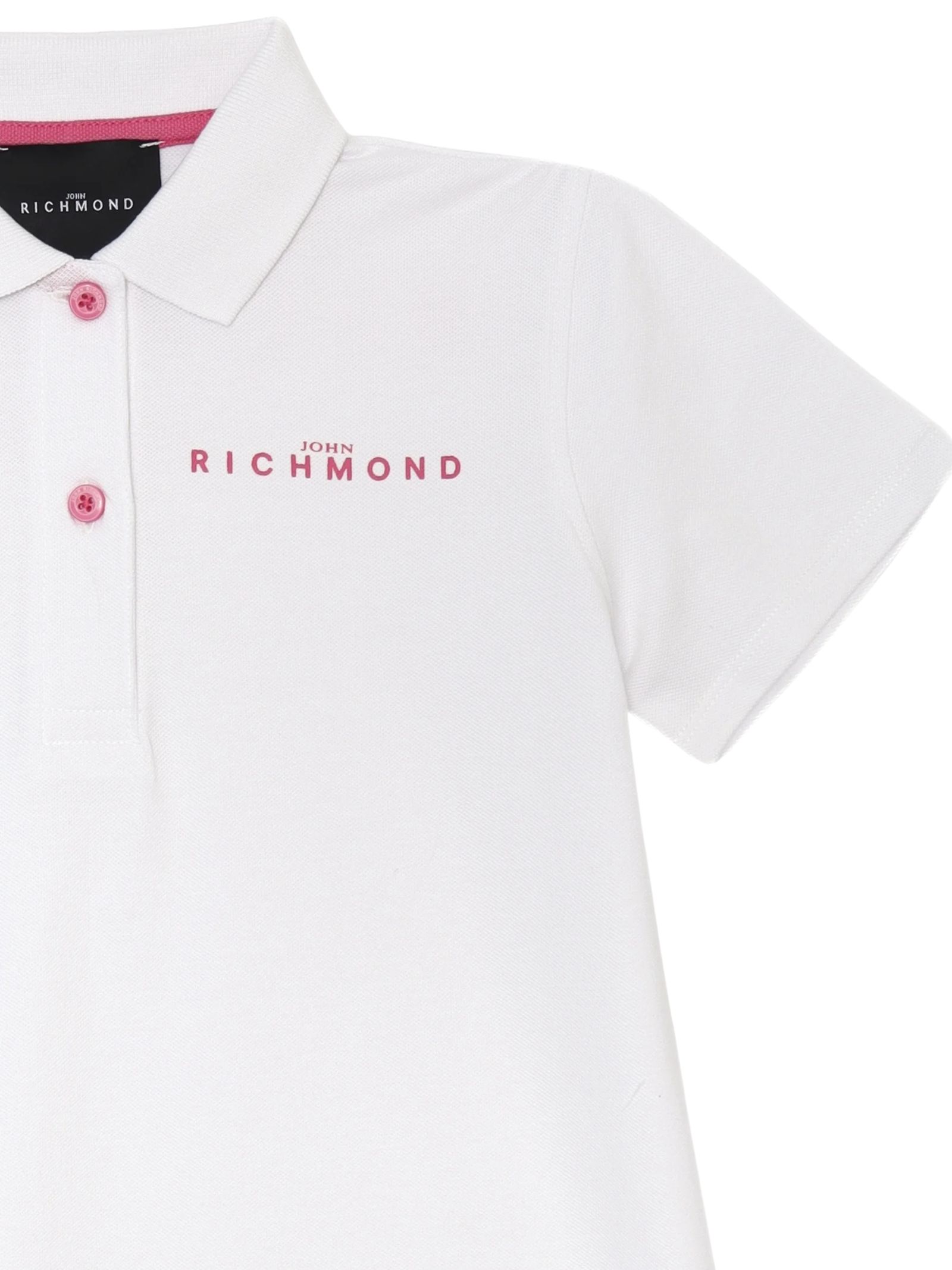 Abito bianco Jhon Richmond Kids, realizzato in cotone piquet, con dettagli rosa a contrasto, maniche corte, colletto polo, logo su entrambi i lati, design svasato. Composizione: 95% cotone, 5% elastan.