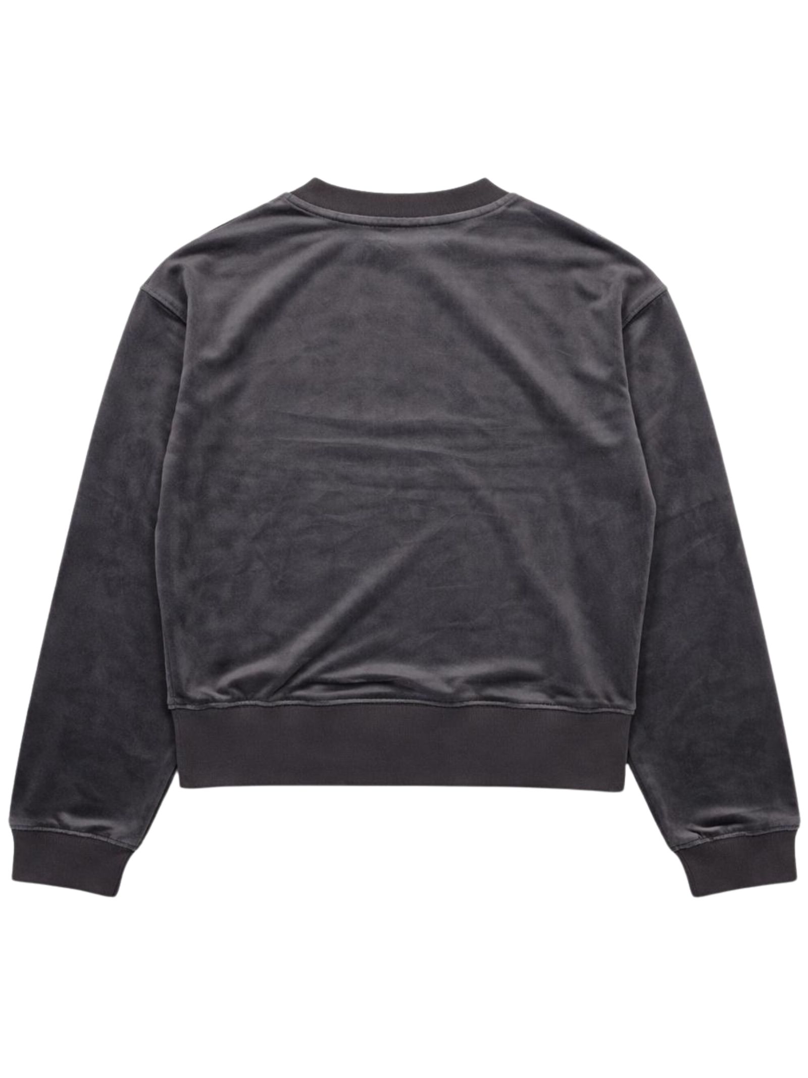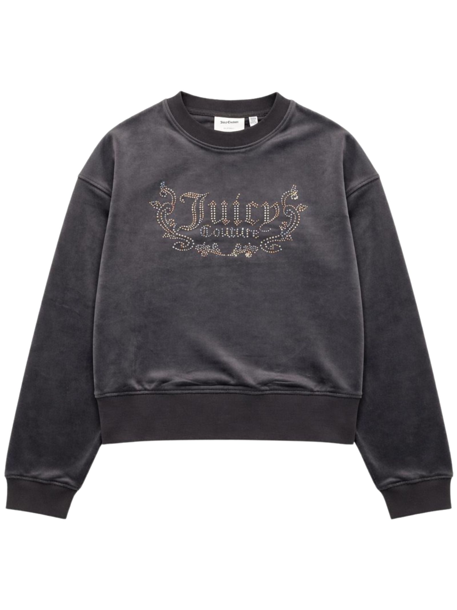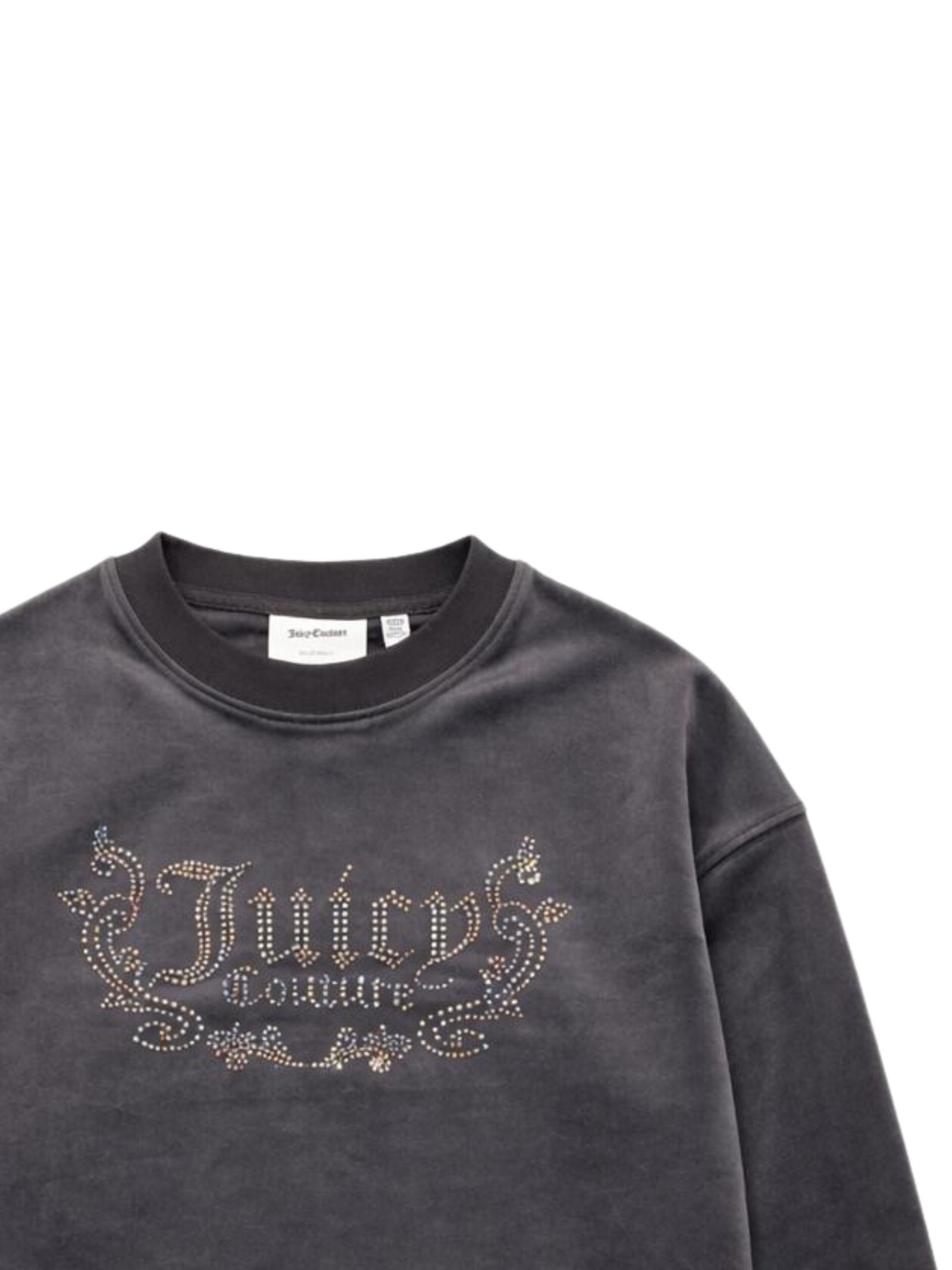 Juicy Couture Kids felpa di colore grigio, morbido tessuto effetto velluto, maniche lunghe, girocollo, polsini, orlo a costine, decorata con applicazione logo in strass, vestibilità regolare. Composizione: 95% poliestere 5% elastan