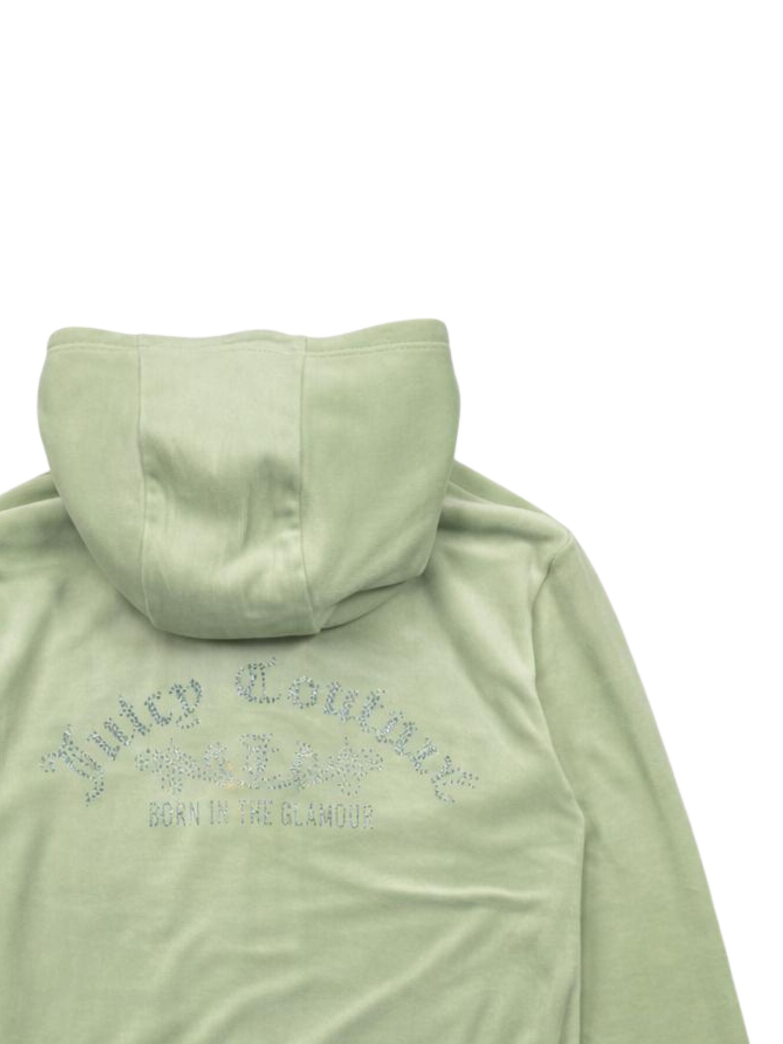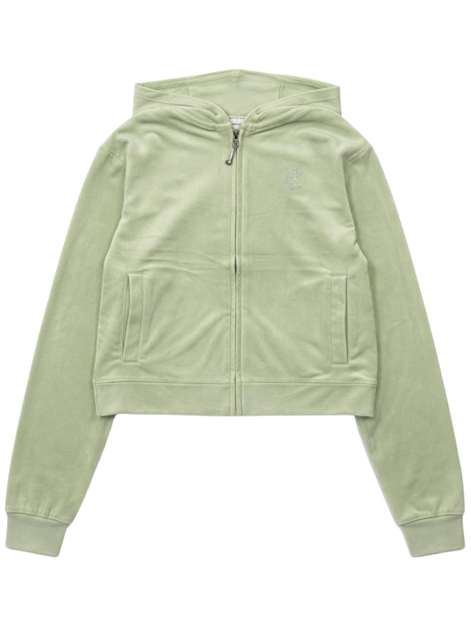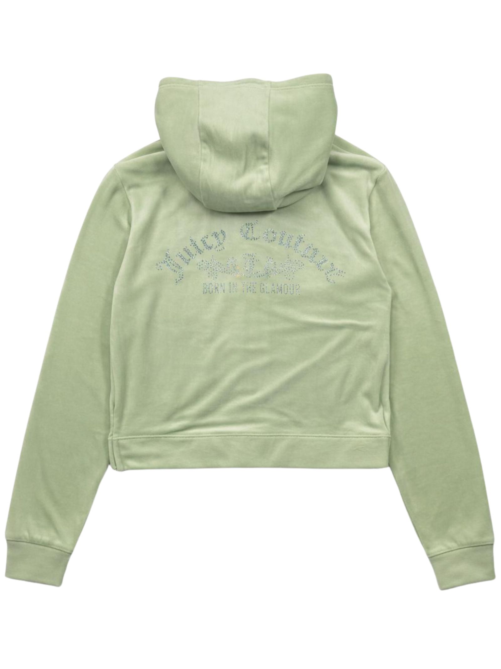 Juicy Couture Kids felpa di colore verde, morbido tessuto effetto velluto, maniche lunghe, cappuccio, zip, orlo a costine, decorata con applicazione logo in strass sul petto e sul retro, due tasche, design corto, vestibilità regolare. Composizione: 95% poliestere 5% elastan