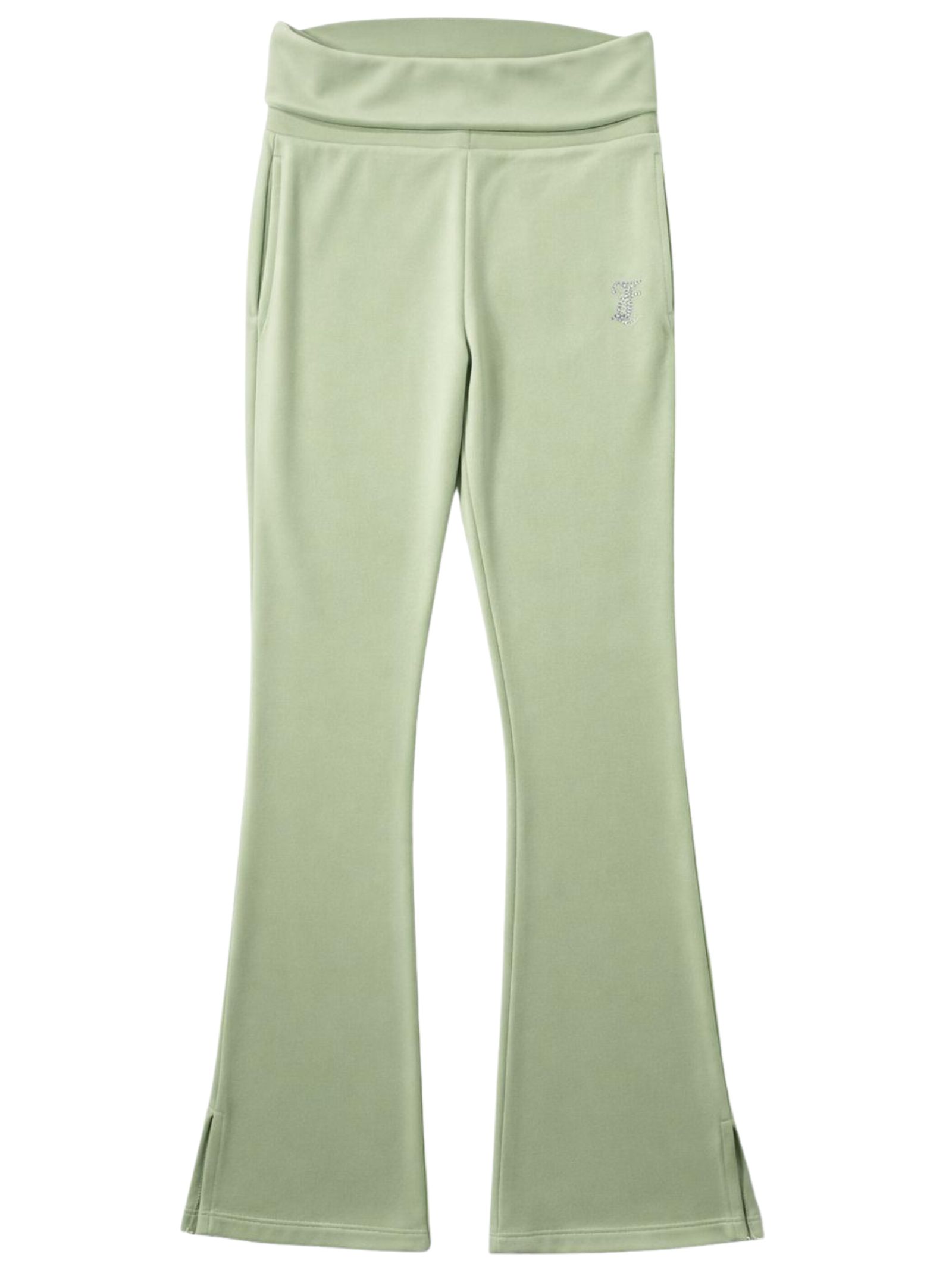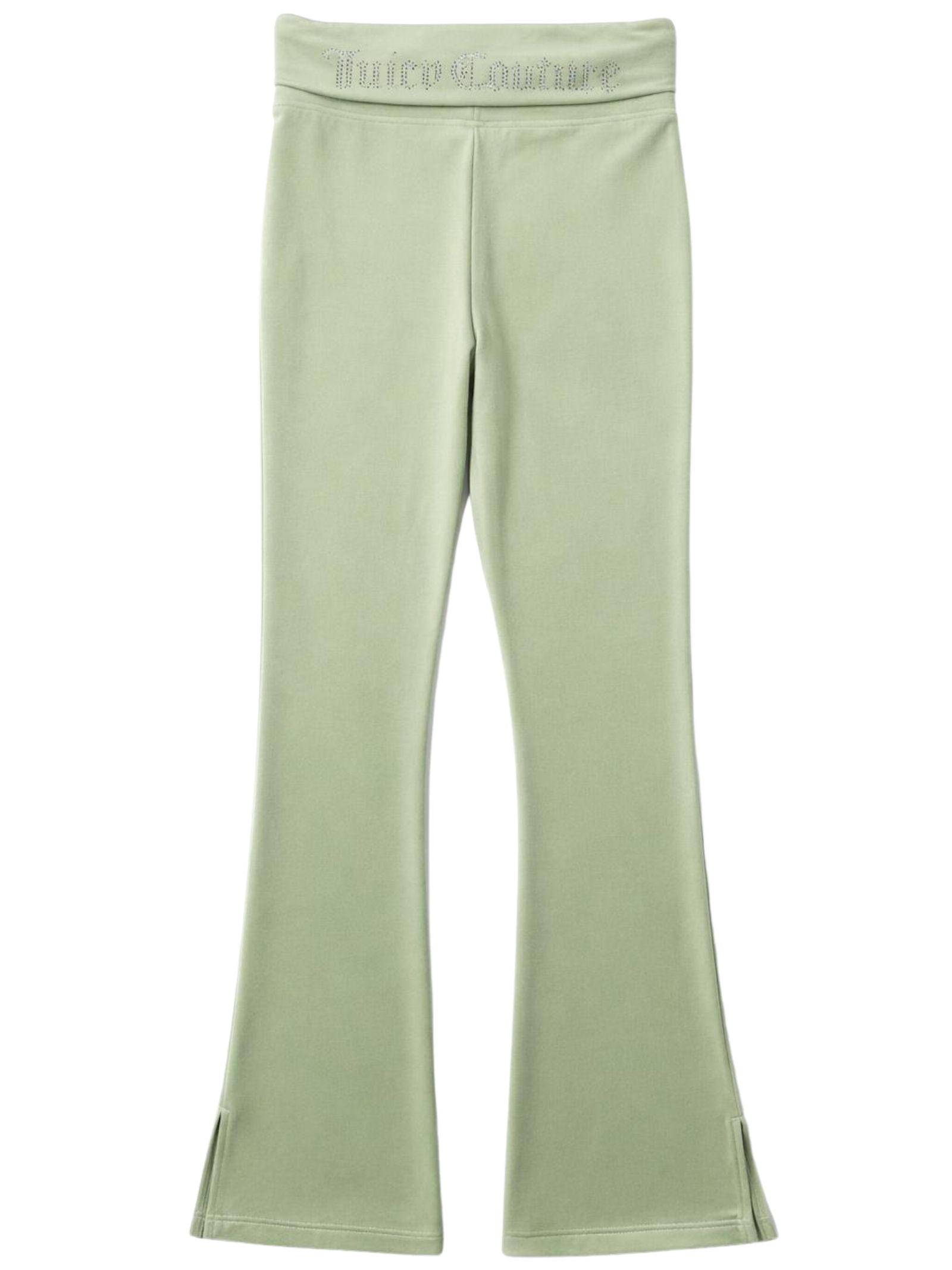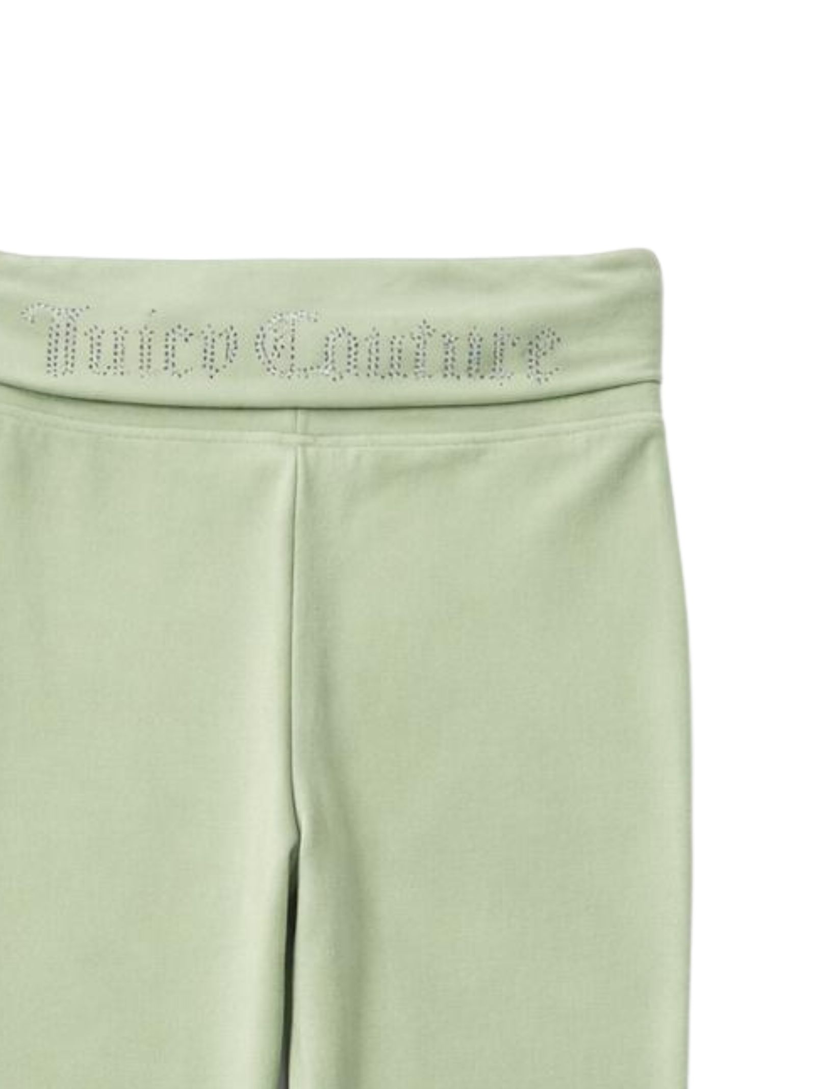 Juicy Couture Kids pantalone di colore verde, morbido tessuto effetto velluto, elastico in vita con piega, due tasche, applicazione logo in strass, vestibilità aderente con gamba a zampa, spacchetti laterali. Composizione: 95% poliestere 5% elastan