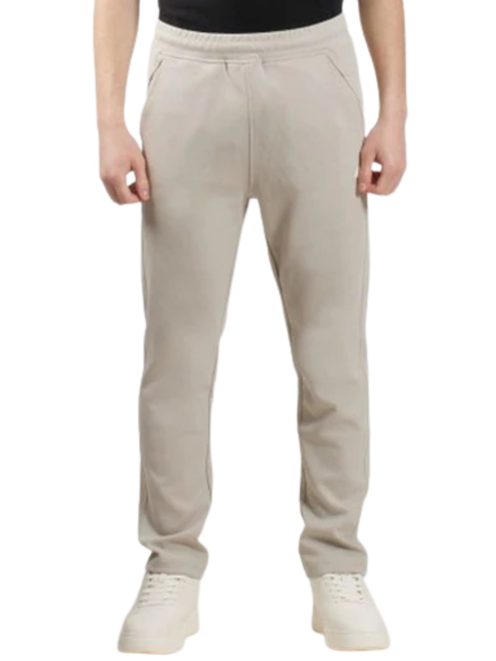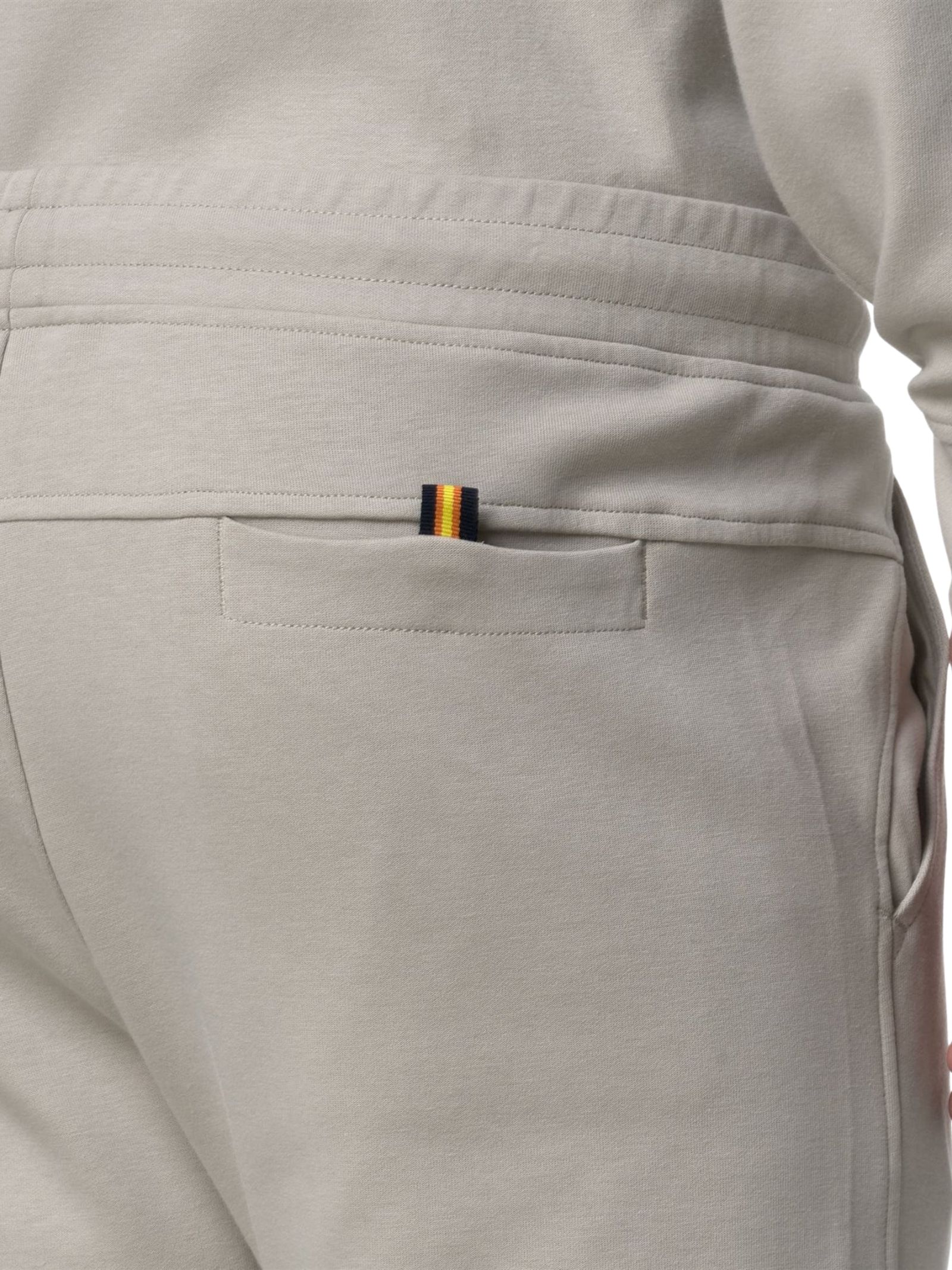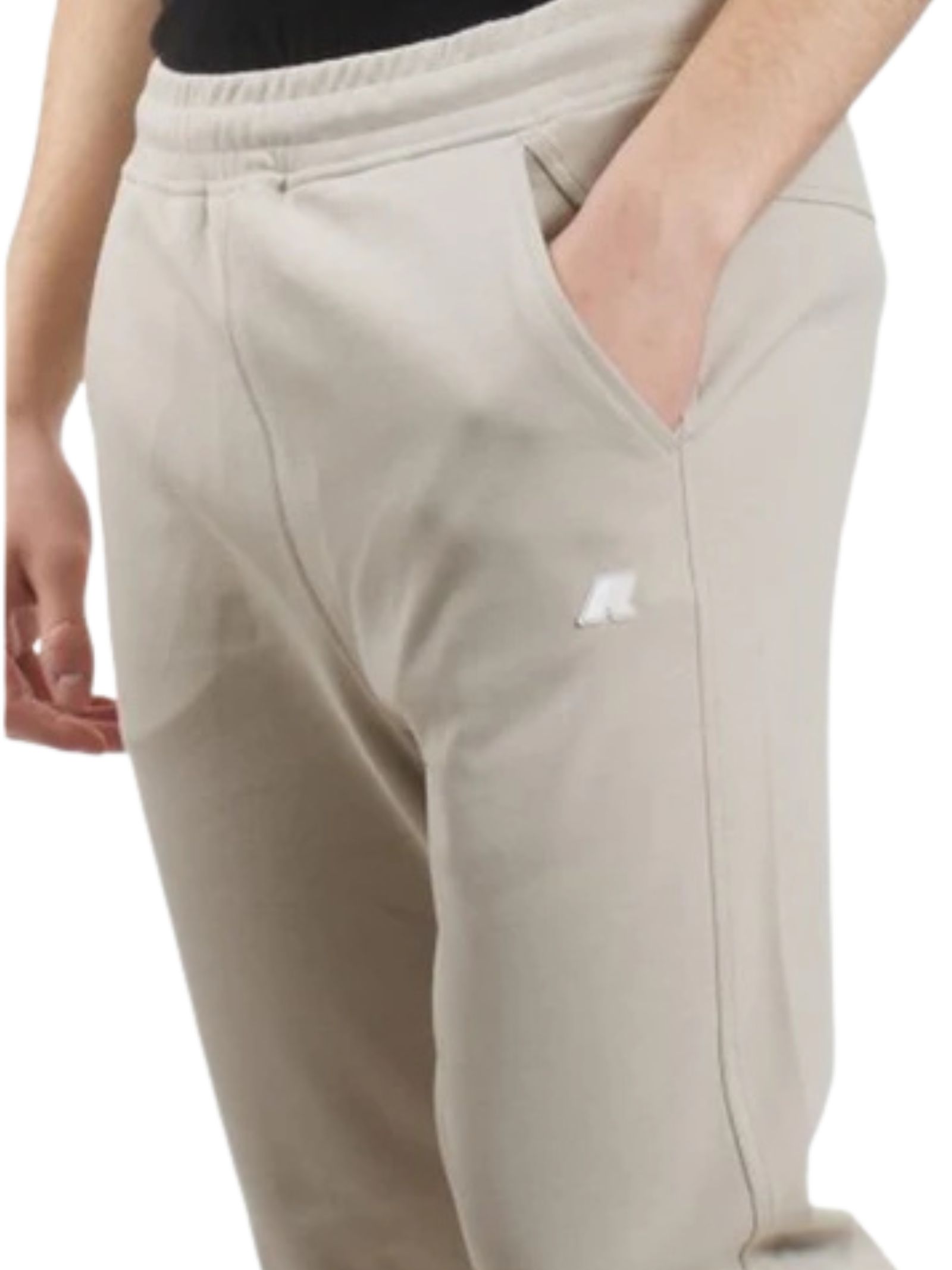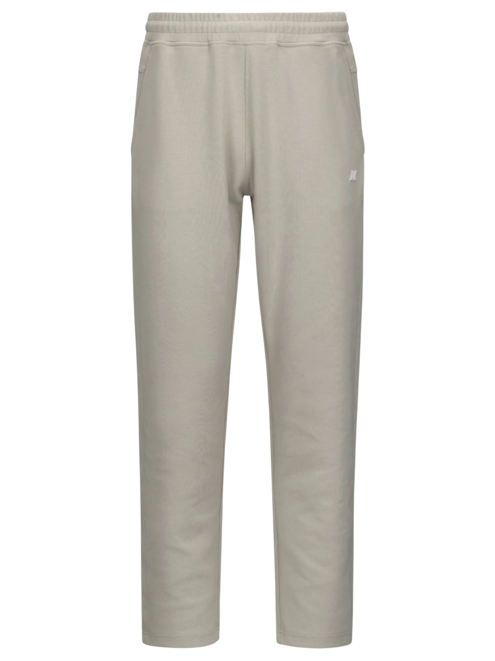 K-Way Kids pantalone di colore beige, modello con due tasche laterali, uma tasca a fessura sul retro, patch logo applicato, vita elastica con coulisse interna, vestibilità regolare. Composizione: 80% cotone 14% poliestere 6% elastan