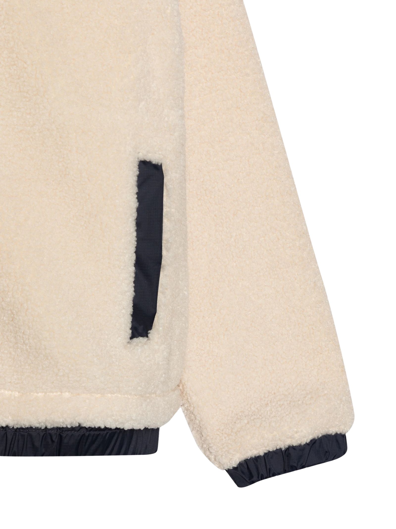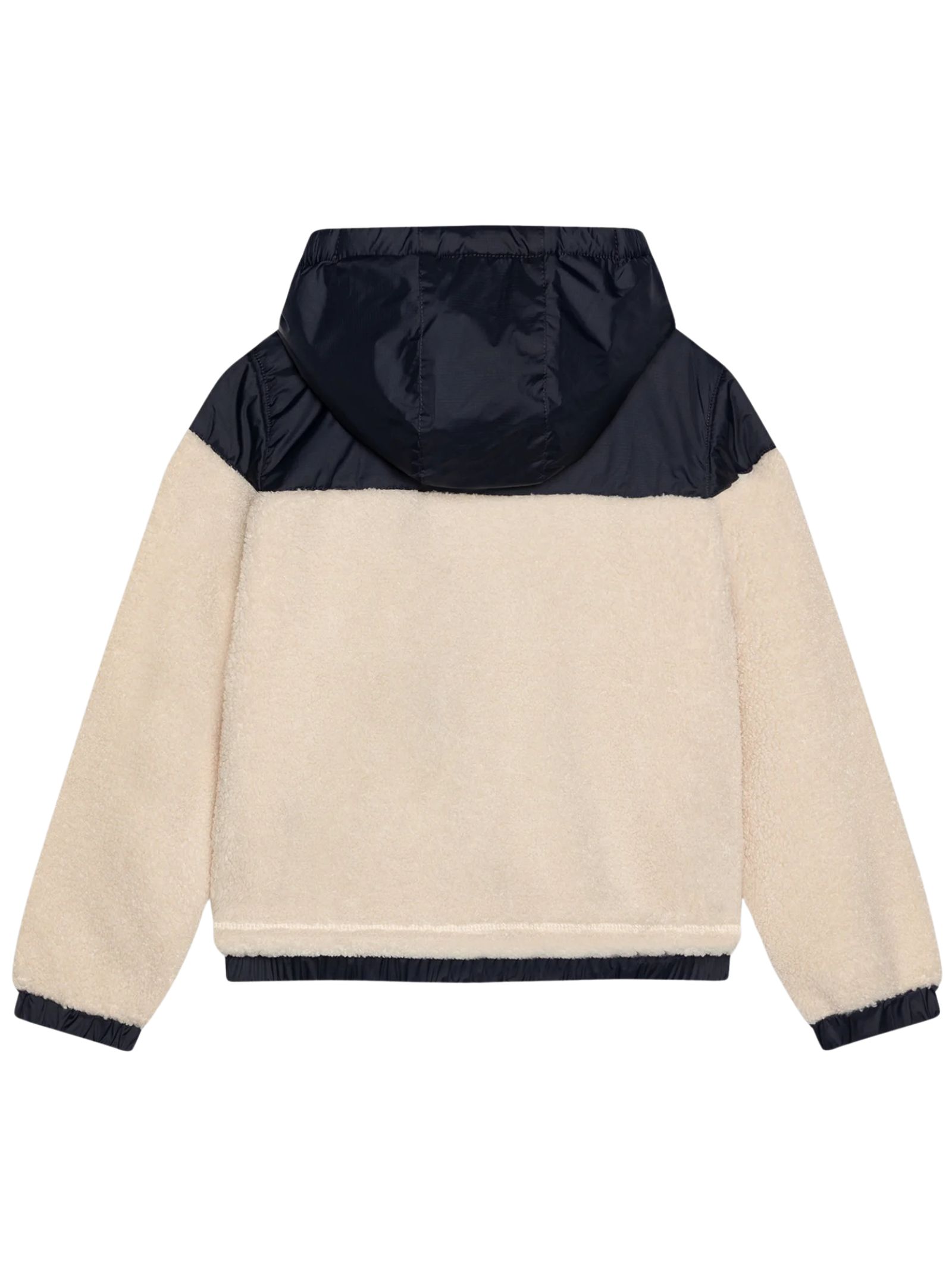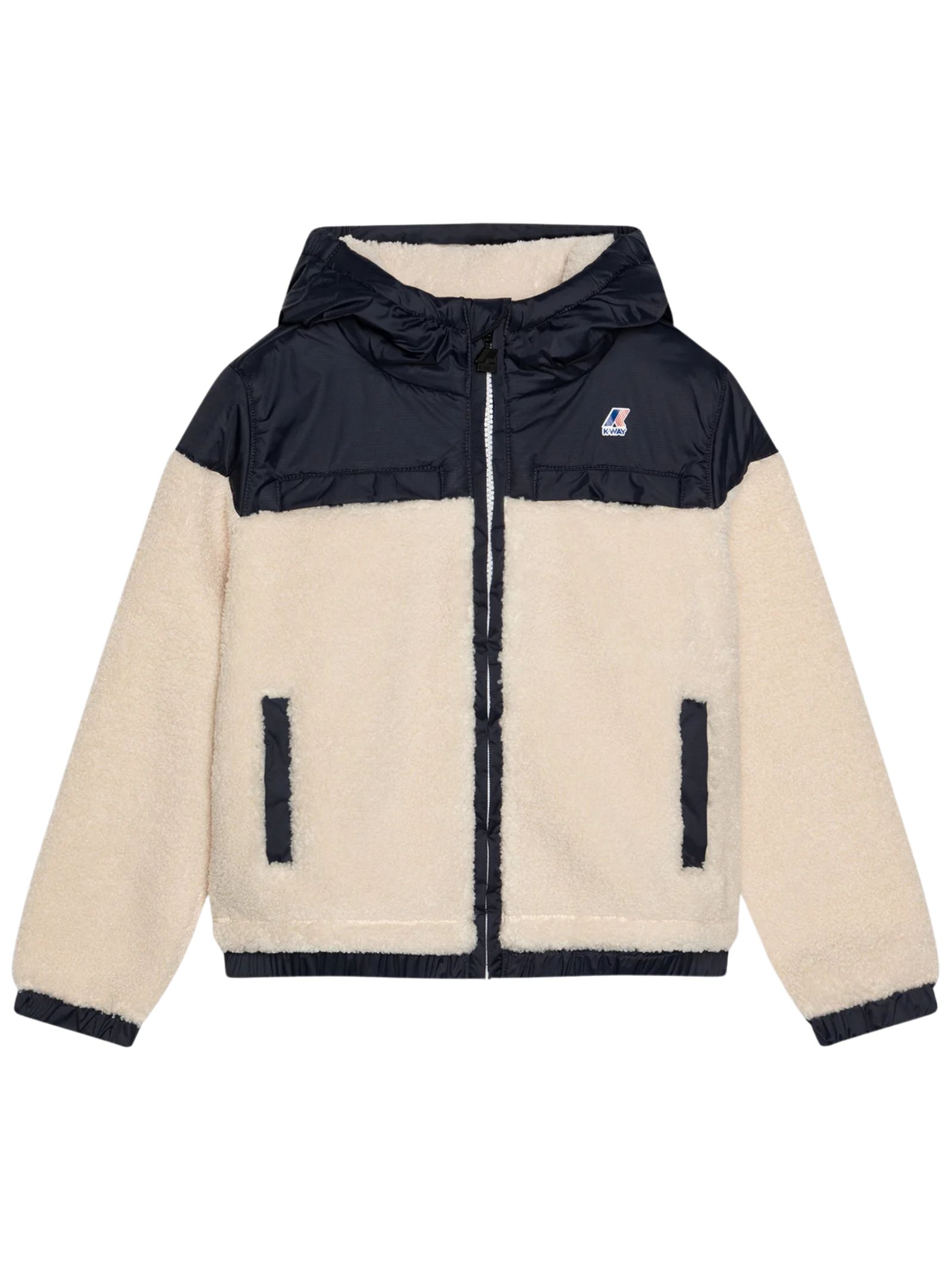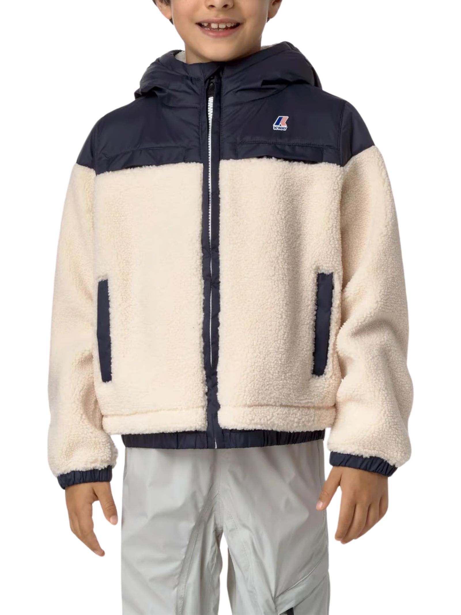 K-Way Kids giubbino Jildaz di colore panna/blu, realizzato in tessuto soffice effetto sherpa intervallato da applicazioni in nylon che danno resistenza e un tocco tecnico al look, cappuccio con elastici fissi, chiusura con zip, patta interna antivento, polsi con elastico, 2 tasche, taschino verticale sul petto, fondo con elastico interno, fitting regolare, logo stampato multicolor. Composizione: 100% Poliestere
