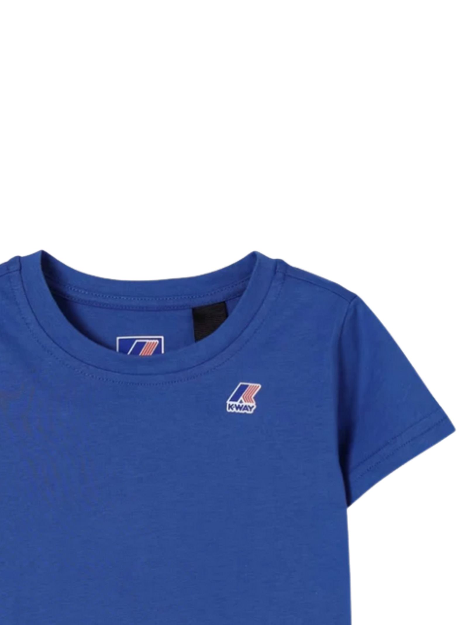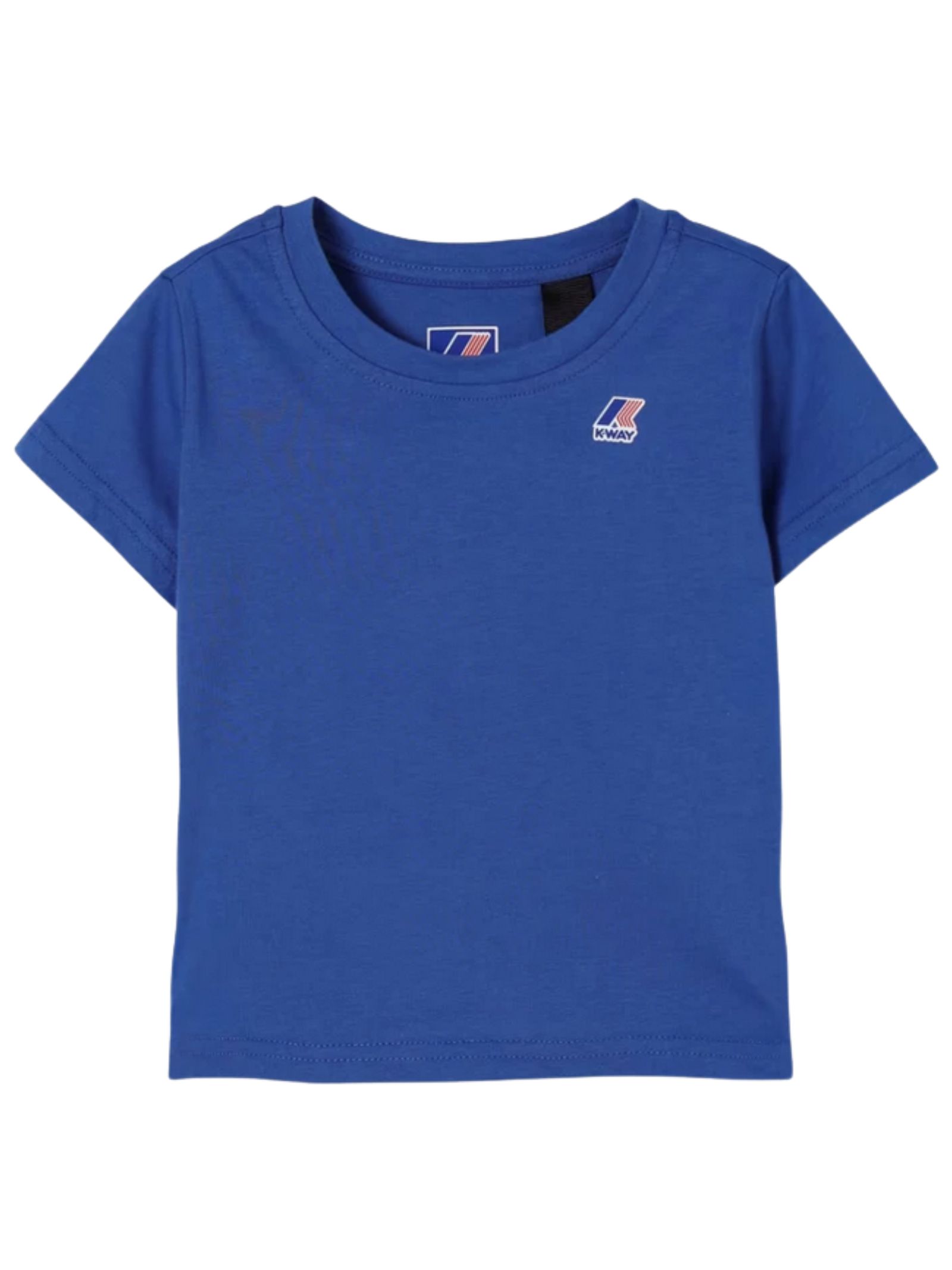K-Way Kids t-shirt di colore blu, modello girocollo, mezze maniche, stampa logo sul petto a contrasto, vestibilità regolare. Composizione: 100% cotone