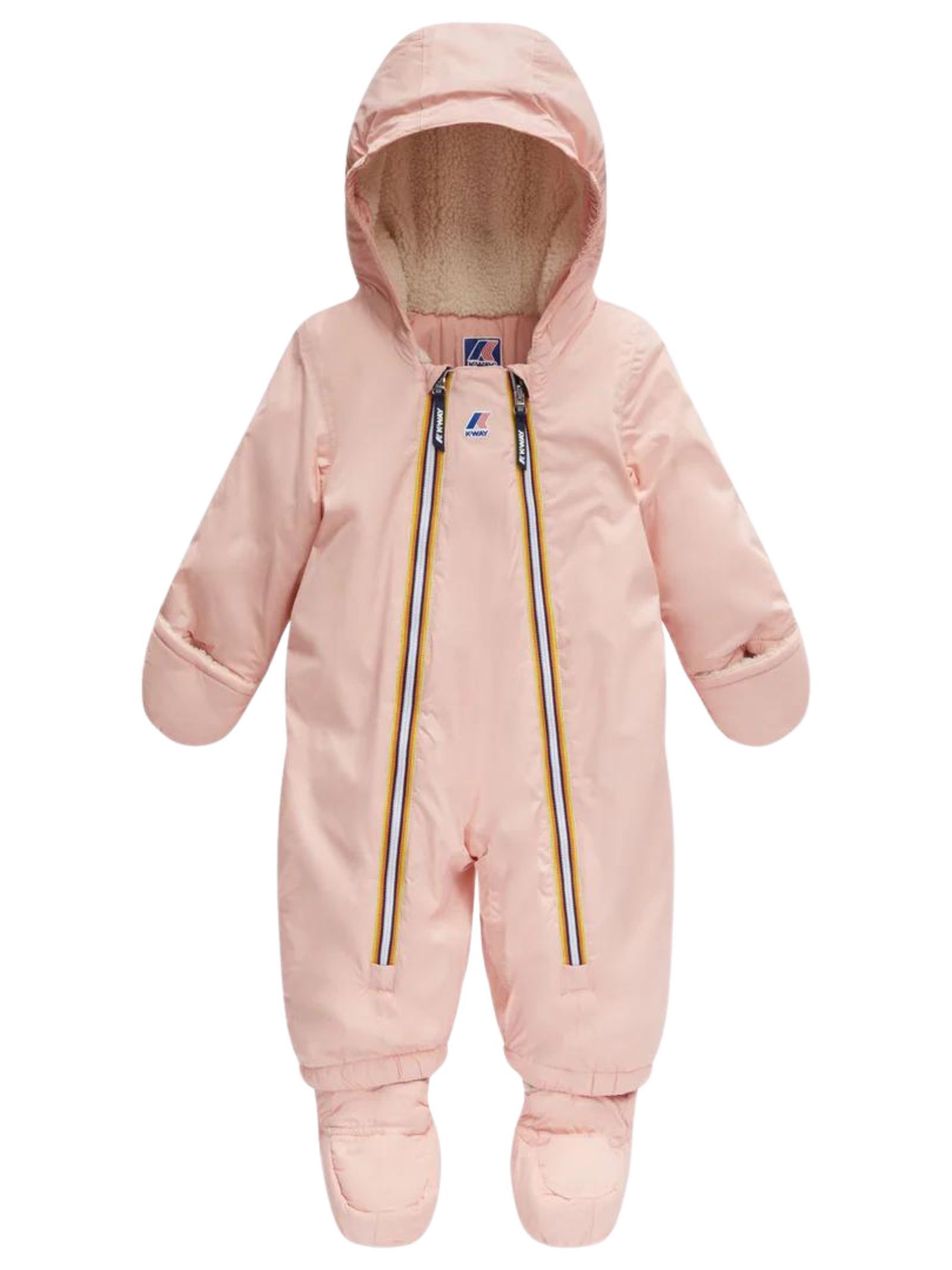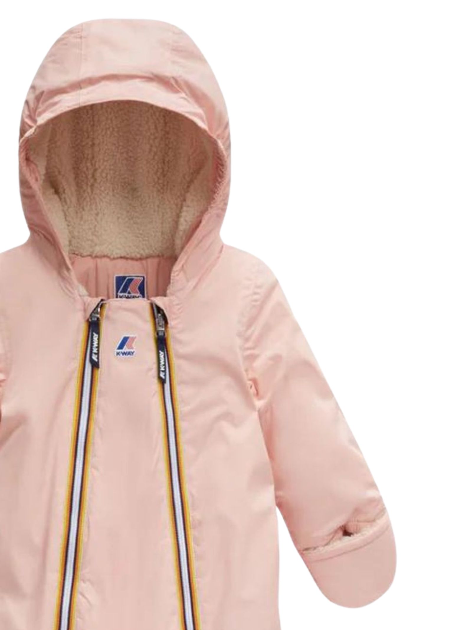K-Way Kids Tuta Eskimo Le Vrai Snotty Orsetto, colore rosa, realizzata in nylon ripstop, fodera in pelliccia sintetica effetto orsacchiotto, cappuccio fisso, cuciture termonastrate, polsi con elastico, imbottitura in ovatta dal peso medio e rivestimento in tessuto soffice effetto sherpa, doppia zip per facilitare l'indossatura, idrorepellente, antivento, traspirante. Guantini e calzini coordinati. Composizione: 100% poliammide