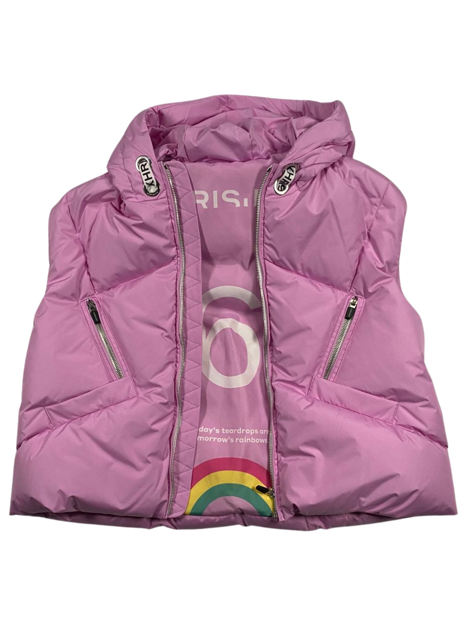 Khrisjoy Kids smanicato di colore rosa, design trapuntato, imbottito, cappuccio con coulisse, chiusura frontale con zip, orlo con zip, due tasche a filetto laterali, fodera integrale stampata. Composizione: 75% poliestere 19% acrilico 6% poliuretano. Imbottitura: 80% piumino d'oca 20% piuma d'oca