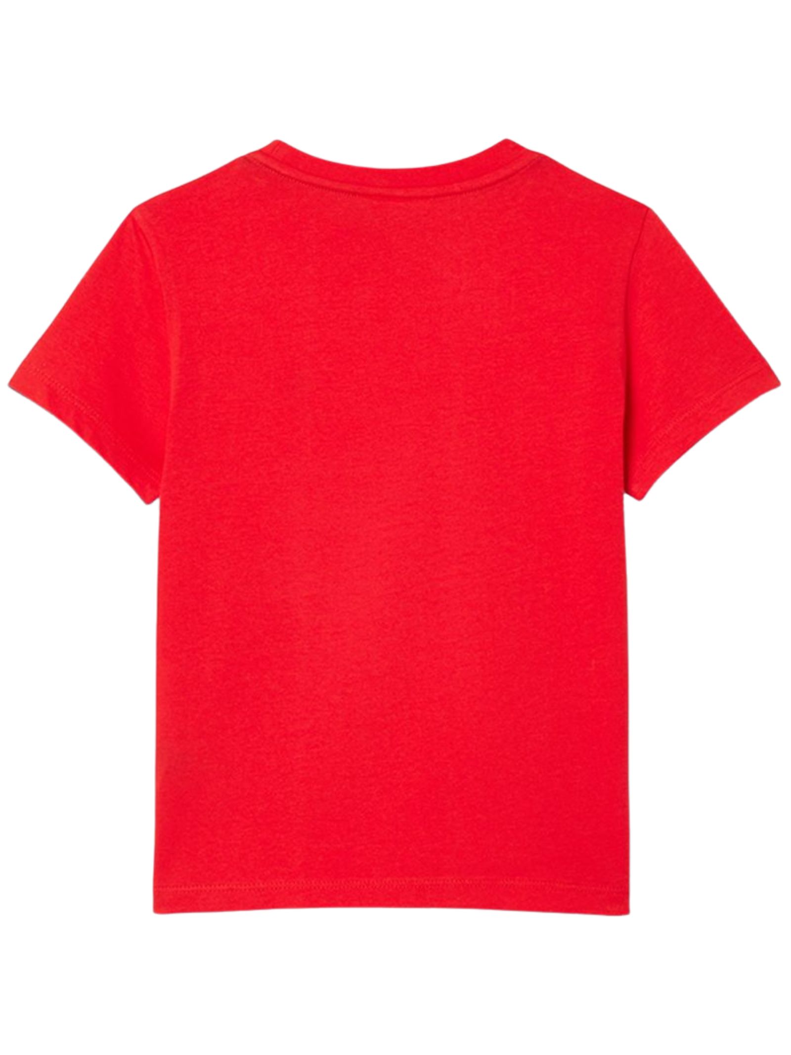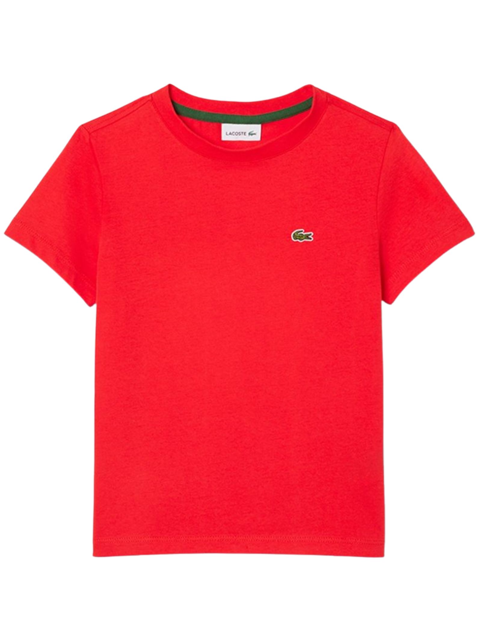 Lacoste Kids t-shirt di colore rosso, modello girocollo, mezza manica, applicazione logo ricamato sul petto, orlo dritto, vestibilità regolare. Composizione: 100% cotone
