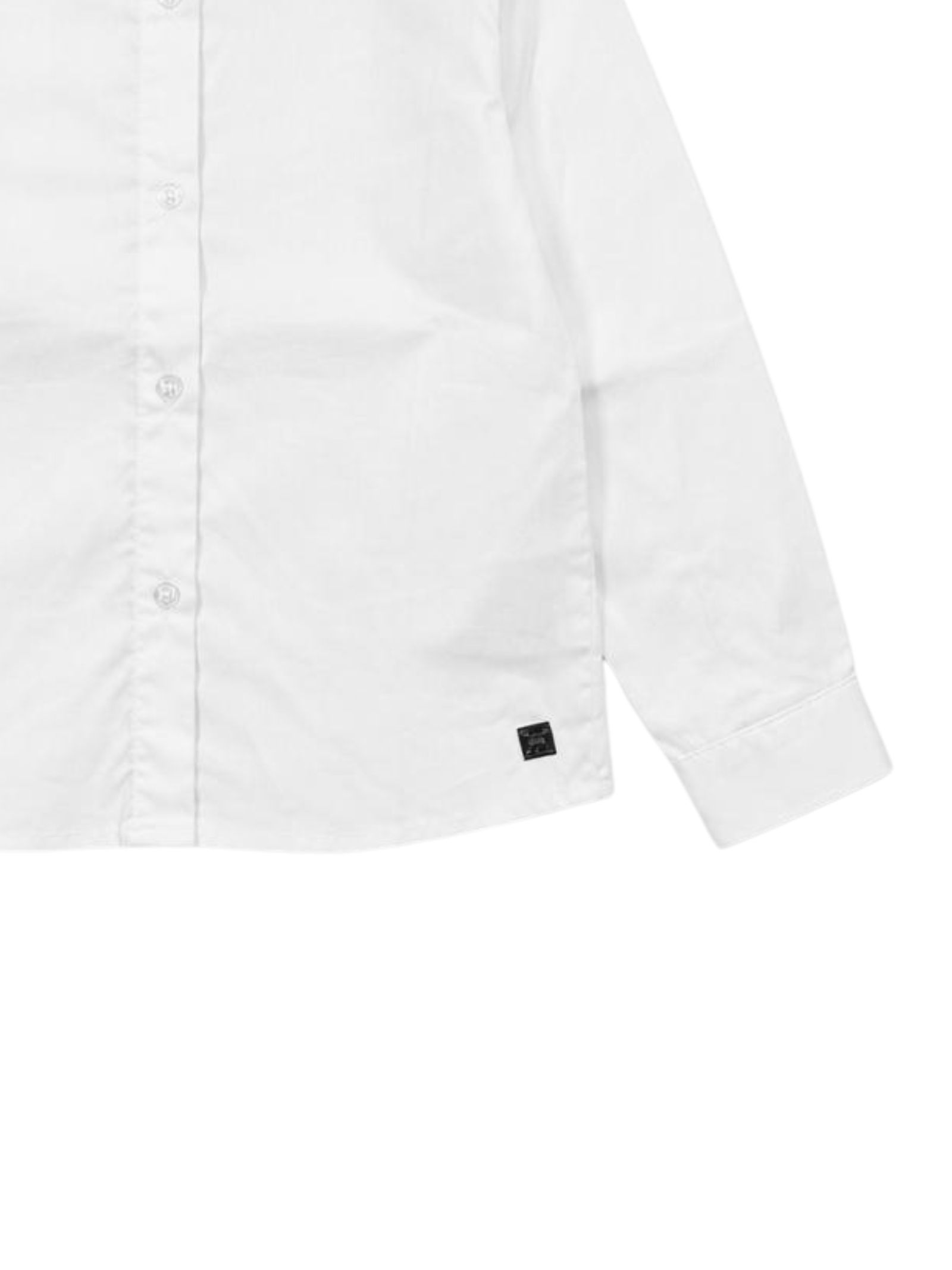 Manila Grace Kids camicia di colore bianco, colletto classico, maniche lunghe, applicazione logo in metallo, orlo curvo, vestibilità regolare. Composizione: 65% Cotone 32% nylon 3% elastan