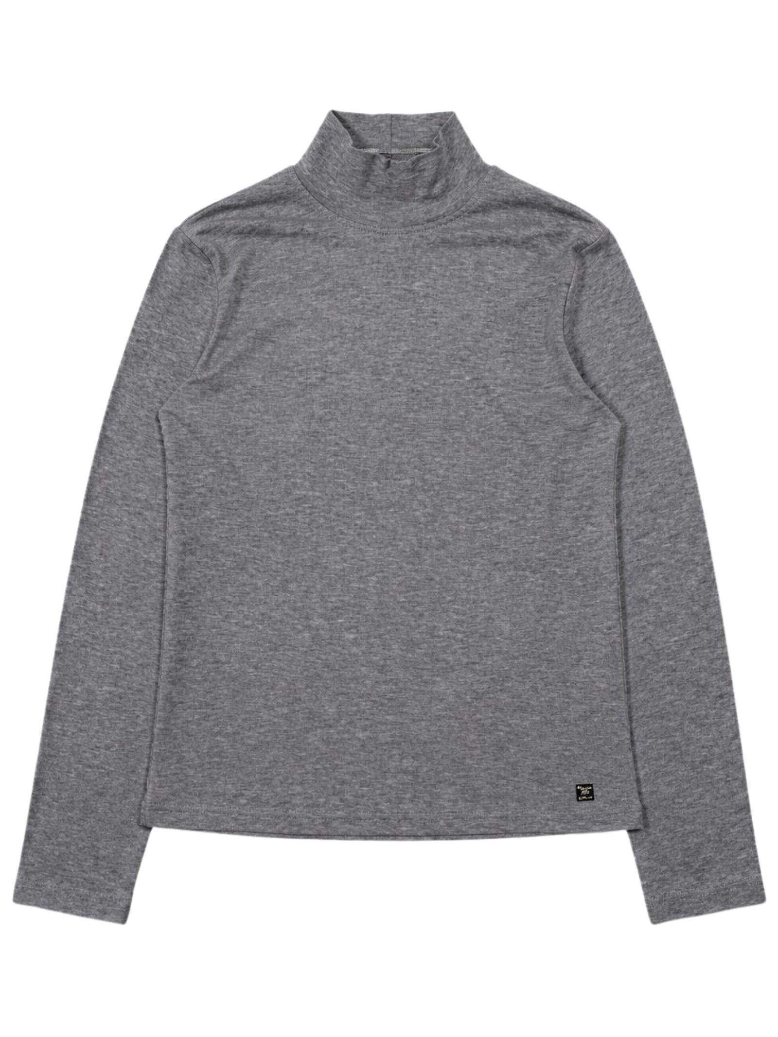 Manila Grace Kids dolcevita di colore grigio, modello girocollo, maniche lunghe, applicazione logo in metallo, design aderente. Composizione: 79% tencel 17% lana 4% elastan