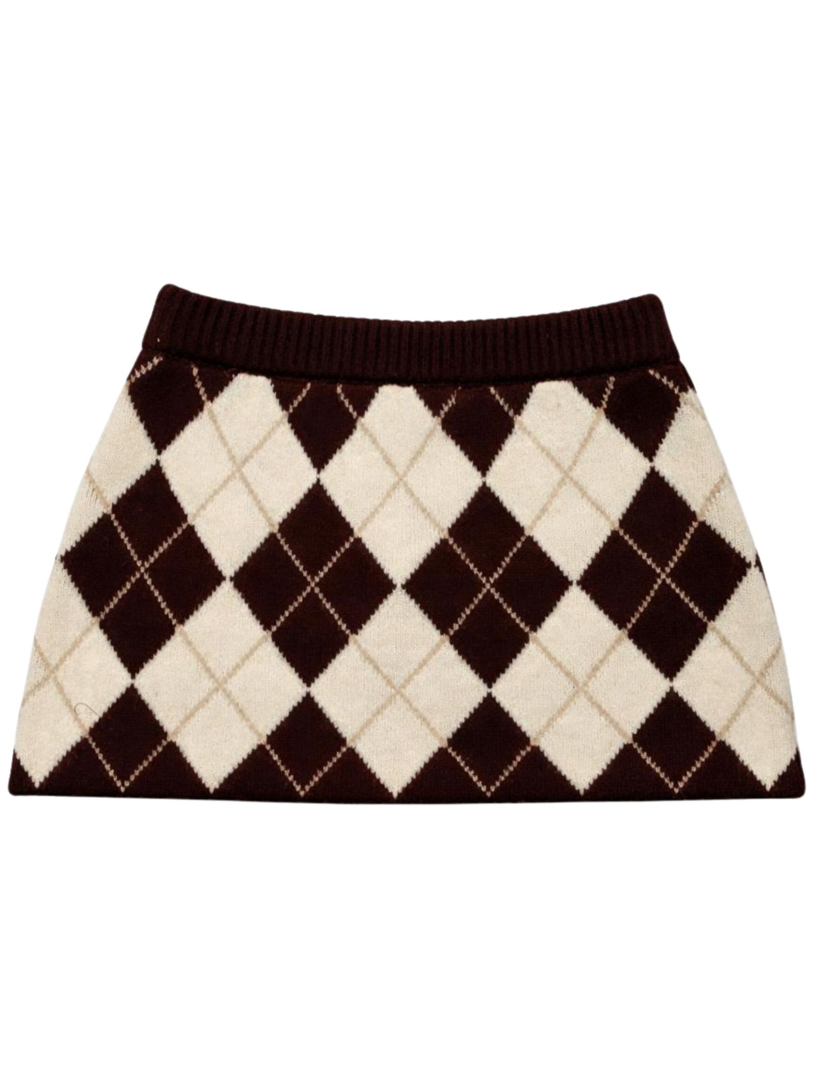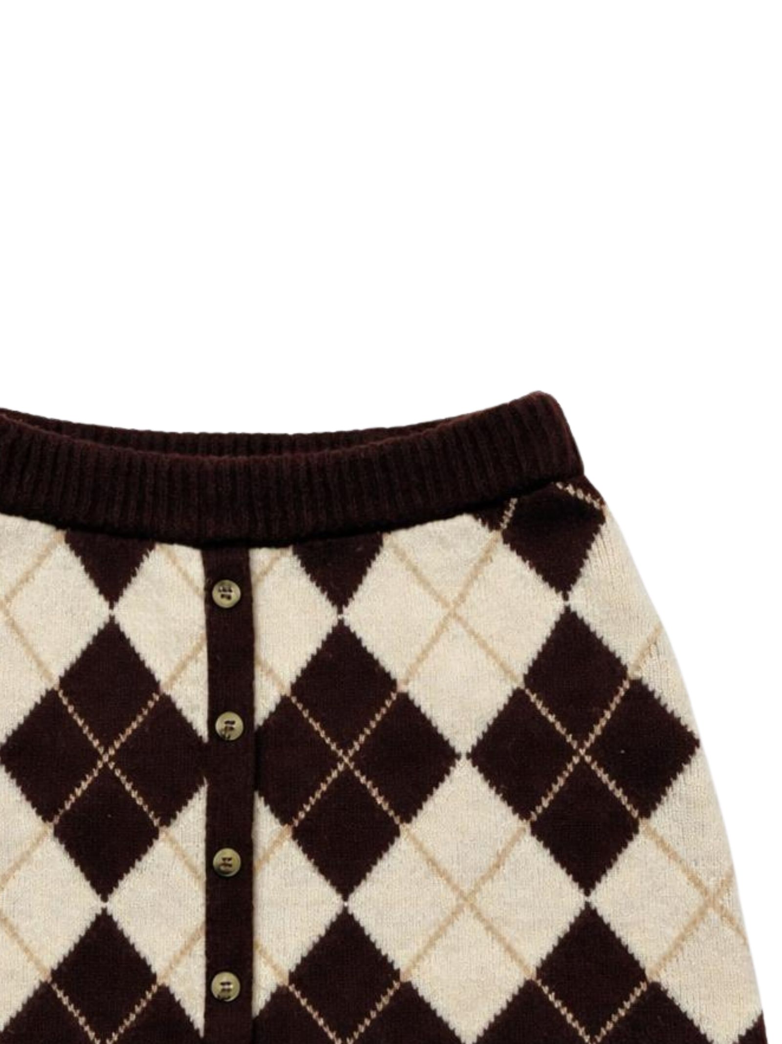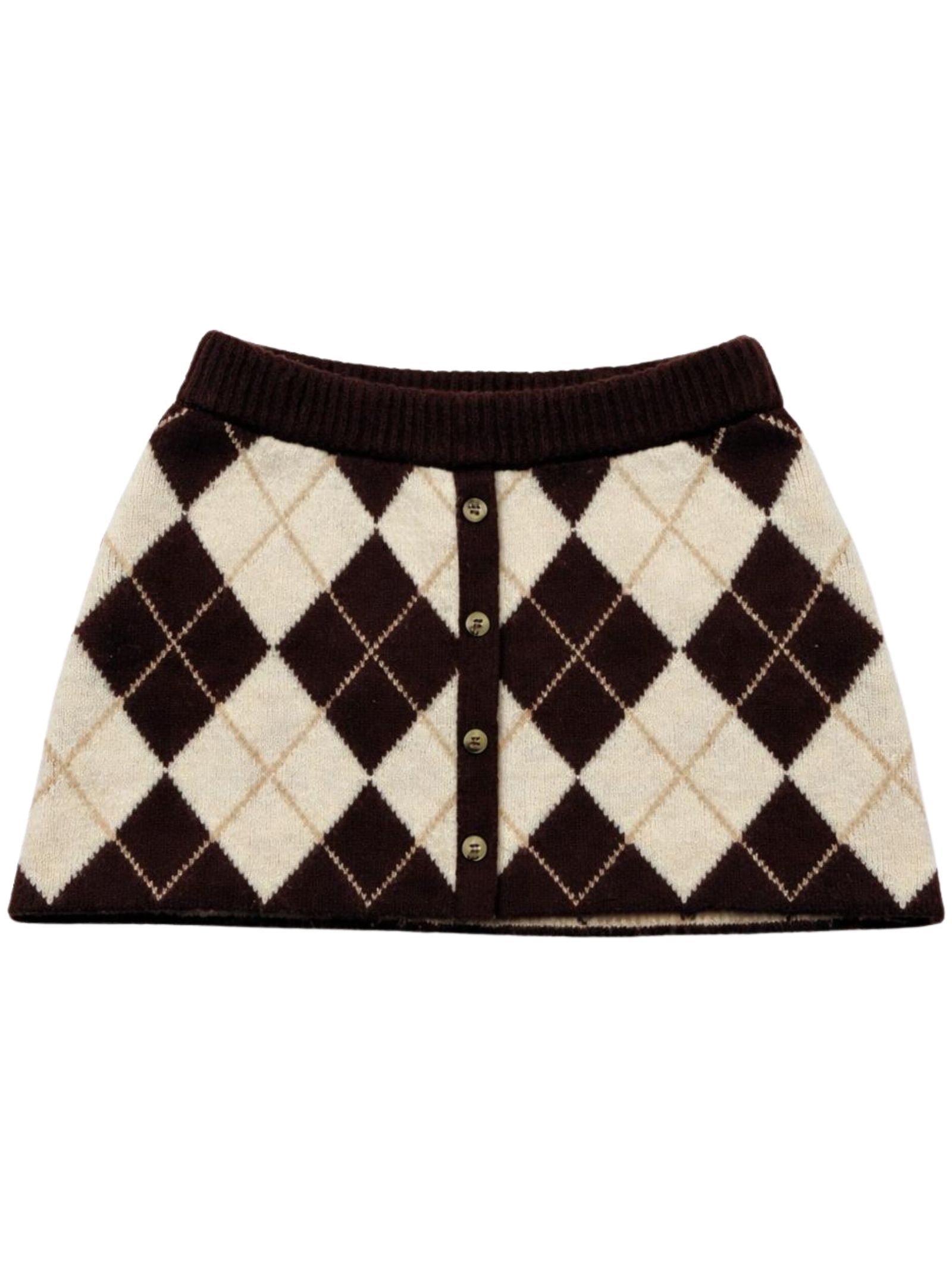 Manila Grace Kids gonna di colore marrone/beige in fantasia a rombi, realizzata a maglia, vita regolare con elastico, dettaglio bottoni frontali finti, design svasato. Composizione: 50% Acrilica 40% nylon 5% lana 5% elastan