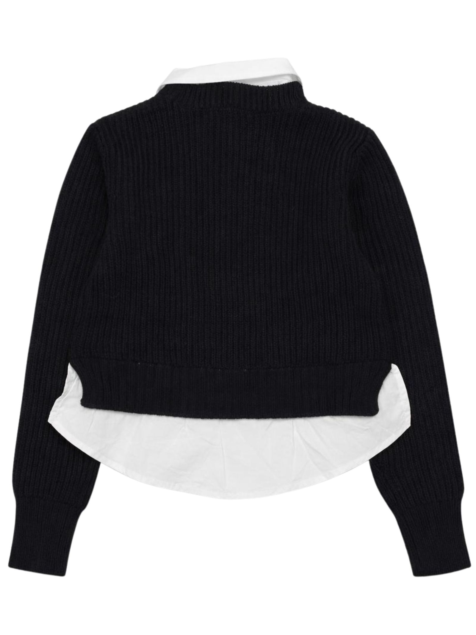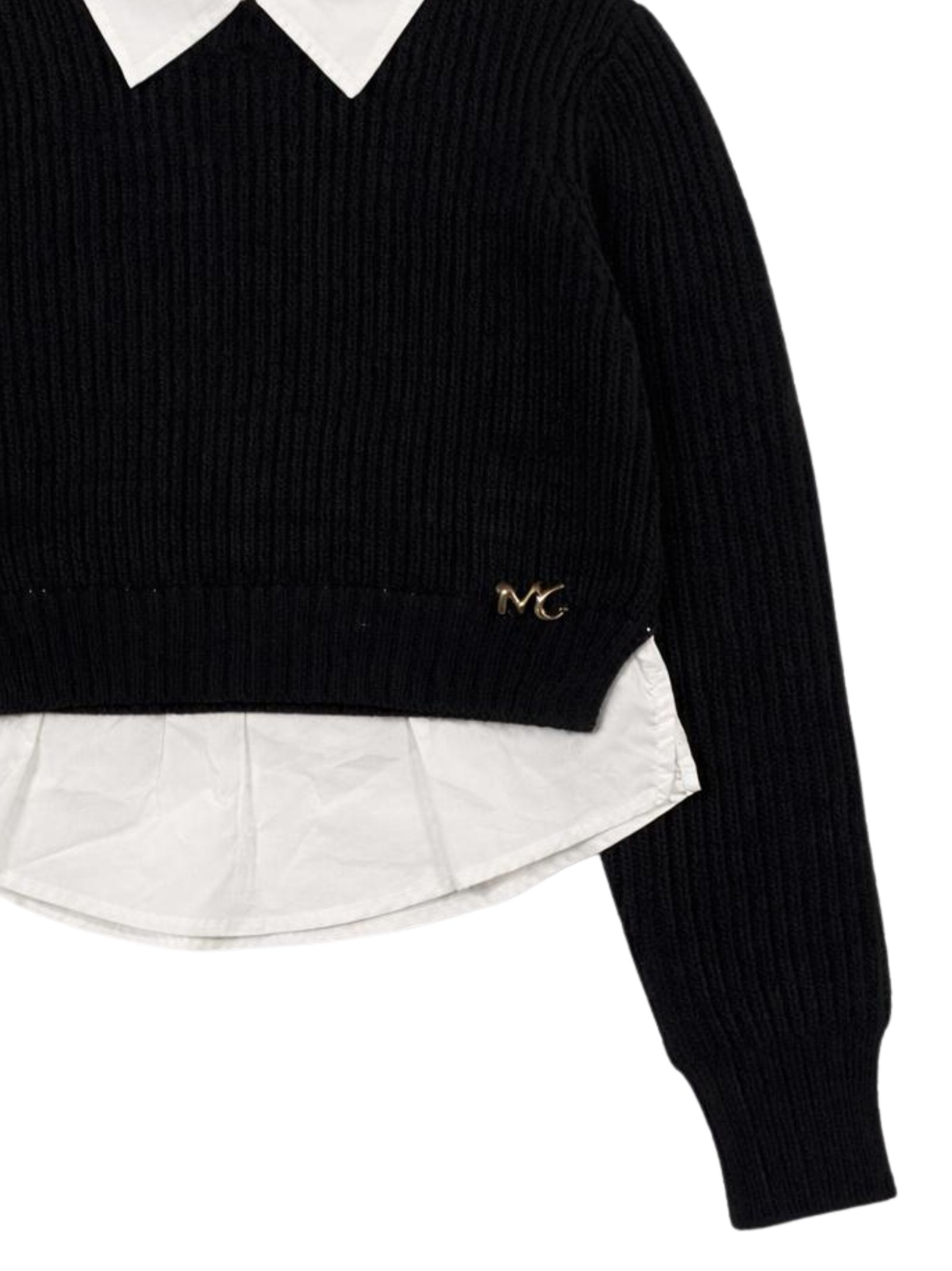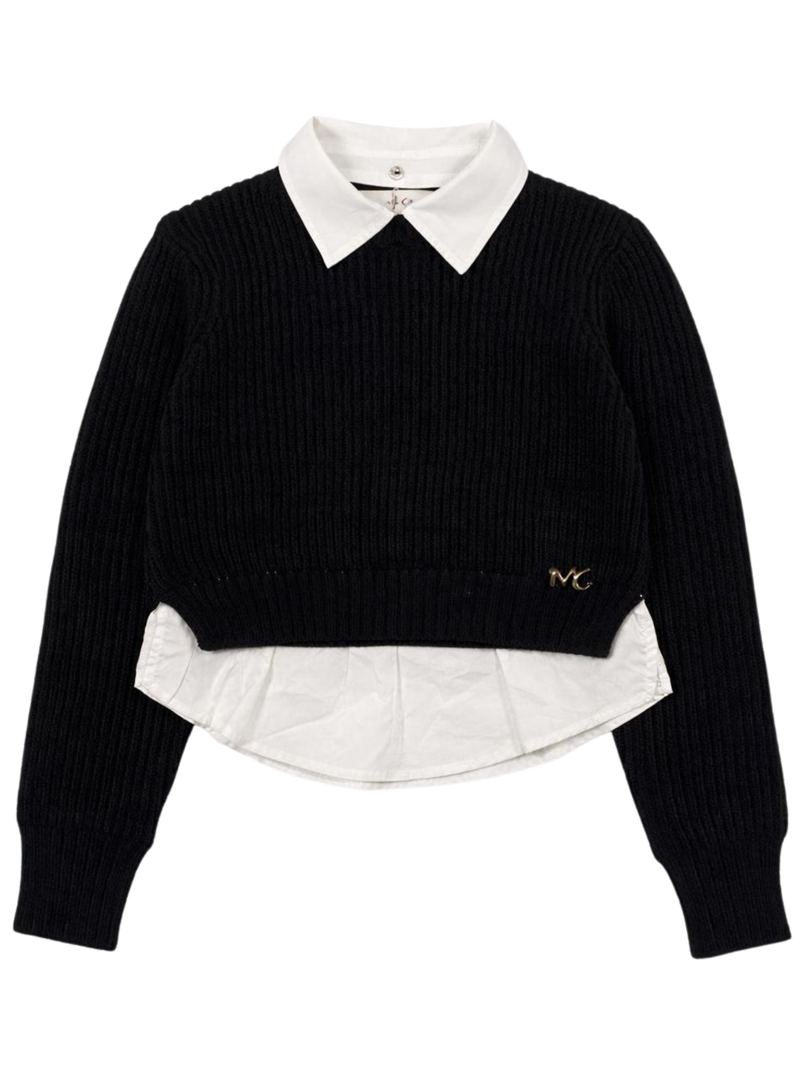 Manila Grace Kids maglione di colore nero, modello maniche lunghe, dettaglio fondo e colletto a camicia, applicazione logo, design corto. Composizione: 80% acrilica 20% lana