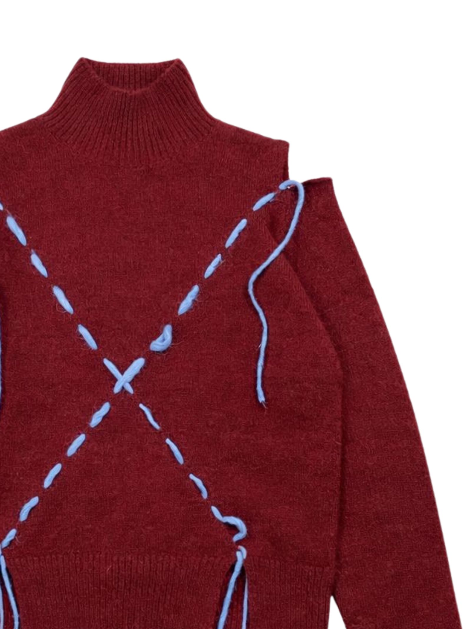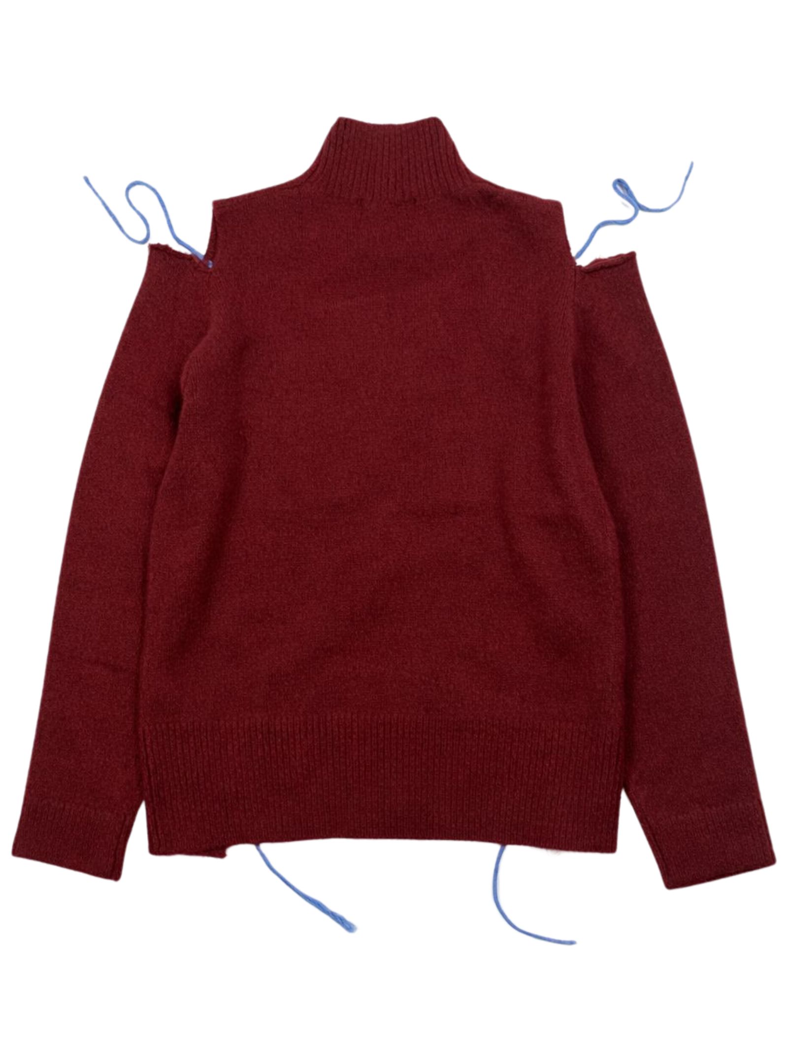 Manila Grace Kids maglia di colore bordeau, dettagli a contrasto azzurro, modello con collo rialzato, maniche lunghe con dettaglio cut-out sulla spalla, orli a costine, vestibilità regolare. Composizione: 54% Poliestere 38% acrilica 5% lana 3% elastan