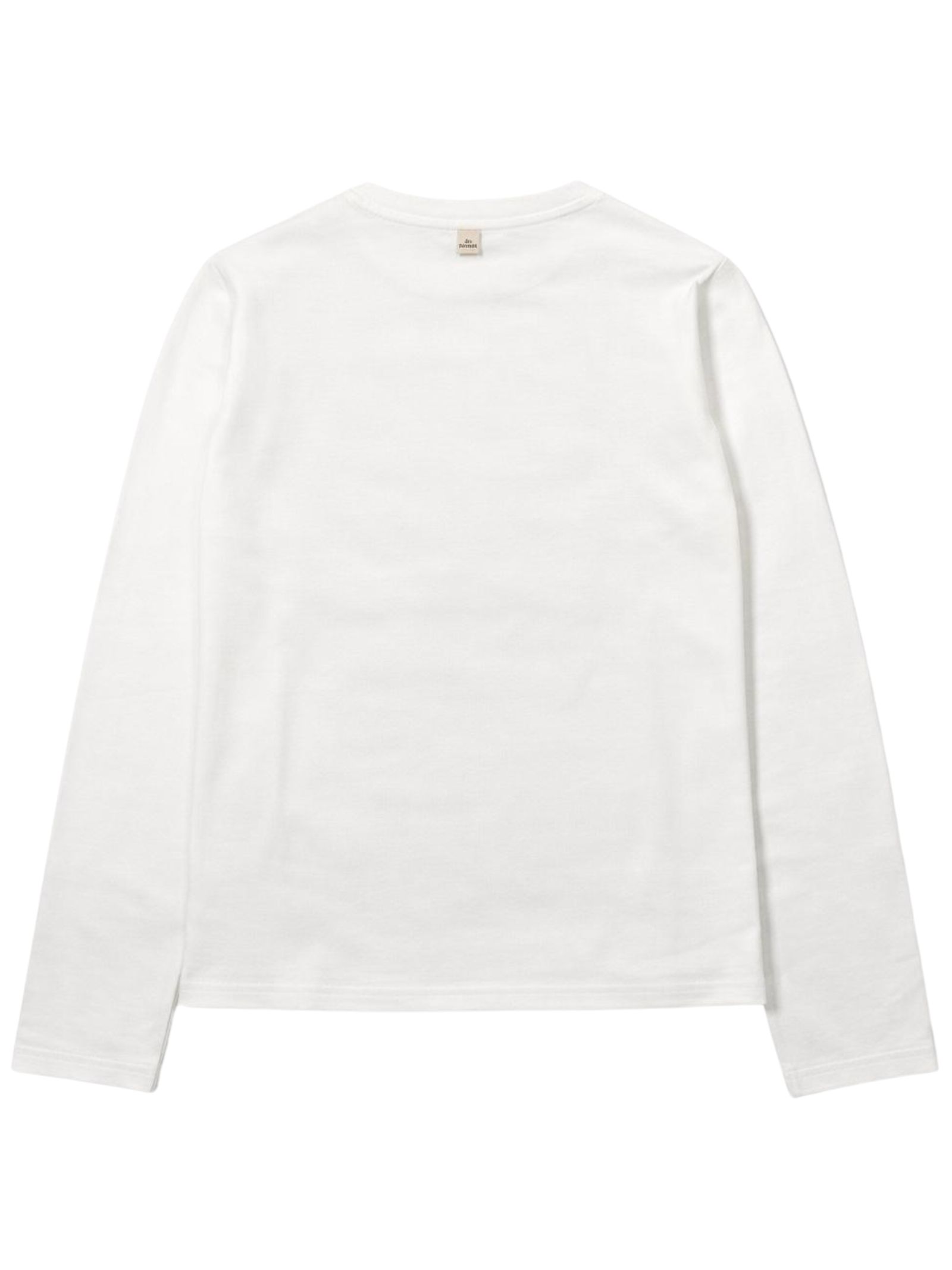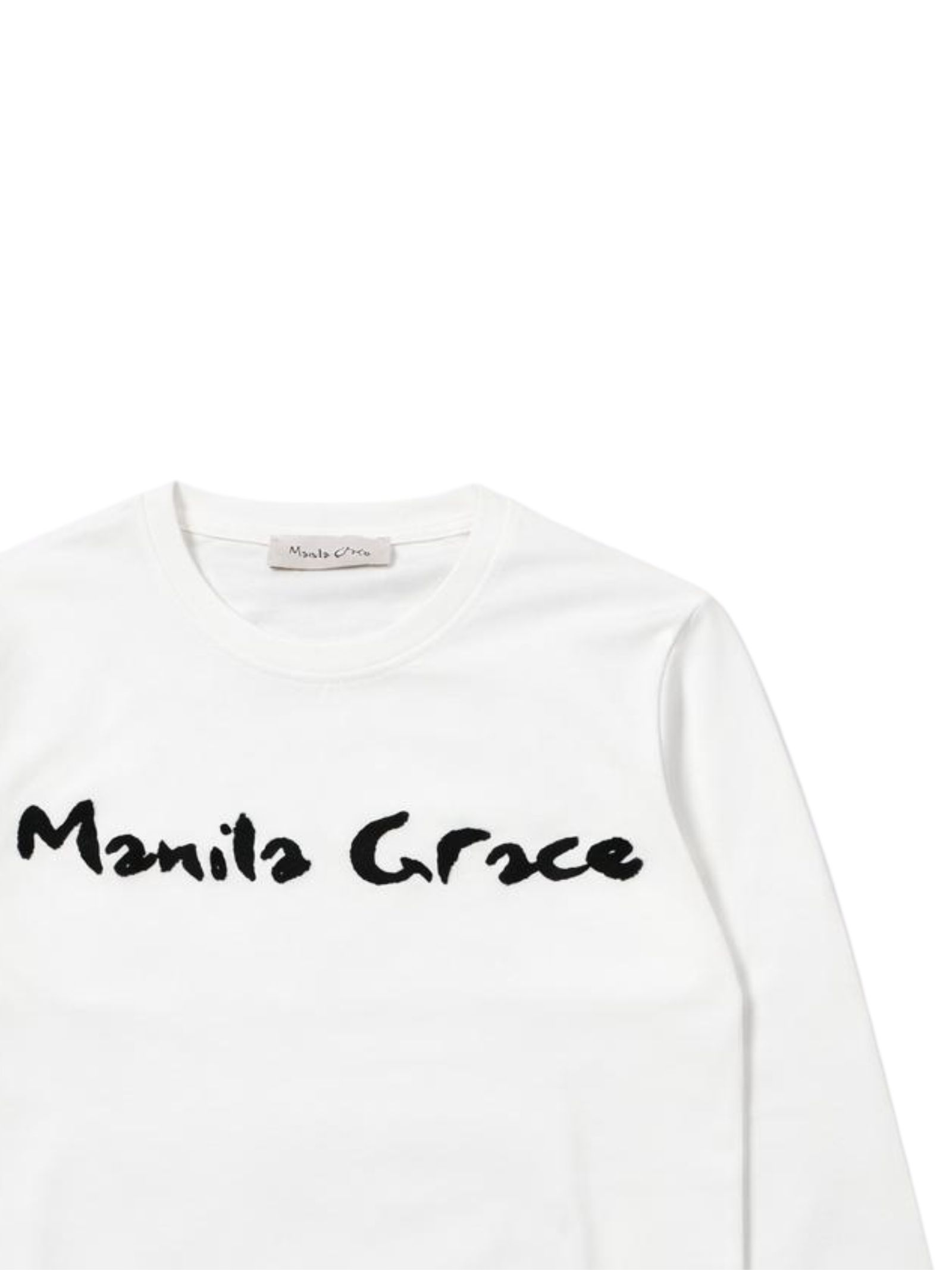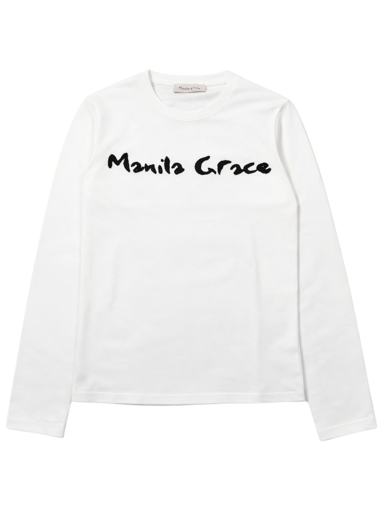 Manila Grace Kids t-shirt di colore panna, modello girocollo, maniche lunghe, ricamo logo centrale a contrasto nero, vestibilità regolare. Composizione: 94% cotone 6% elastan